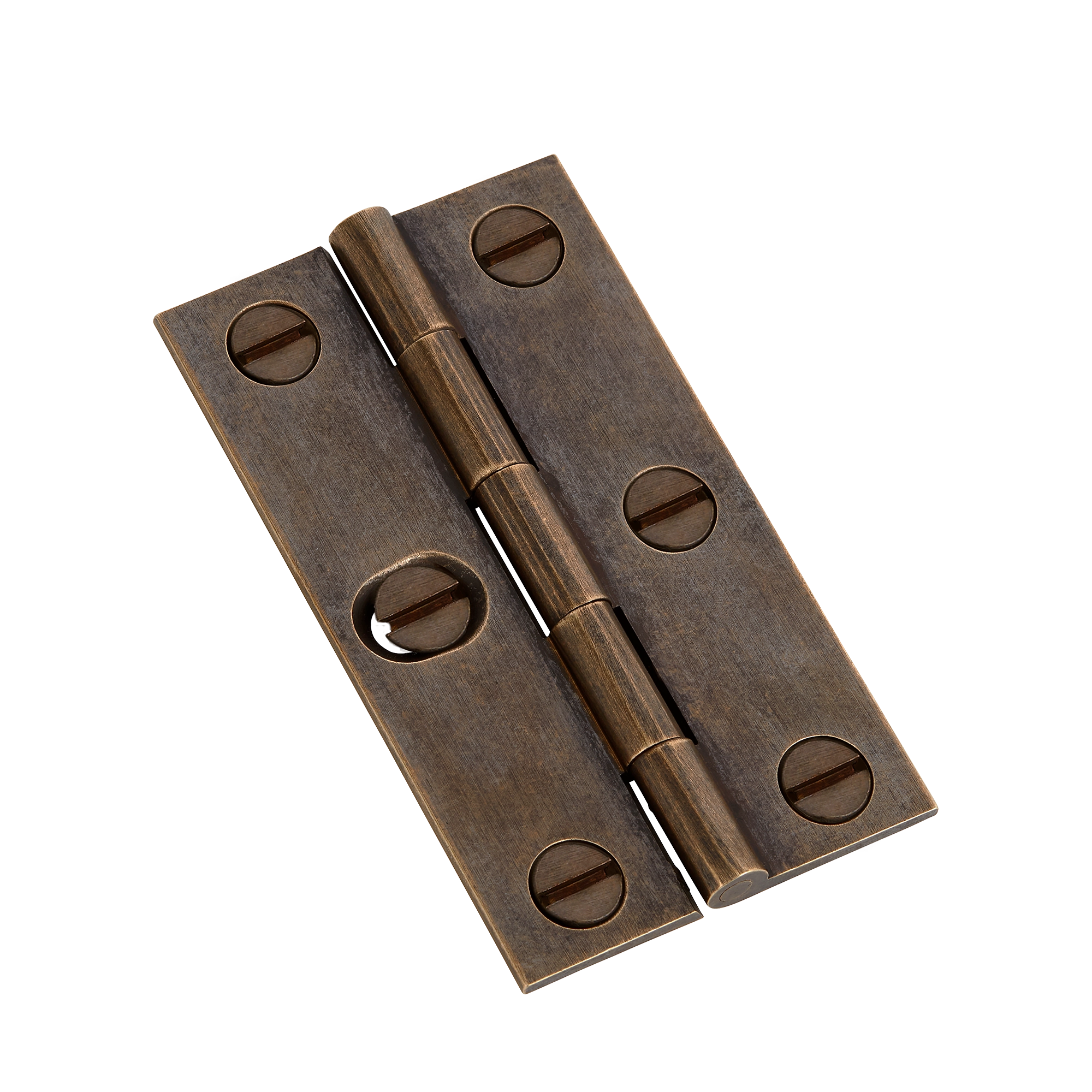 This is a pair of butt hinges designed for doors, cabinets, cupboards, and chests. Made of metal, likely a brass or bronze alloy, it comes in different finishes like polished and antiqued. The hinge features an oval hole for alignment adjustment, ensuring a perfect fit for the connected components.