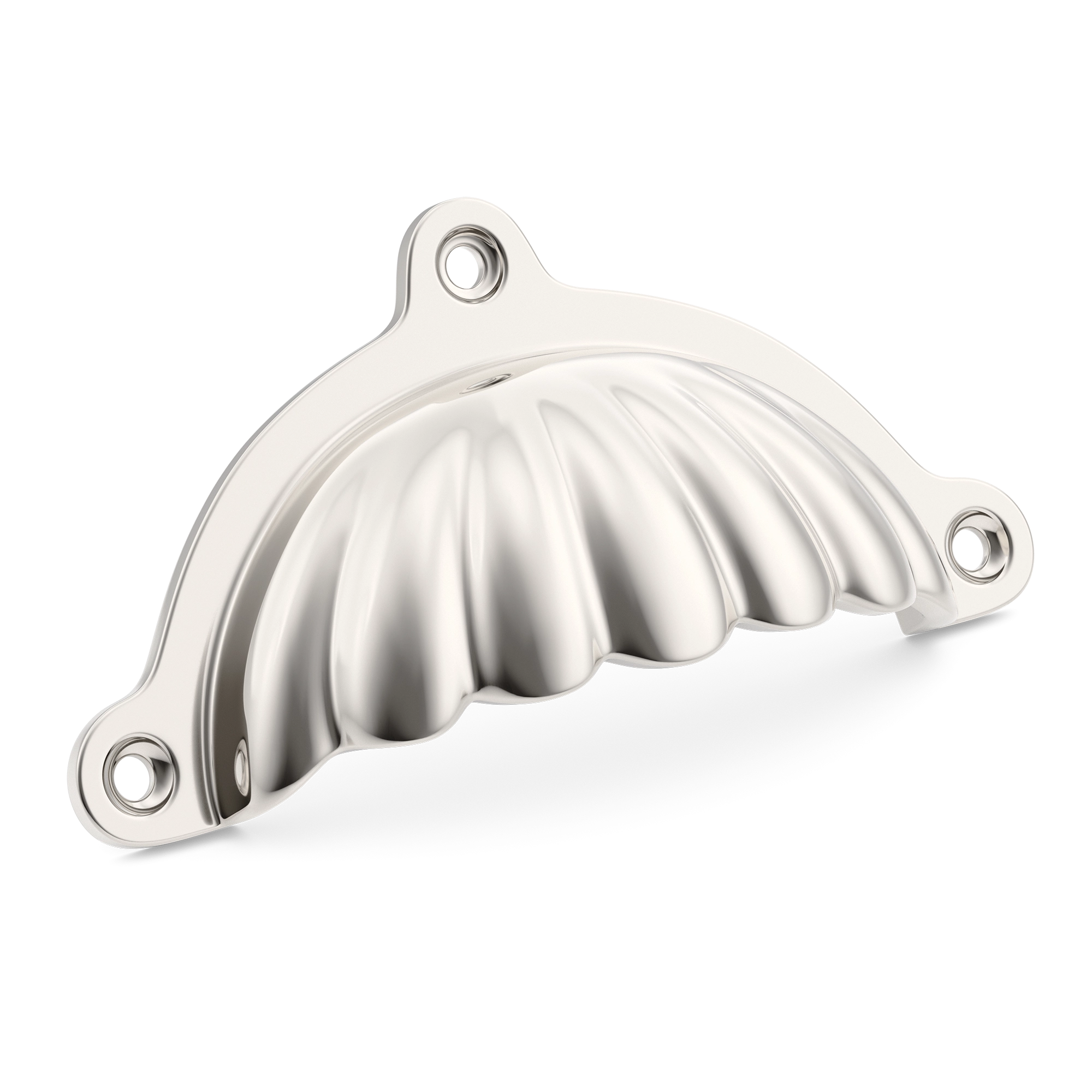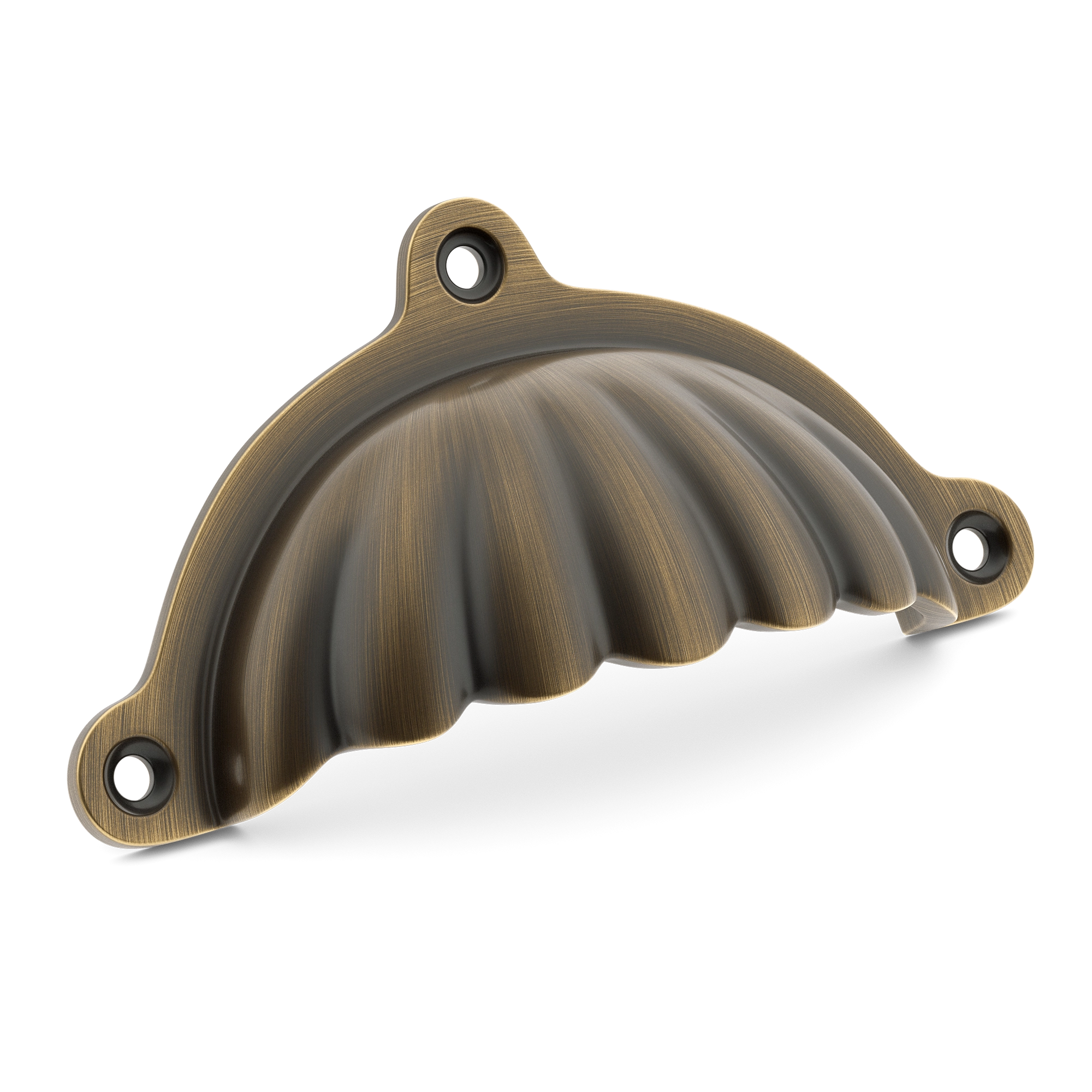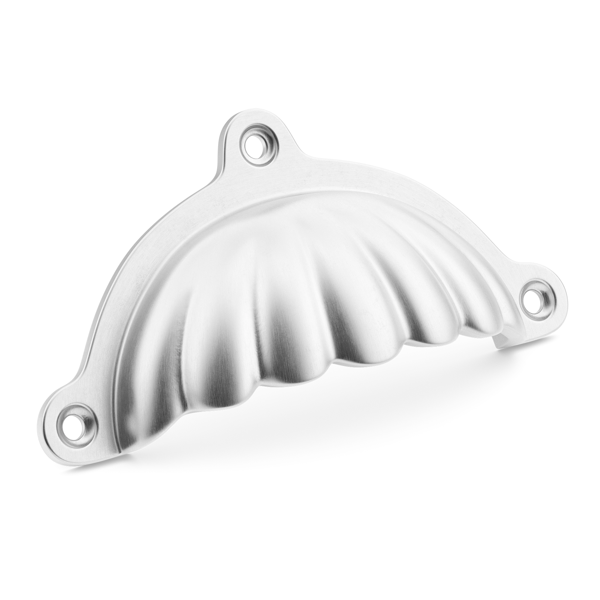 This is a decorative scalloped fluted metal drawer pull. It has a semi – circular, ornate design with a scalloped front and three mounting holes for secure attachment. Made of high – quality metal, it comes in various finishes, making it a great addition to coastal or vintage – style homes.