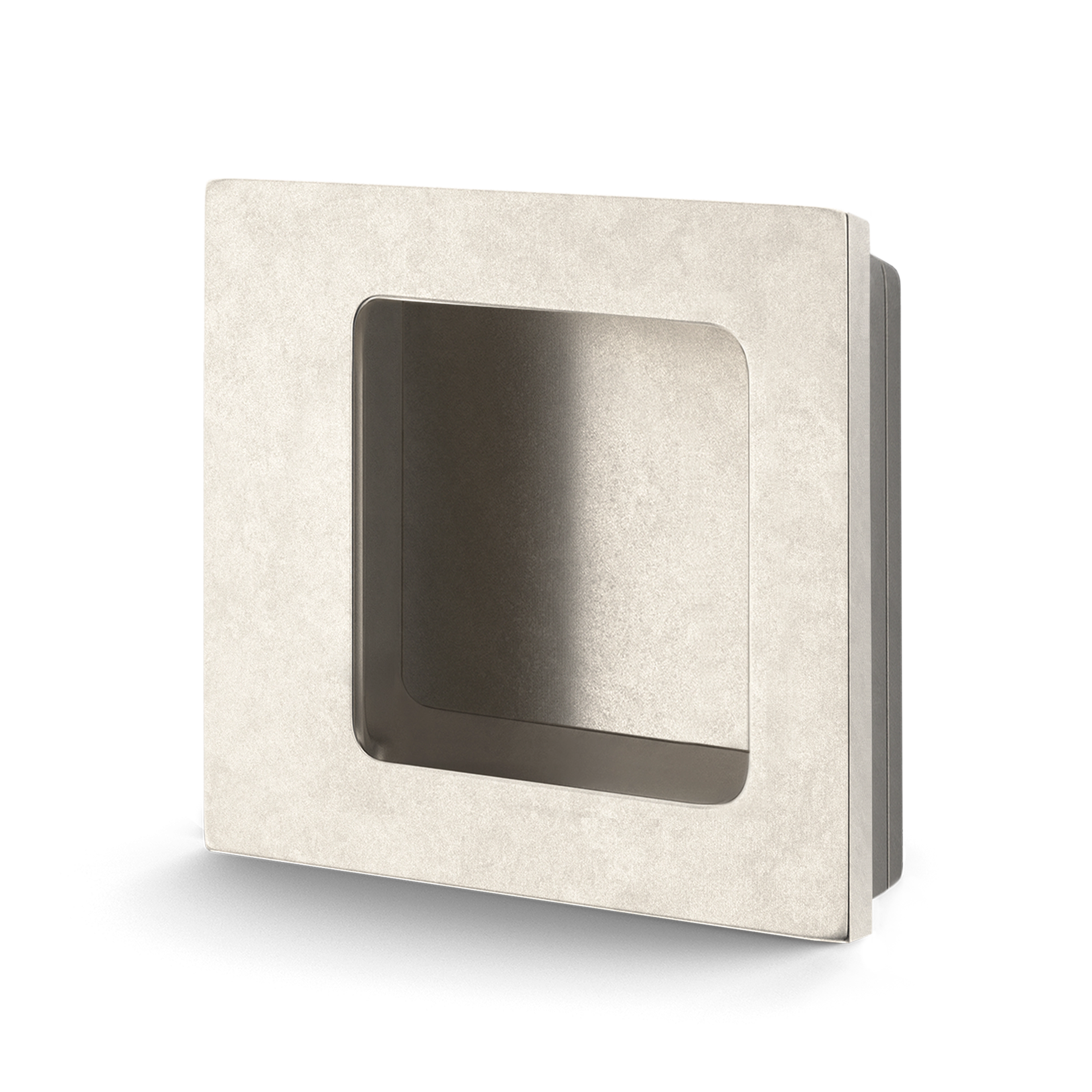 This minimalist textured square sliding door flush pull is an elegant addition to sliding and pocket doors. Crafted from a durable metallic alloy, it features a sleek design with a central recessed cutout and a textured outer finish. The pull is designed to sit either proud or flush, eliminating the need for fixings.