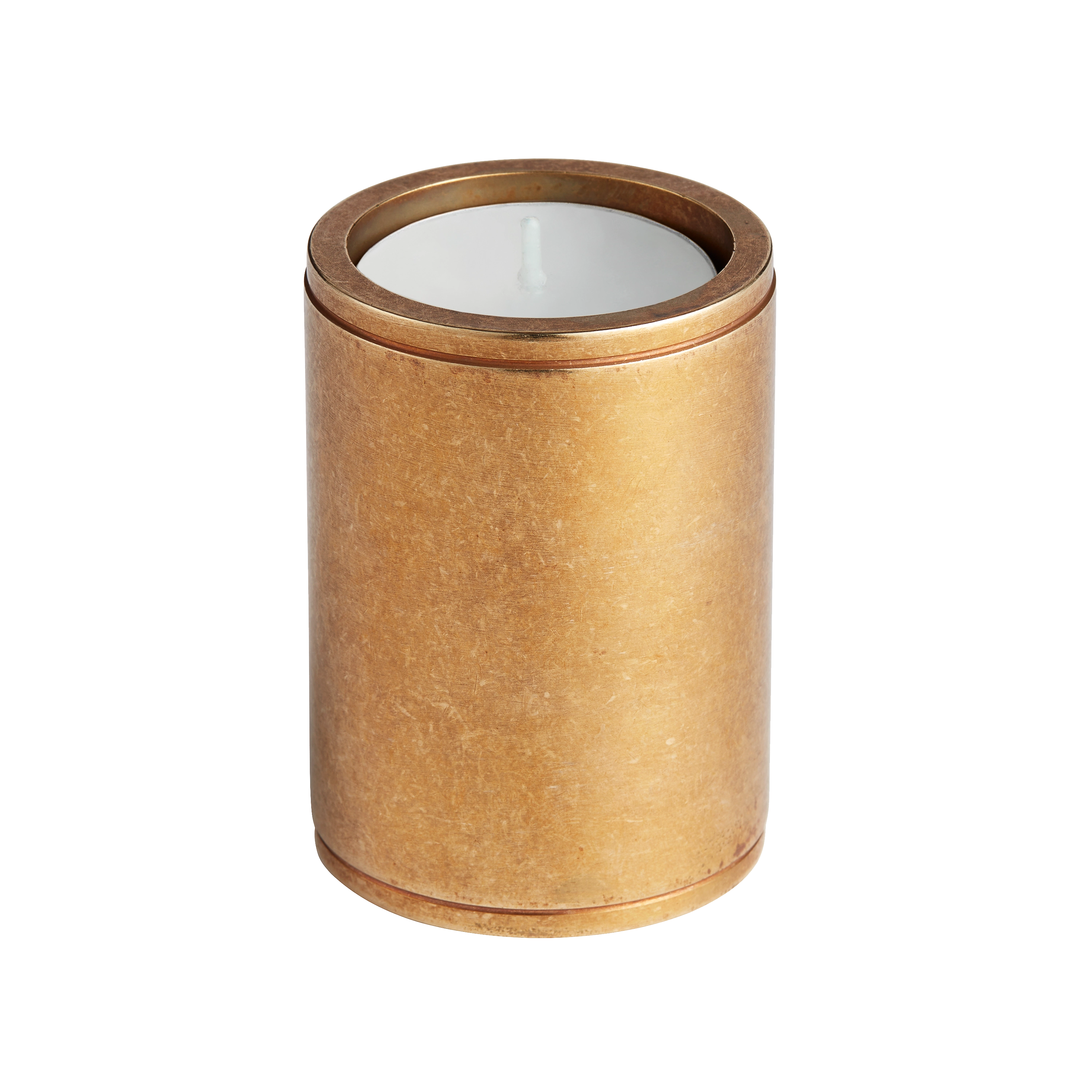 This tealight holder is a charming decorative piece crafted from solid brass. With its minimalist cylindrical shape and metallic rings at the top and bottom, it exudes an elegant and timeless appeal. Available in three distinct finishes, it can add a touch of warmth and sophistication to various indoor spaces, such as dining tables or mantels.