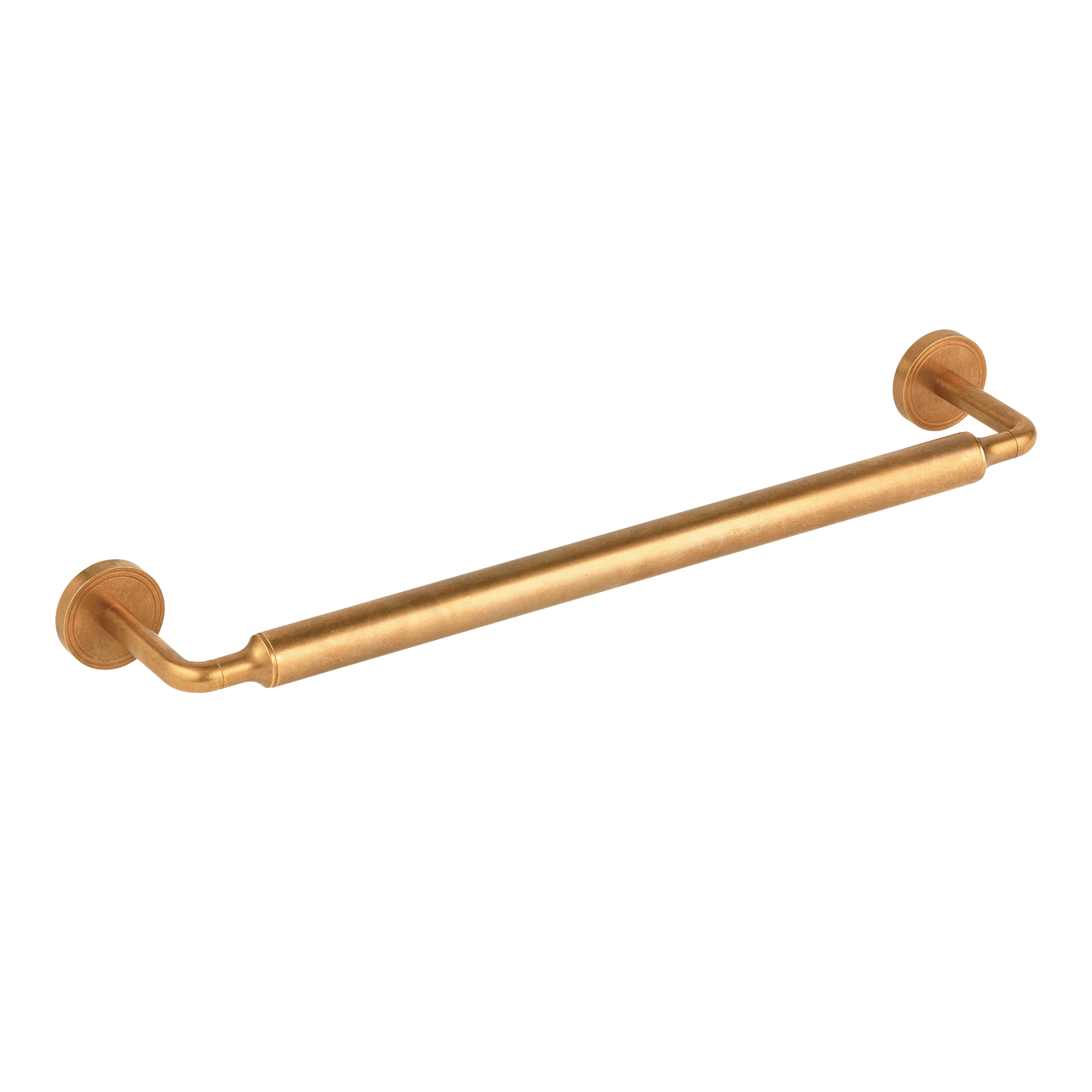 This towel rail is a stylish addition to any bathroom. It features a smooth cylindrical bar and a classic oval backplate with subtle decorative linear grooves, offering a clean and contemporary look. Made of a metallic material with a warm, golden – brown finish, it combines functionality and aesthetics.