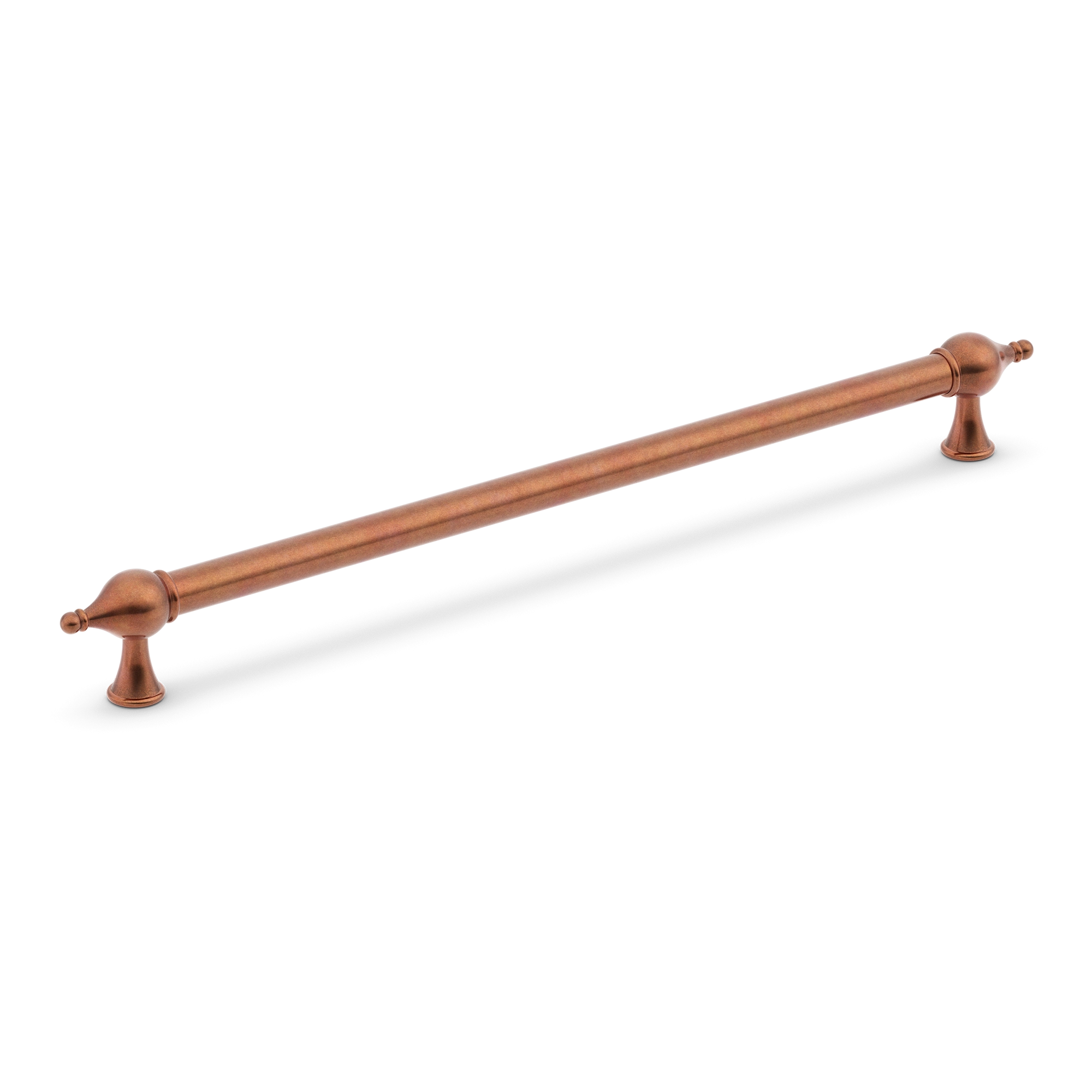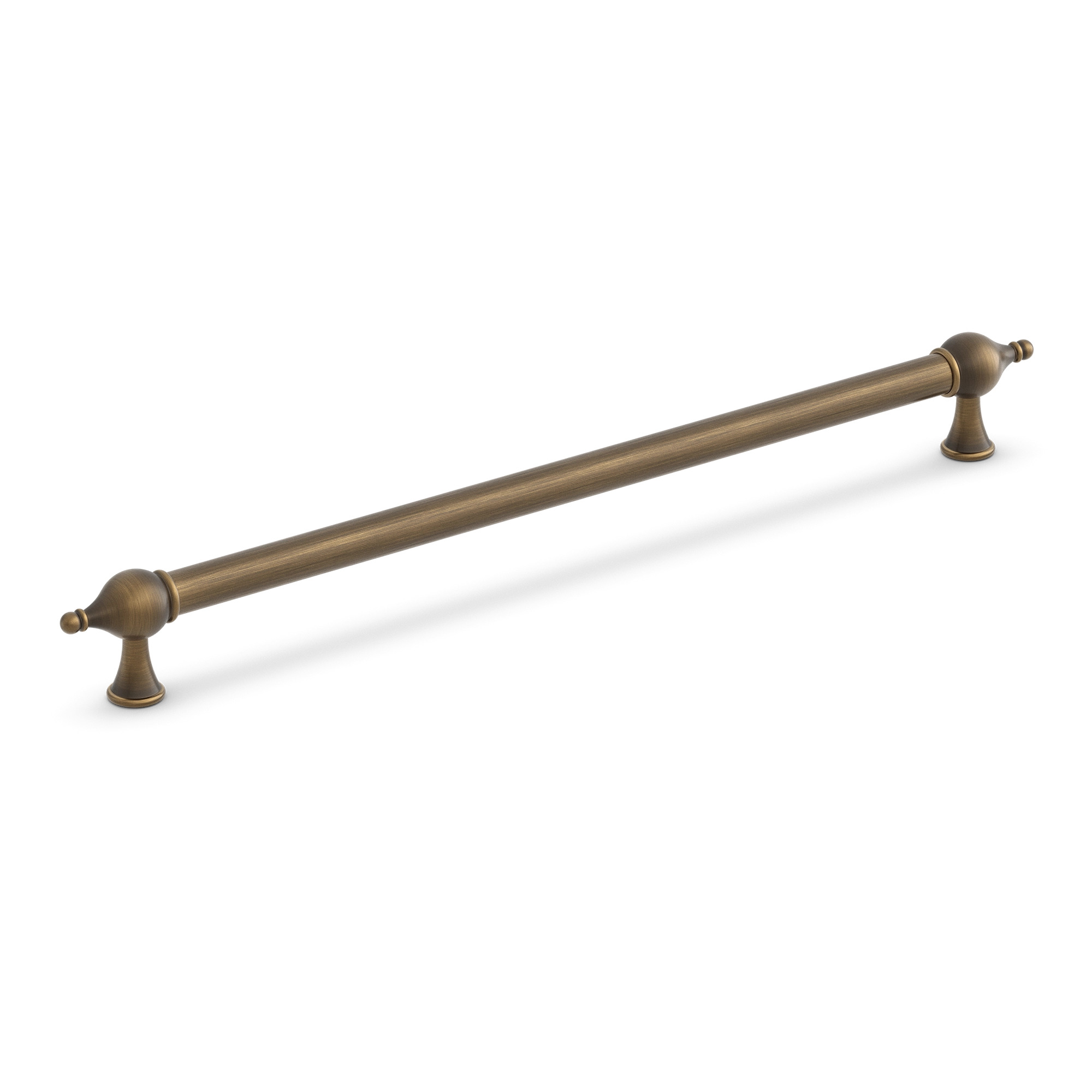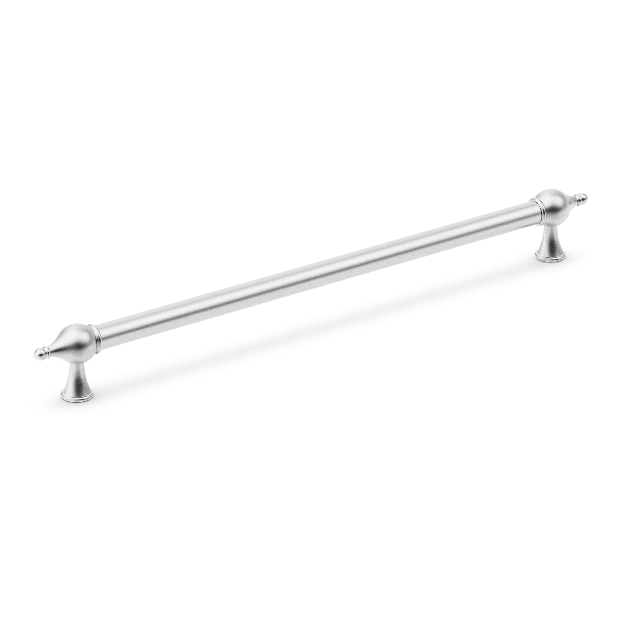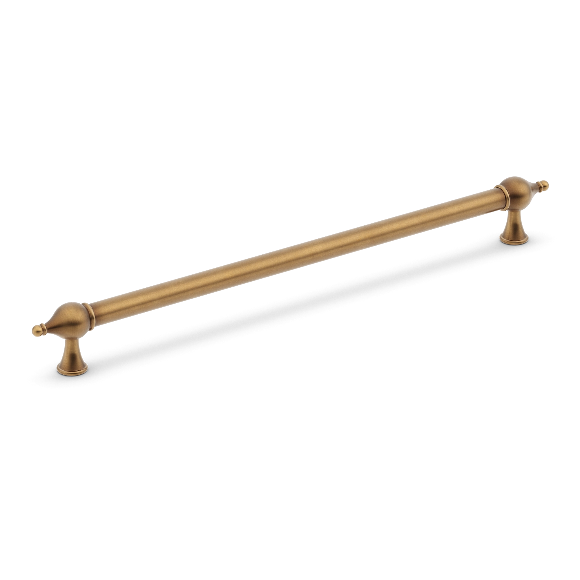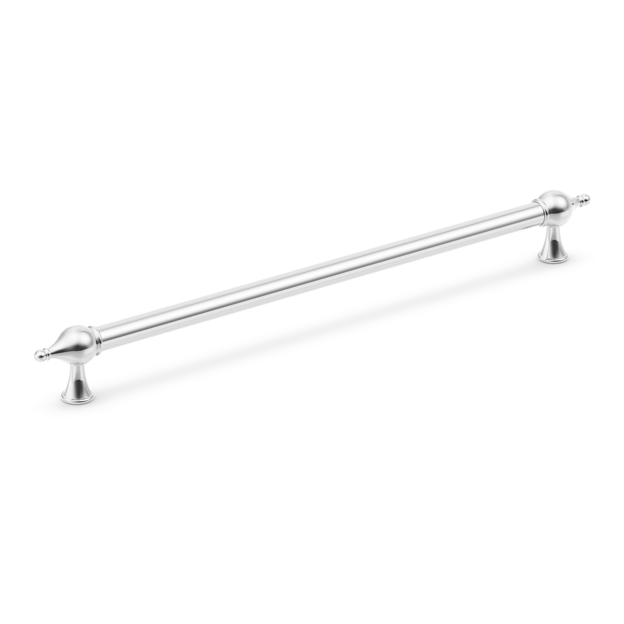 This cabinet/drawer pull handle is a large-sized bar pull made from metallic material, likely brass or steel with a coating. It features a smooth cylindrical central rod, ornate bulbous end caps, and flared footed bases. With multiple finish options, it can enhance the aesthetic of various cabinets, drawers, or doors.