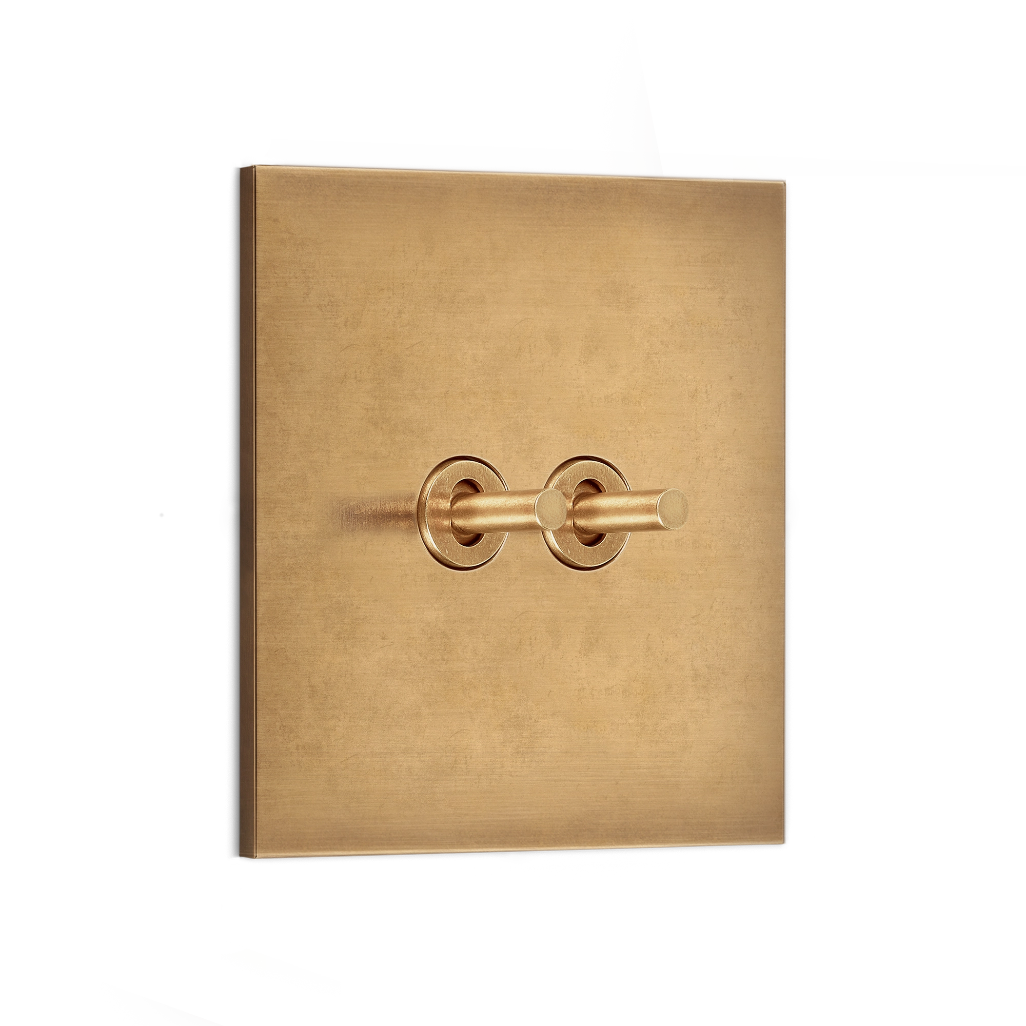 This double toggle wall switch plate is a high – quality addition to any space. It features a textured panel made of a metallic or metal – coated material, likely brass or a high – end alloy, with a subtle, aged finish. The two toggle switches have a solid metallic construction, matching the panel’s finish, and are designed to control electrical circuits like lighting on a wall.
