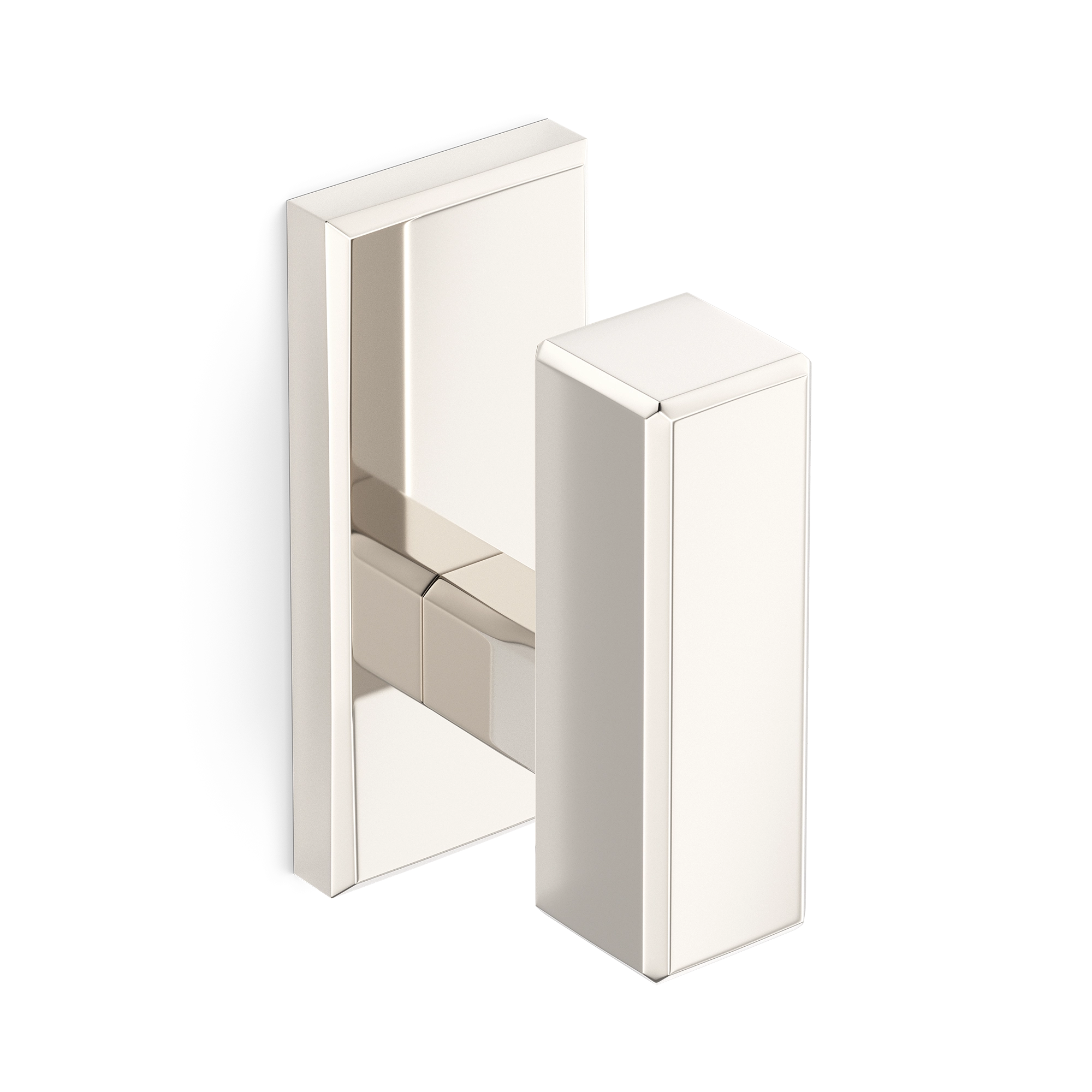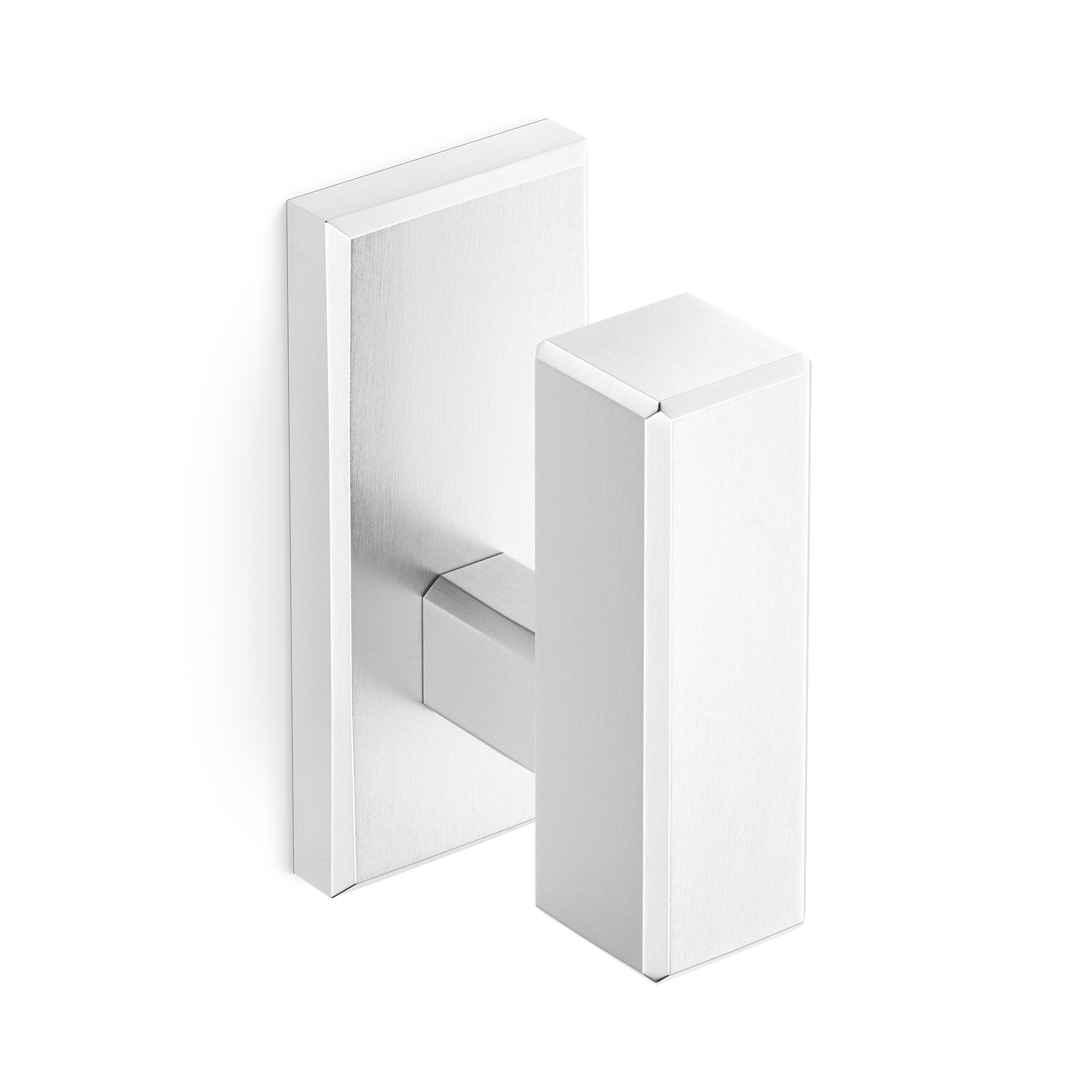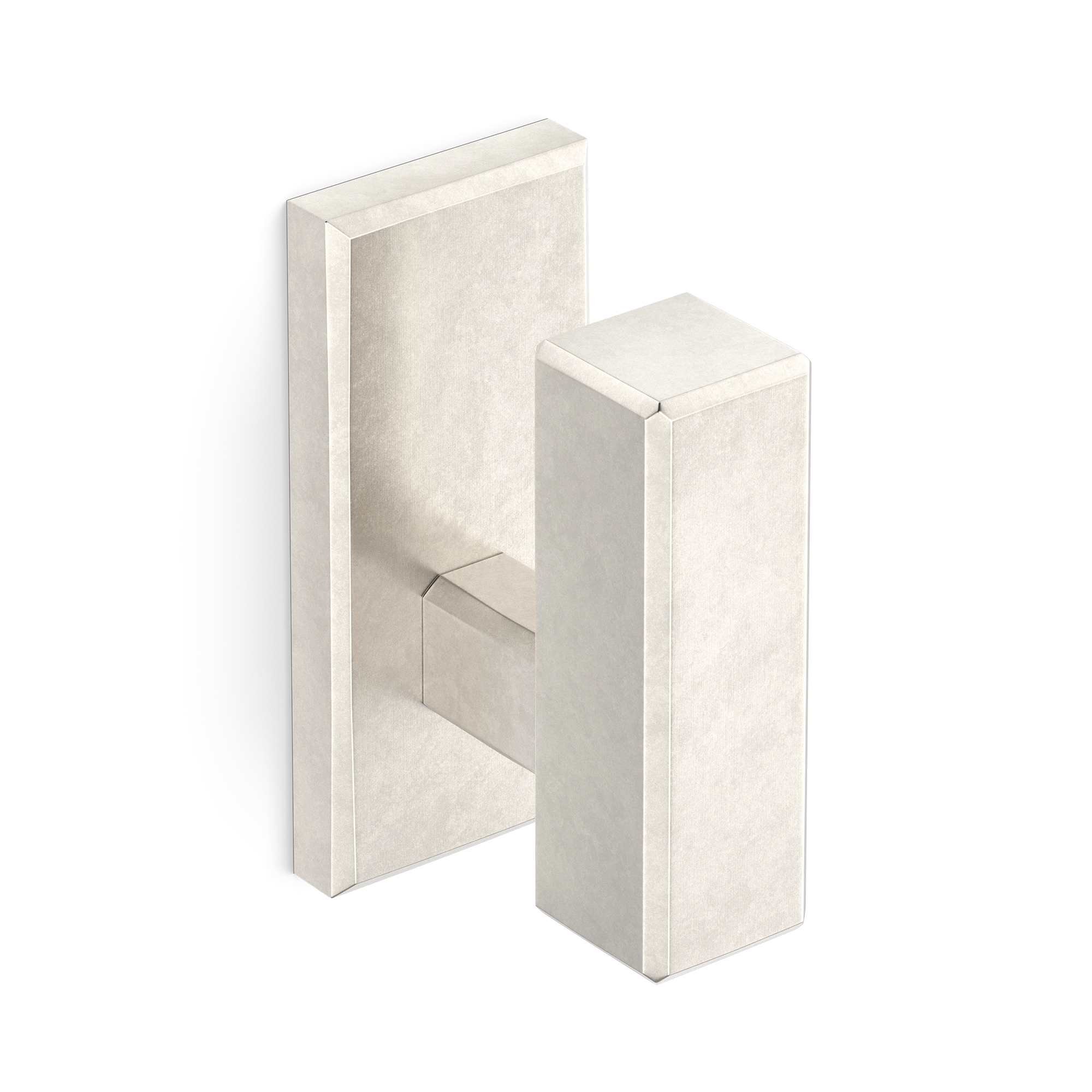 This wall-mounted hook is a geometric and minimalist design piece crafted from metal. Its flat rectangular base and vertical rectangular bar create a simple yet functional shape. The multiple color and finish options, paired with its clean edges, make it suitable for adding both practical storage and a touch of luxury to various spaces.