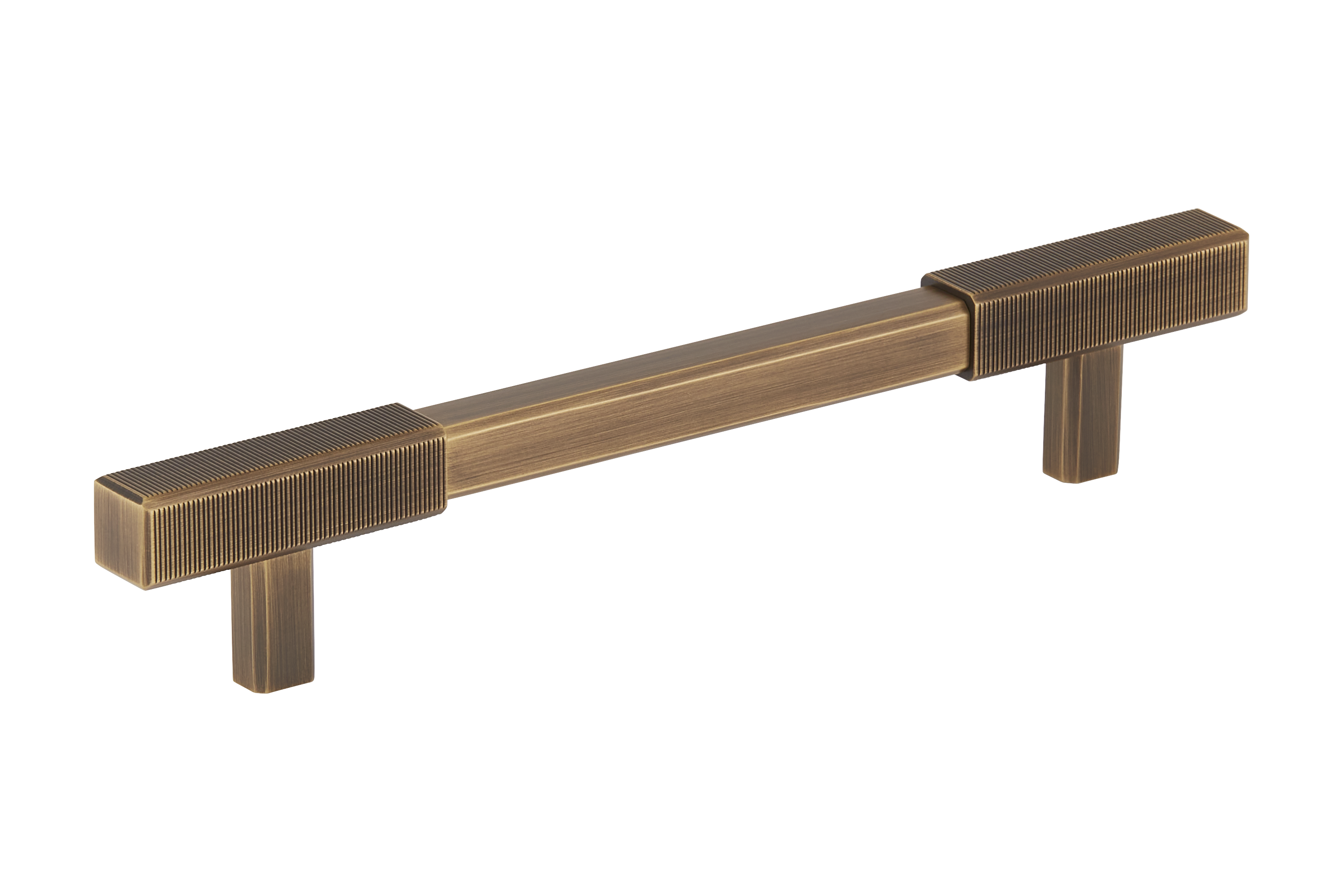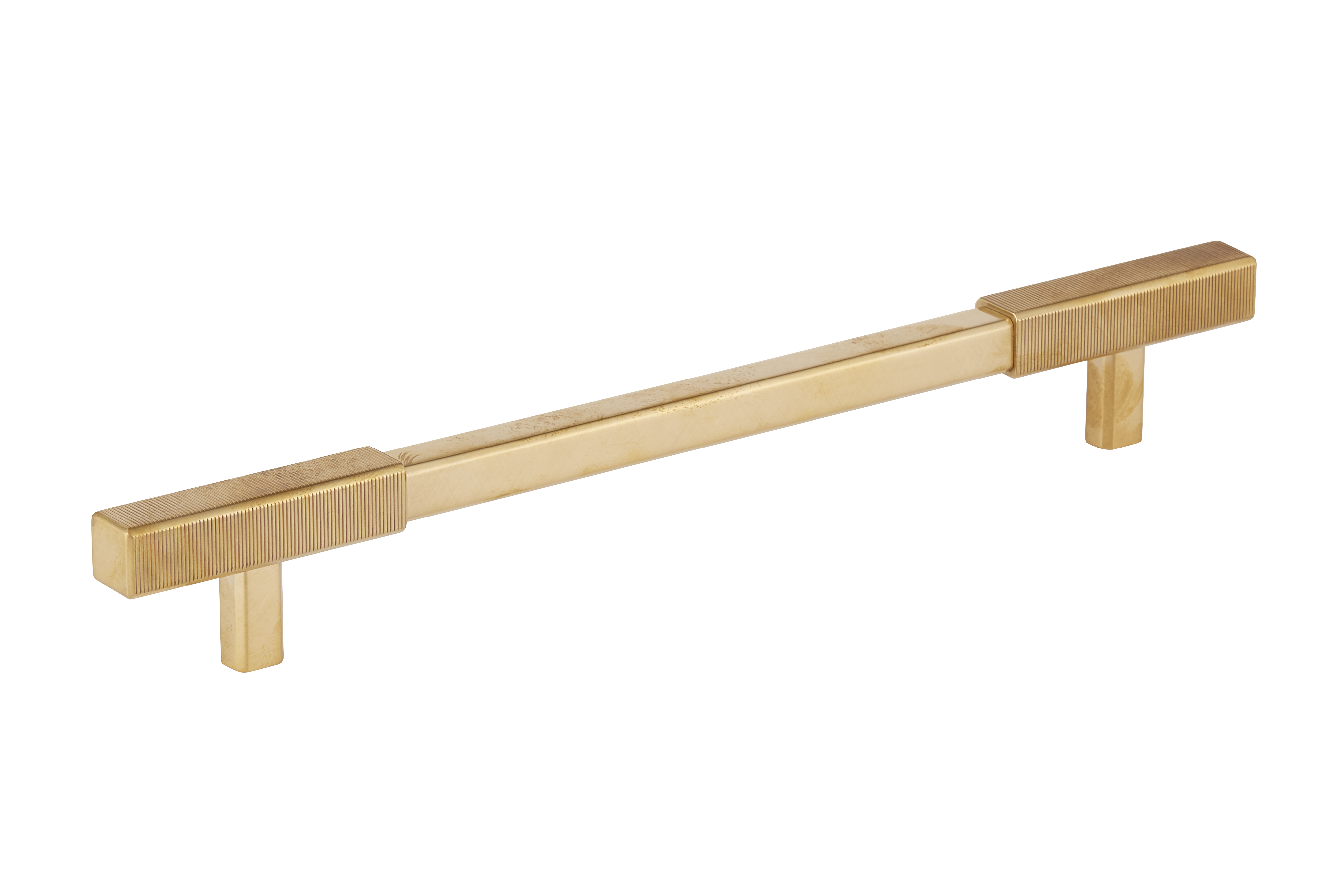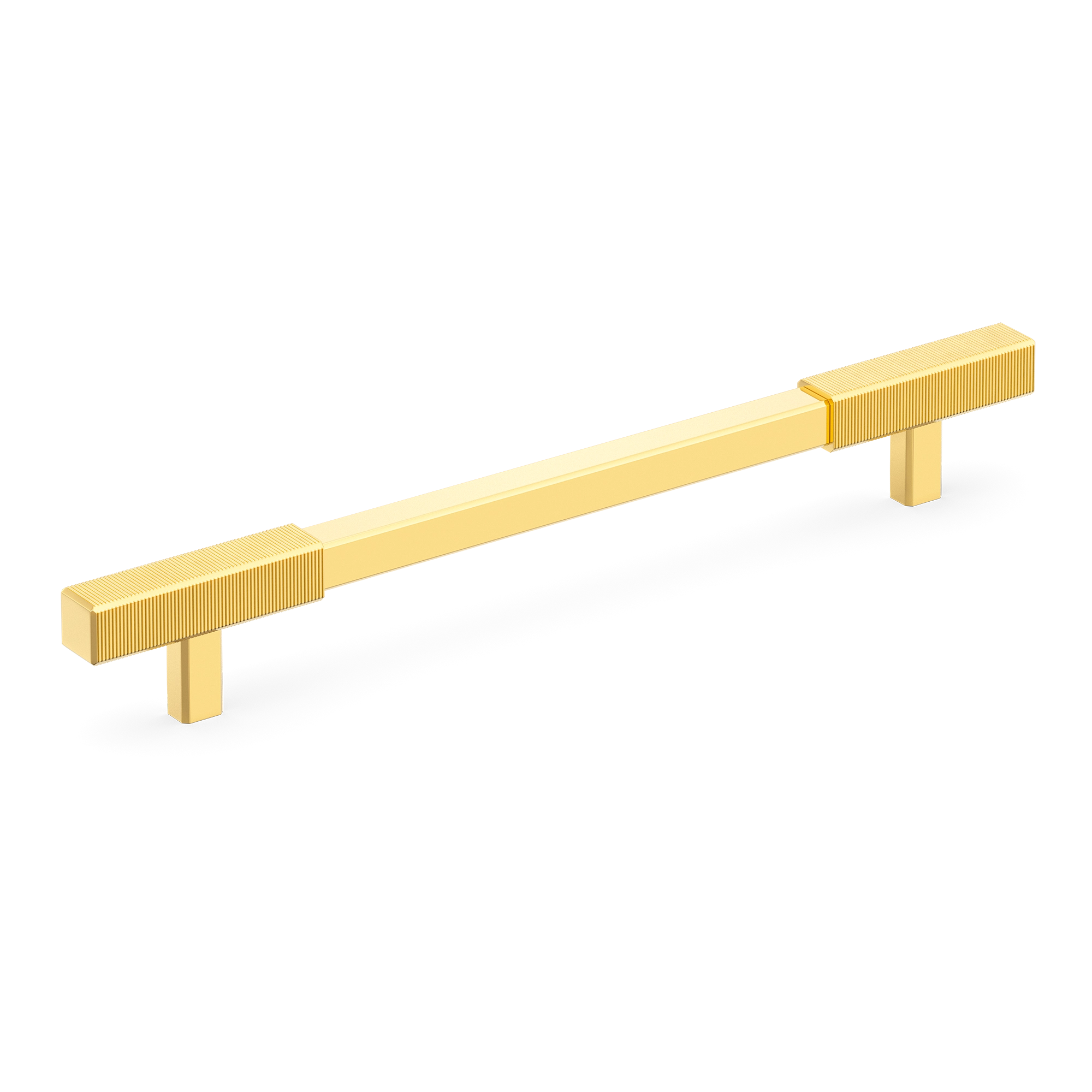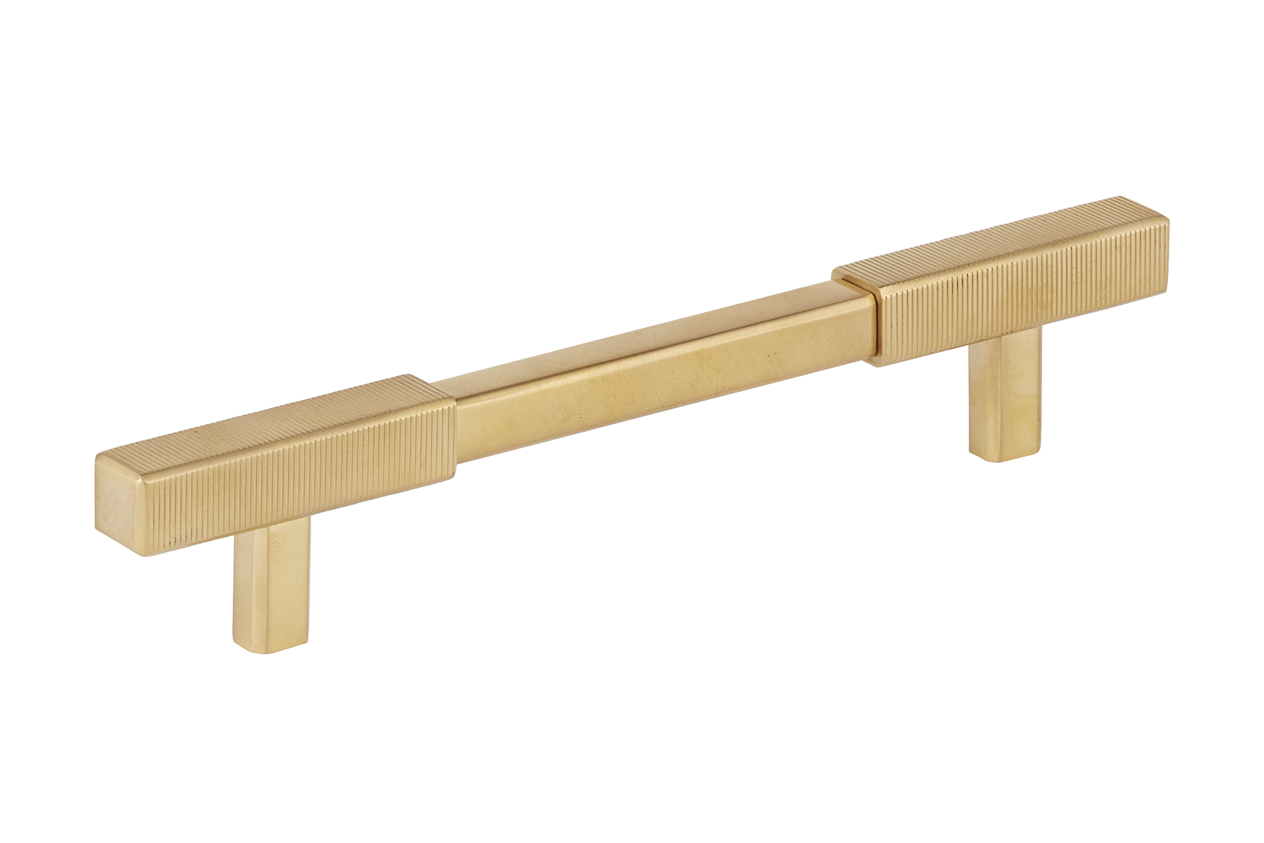 This cabinet/drawer pull handle showcases a minimalist, geometric design that adds a contemporary touch to any space. It features a long, rectangular central bar with smooth surfaces and two end blocks with vertical ridged textures for a tactile grip. Crafted from a metallic alloy, likely brass, it comes in various metallic finishes to suit different interior styles.