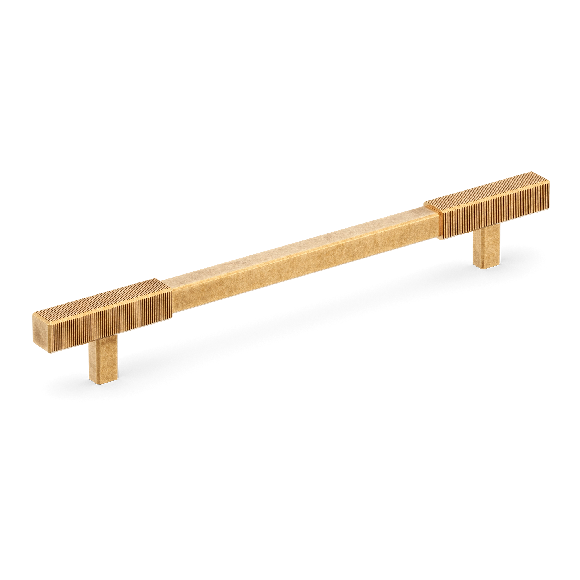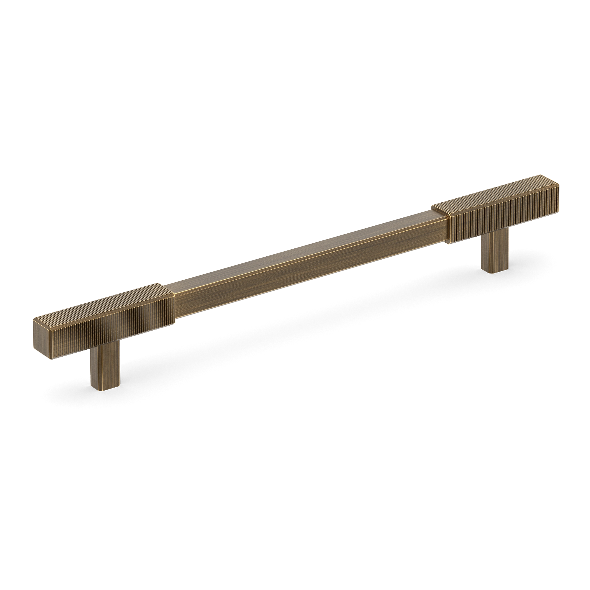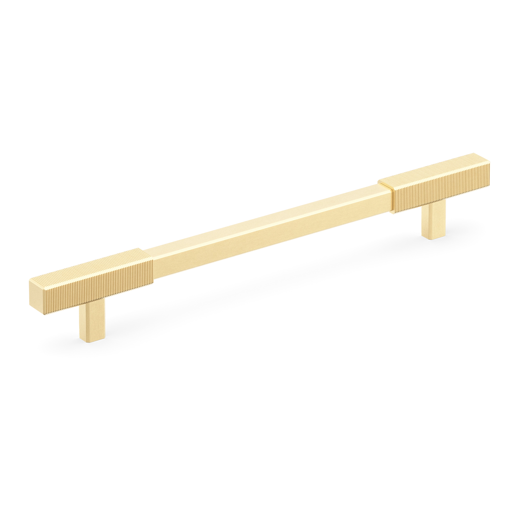 This cabinet/drawer pull handle showcases a minimalist, geometric design that adds a contemporary touch to any space. It features a long, rectangular central bar with smooth surfaces and two end blocks with vertical ridged textures for a tactile grip. Crafted from a metallic alloy, likely brass, it comes in various metallic finishes to suit different interior styles.