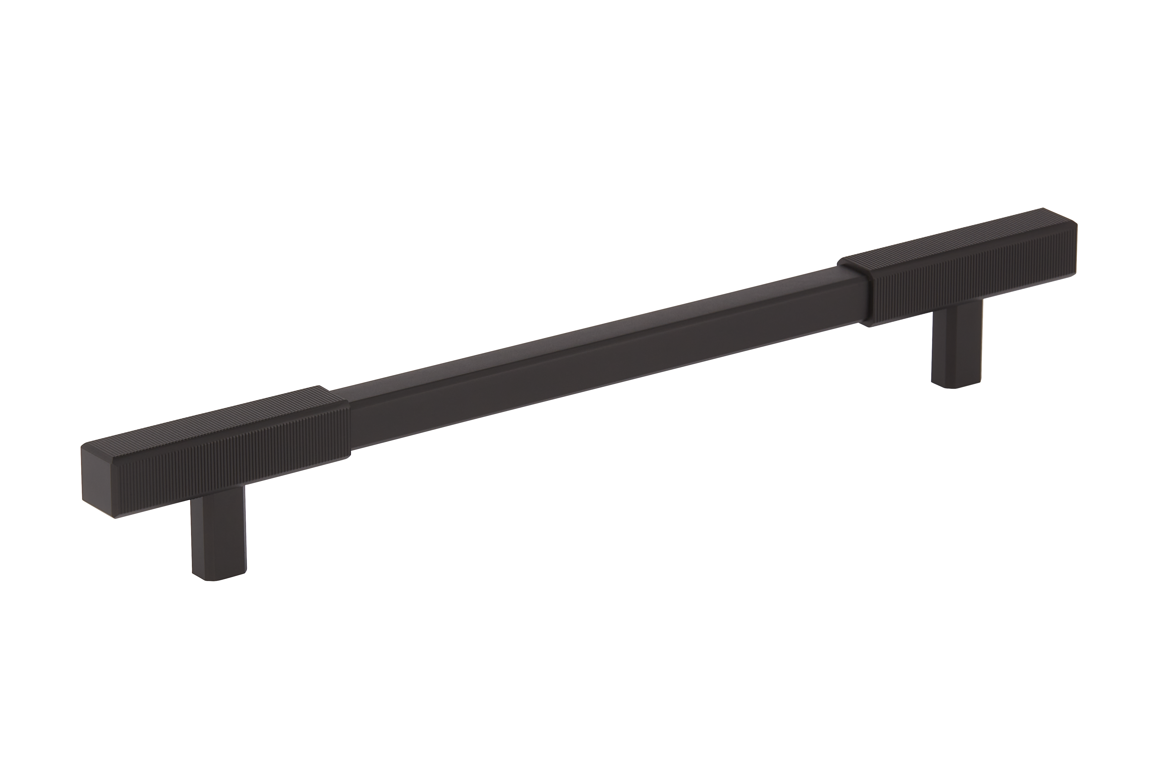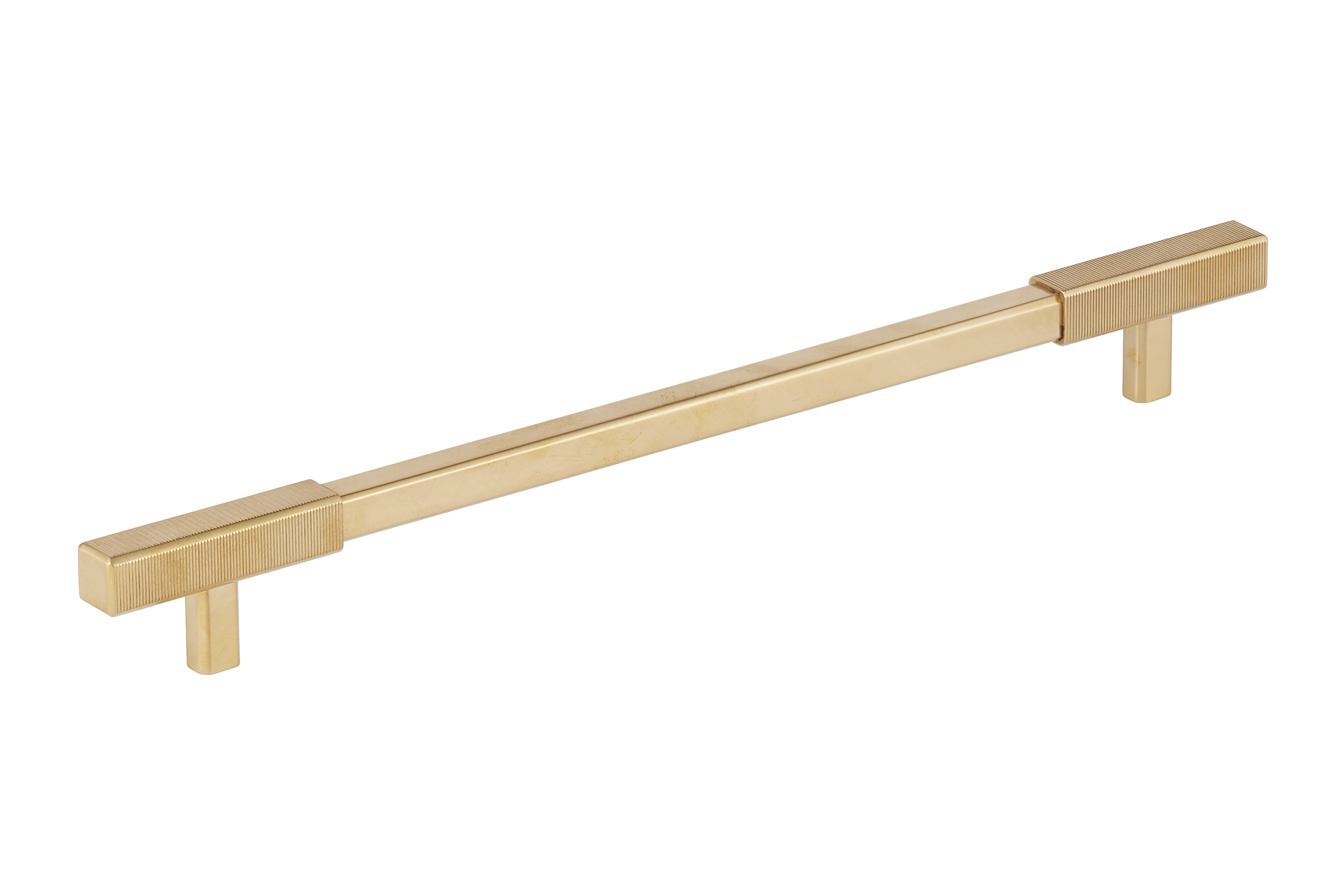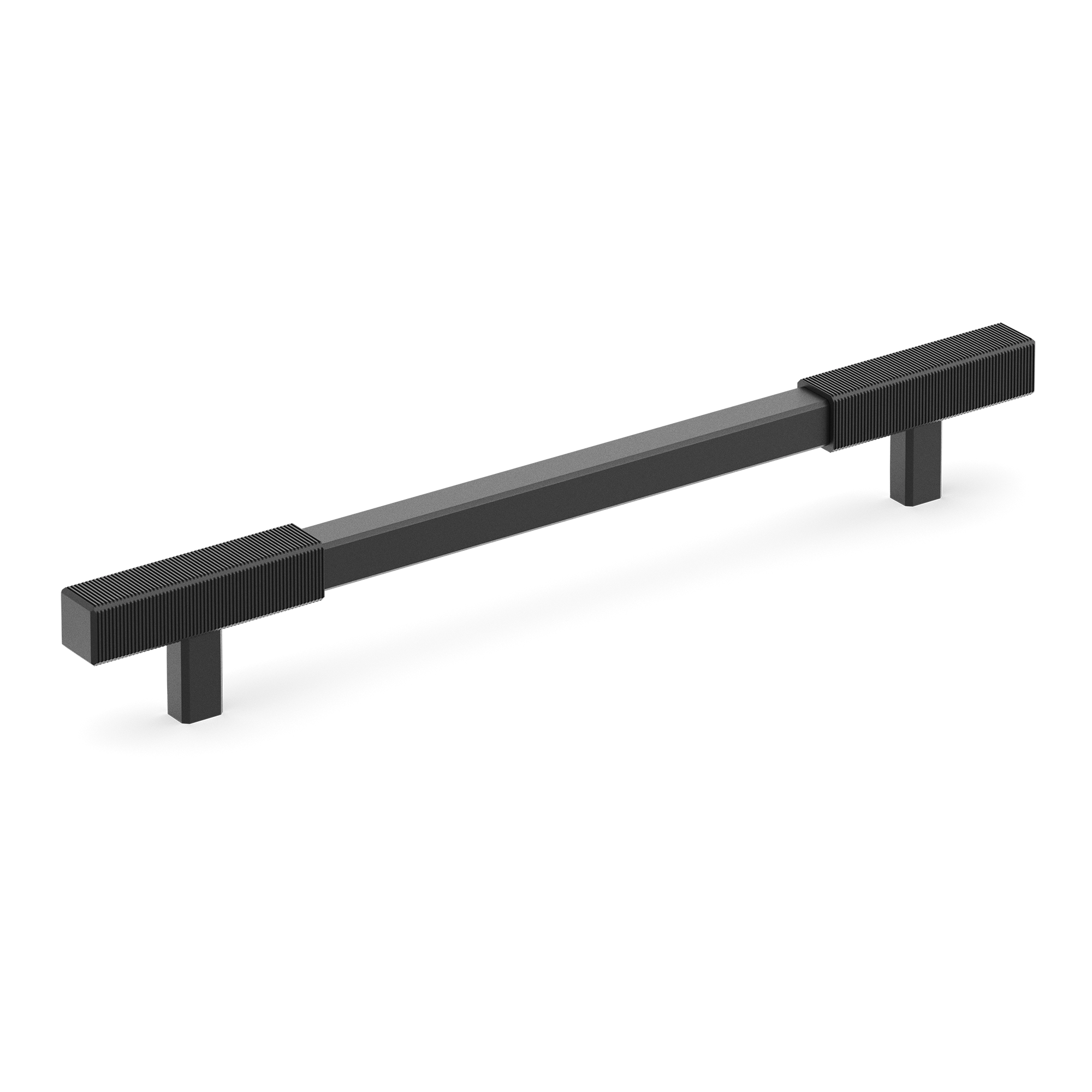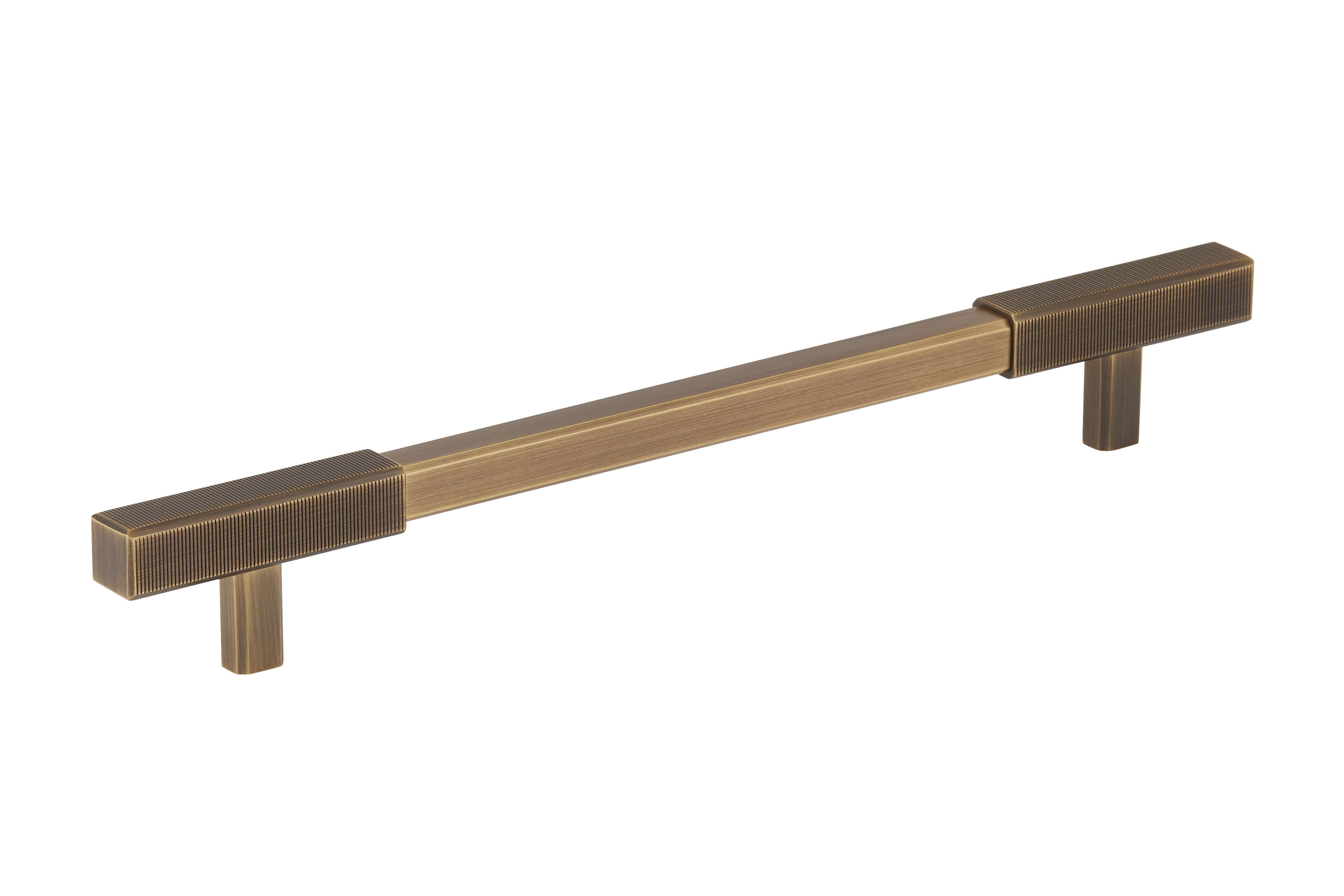 This cabinet/drawer pull handle showcases a minimalist, geometric design that adds a contemporary touch to any space. It features a long, rectangular central bar with smooth surfaces and two end blocks with vertical ridged textures for a tactile grip. Crafted from a metallic alloy, likely brass, it comes in various metallic finishes to suit different interior styles.