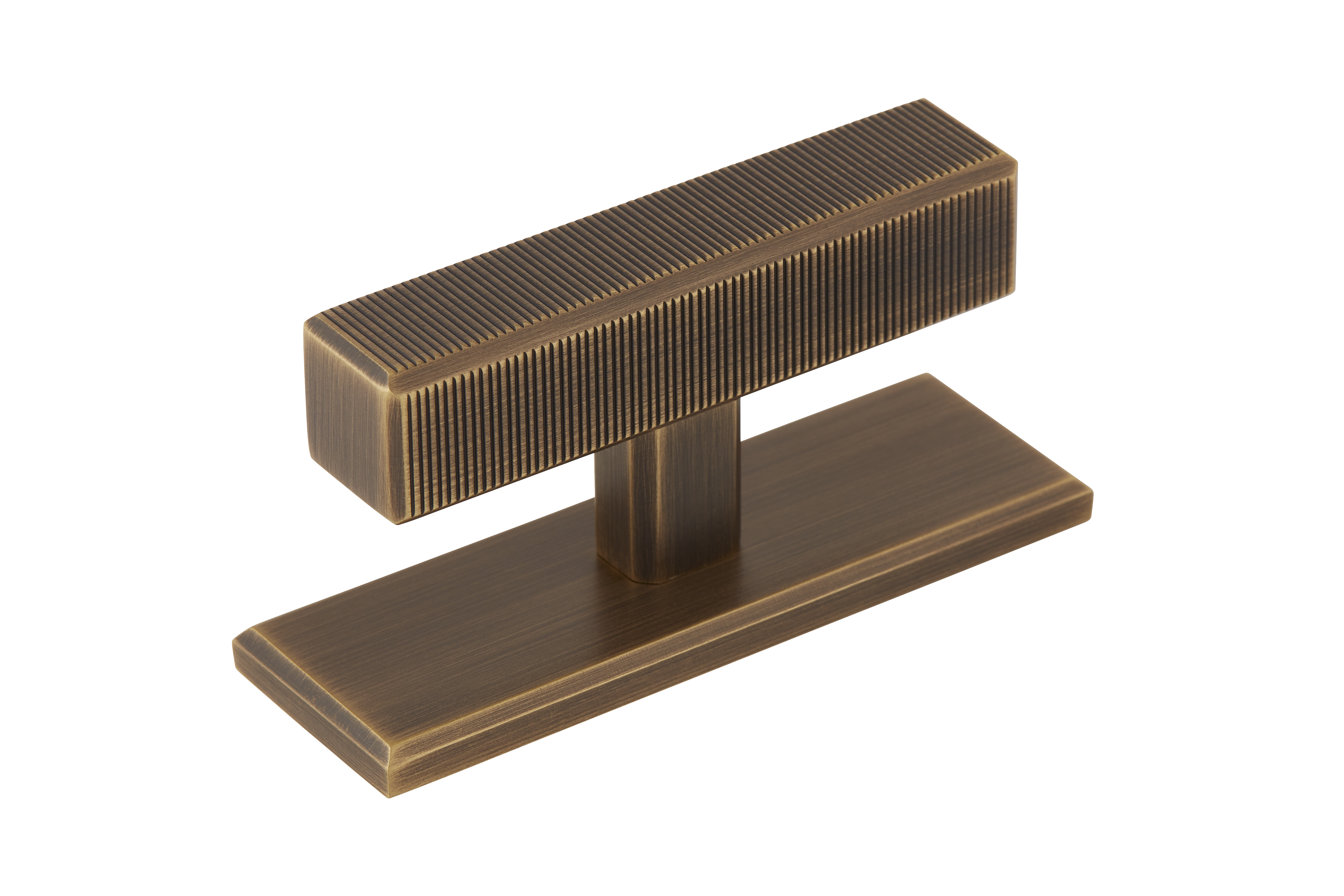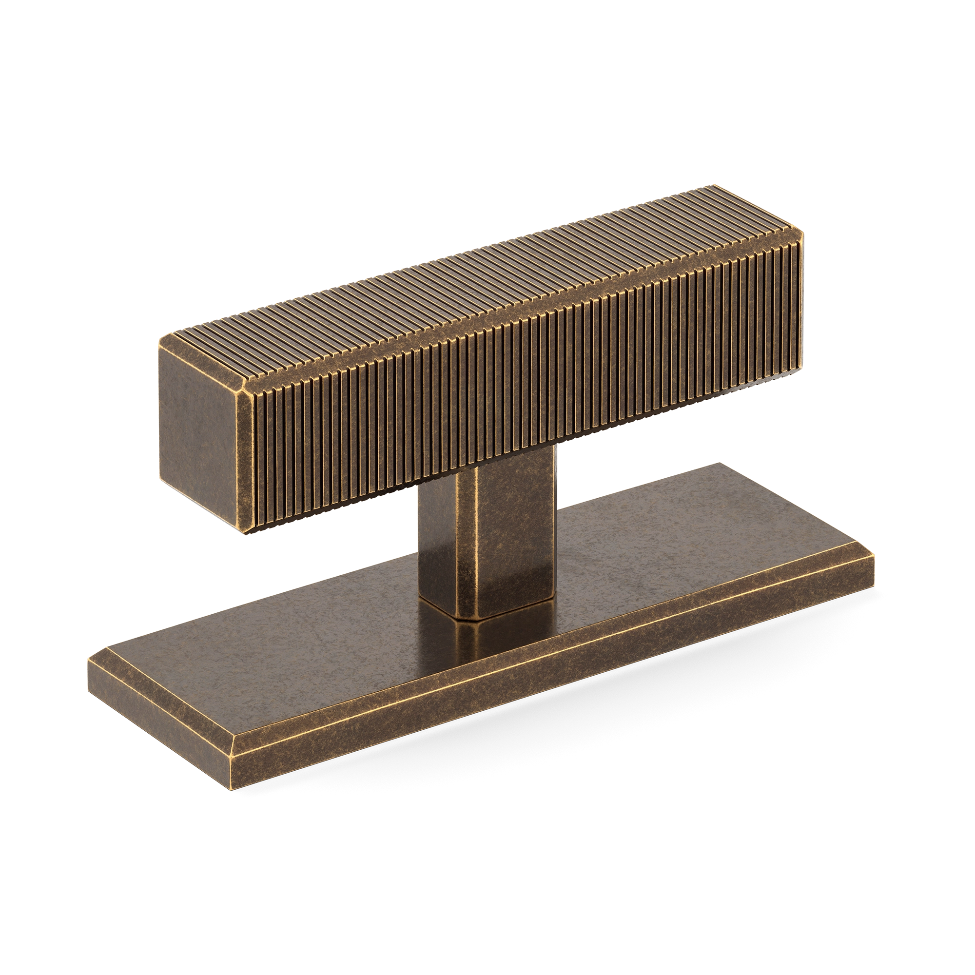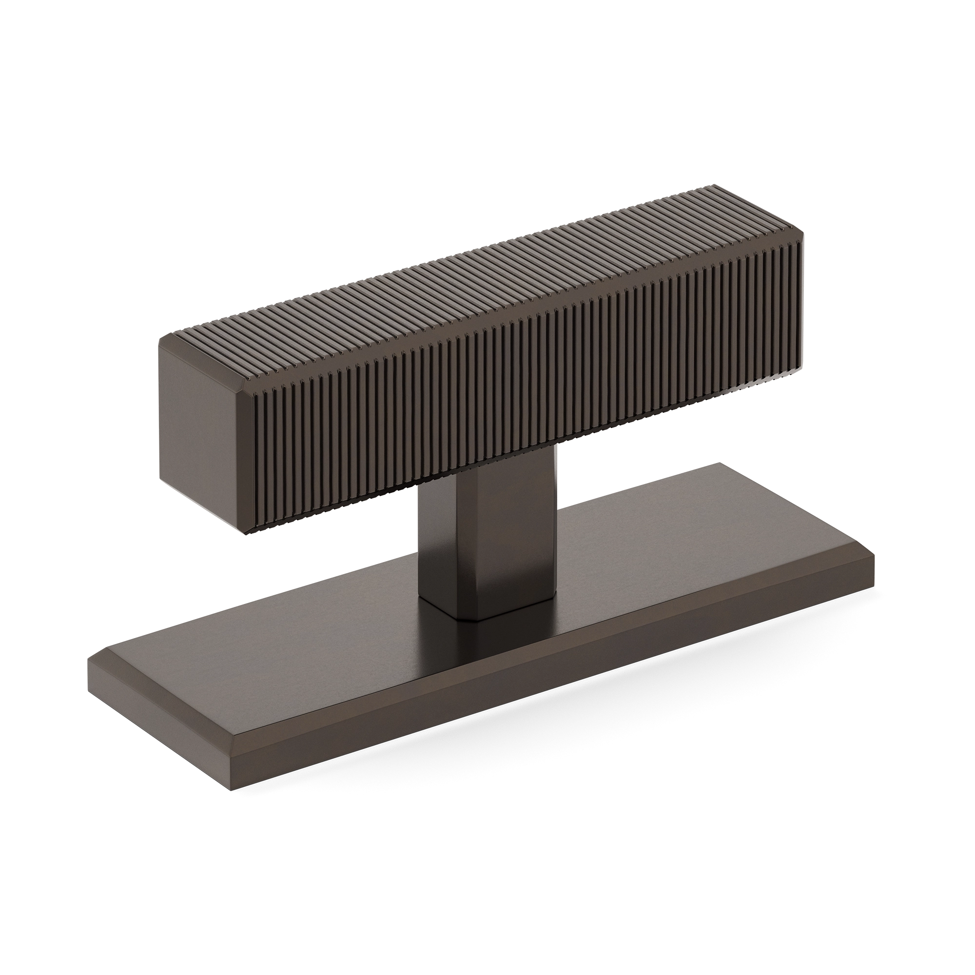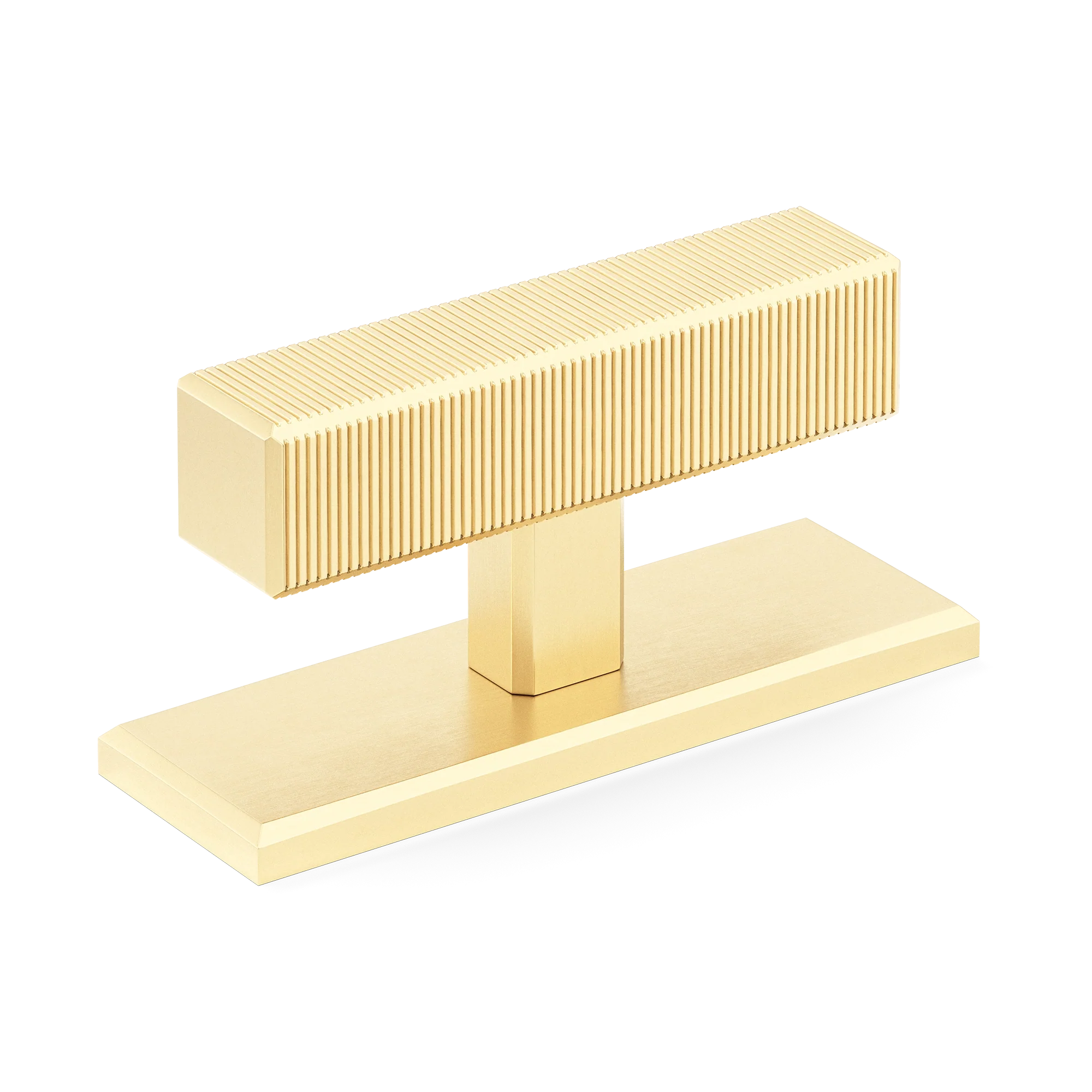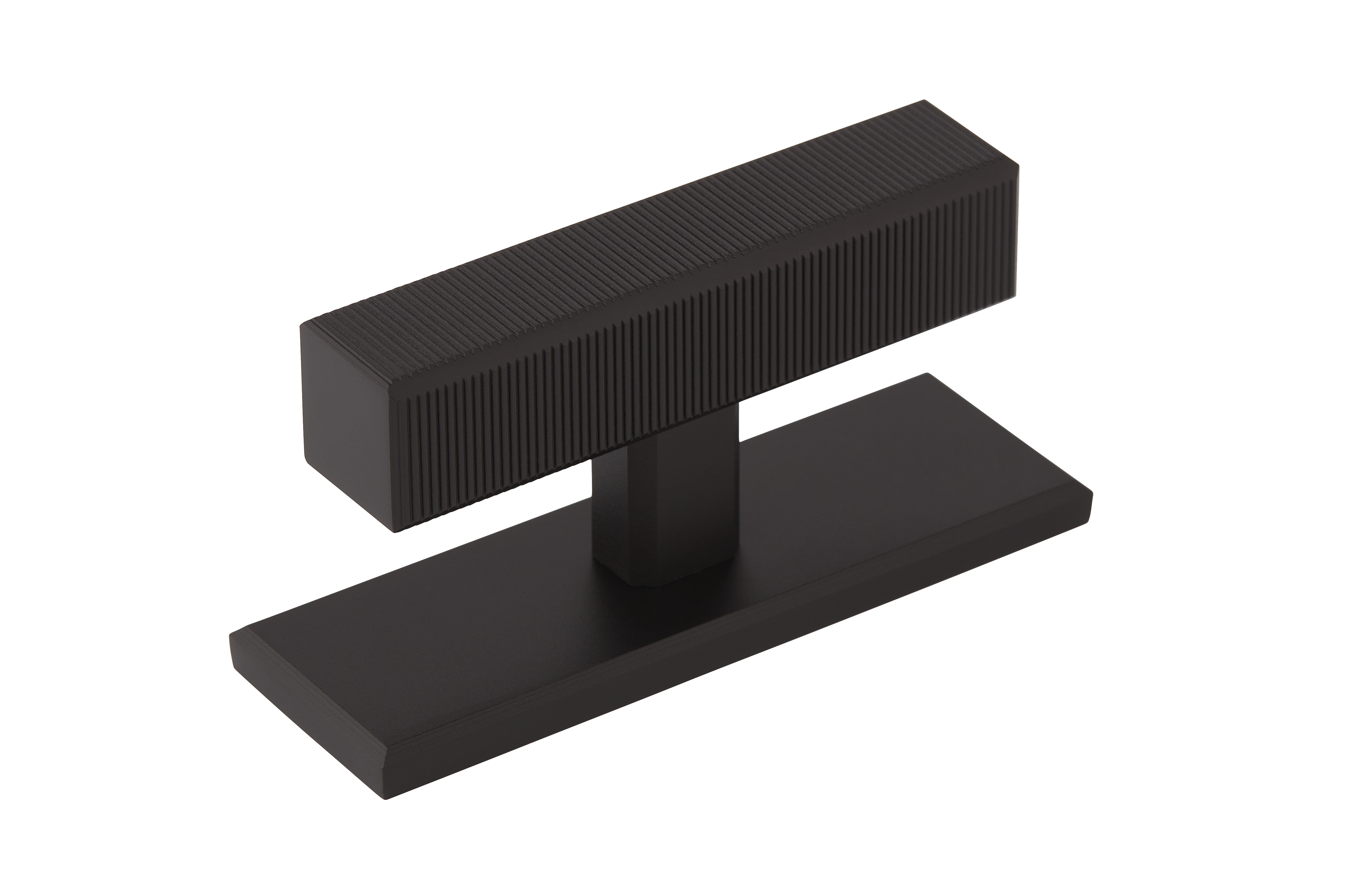 This product is a T-bar furniture handle with a backplate that fuses functionality and style. Its T-shaped structure, featuring a ribbed top element for a secure grip, sits atop a smooth rectangular base. Crafted from materials like brass and available in a variety of metallic finishes, it brings a contemporary and industrial look to furniture and doors.