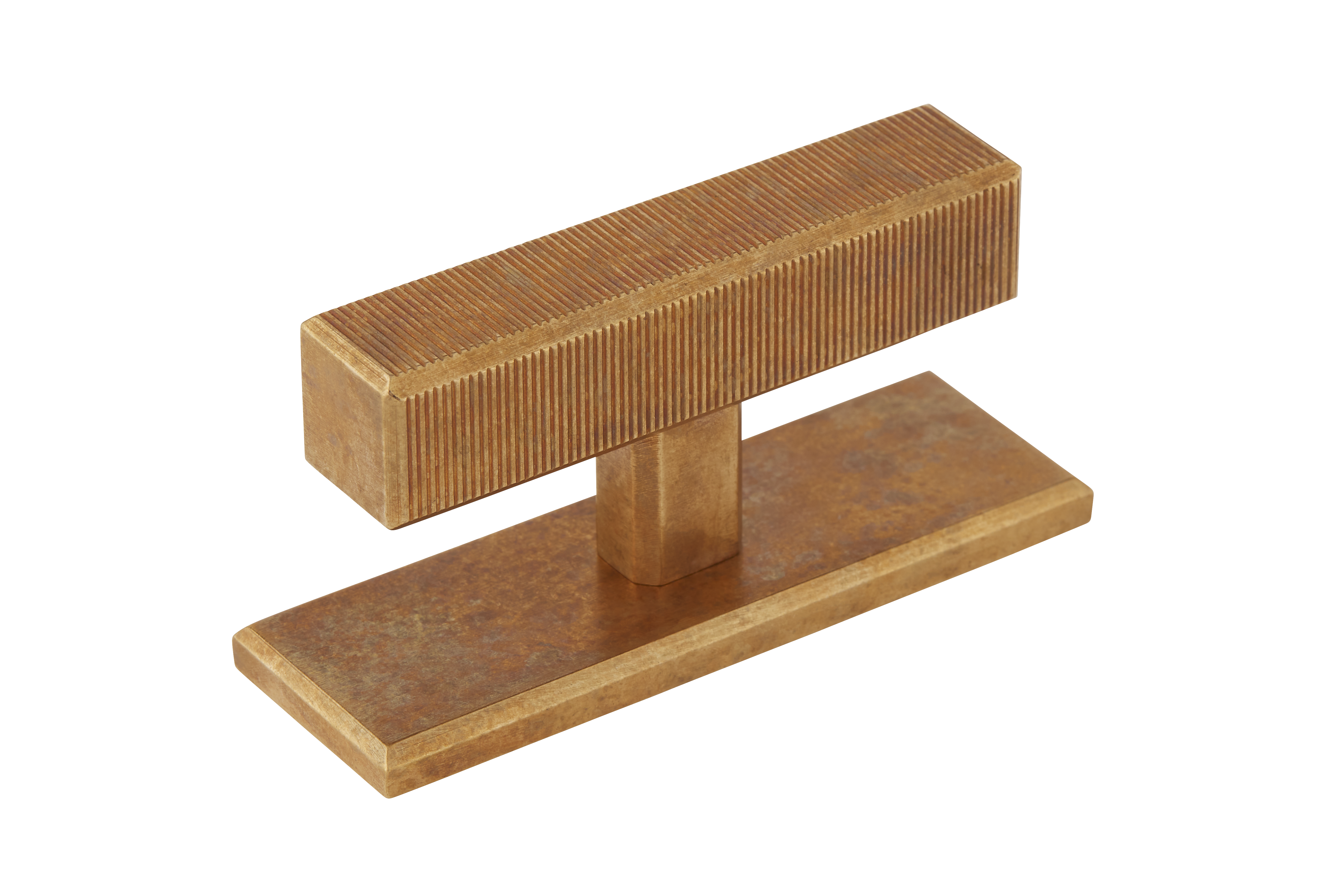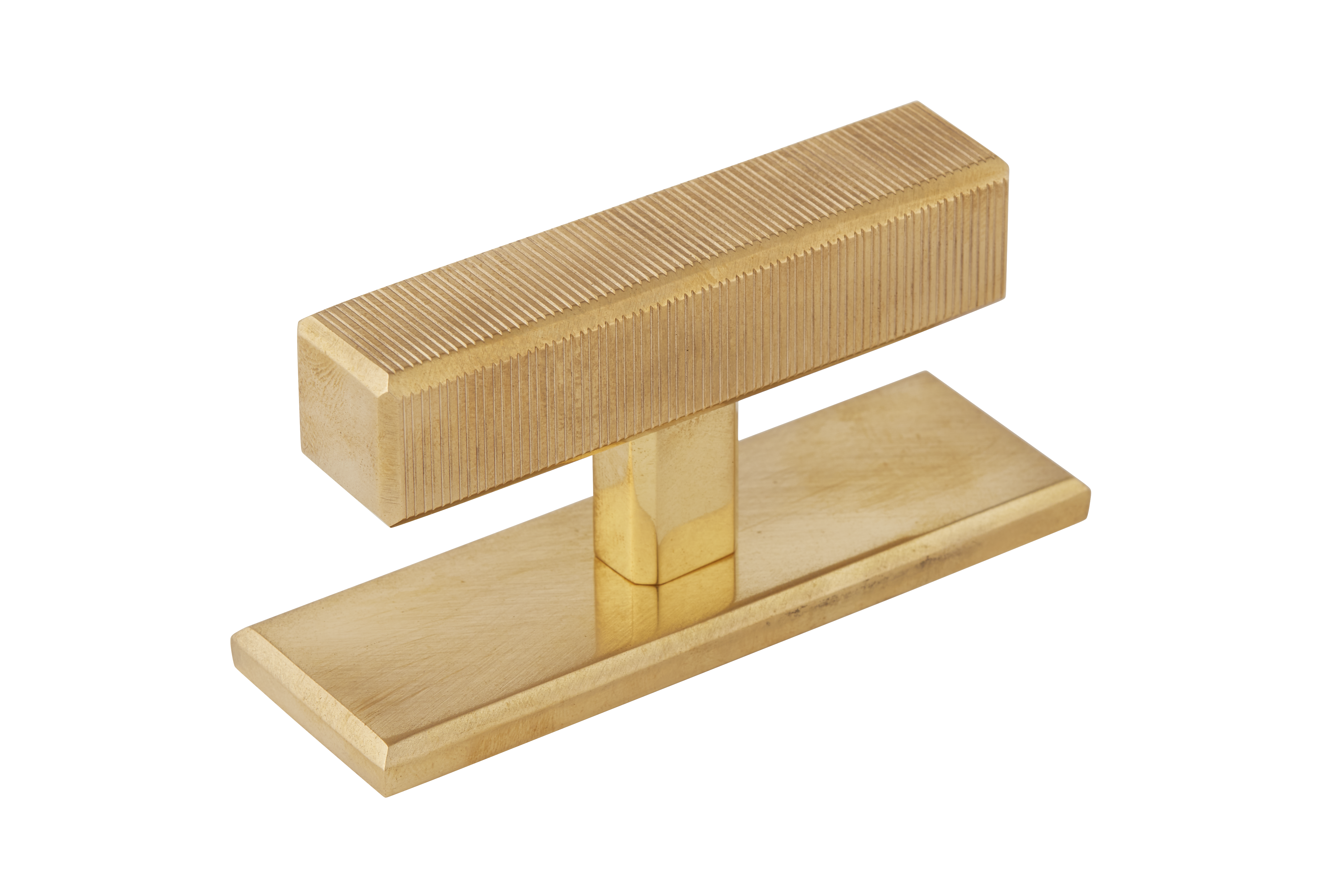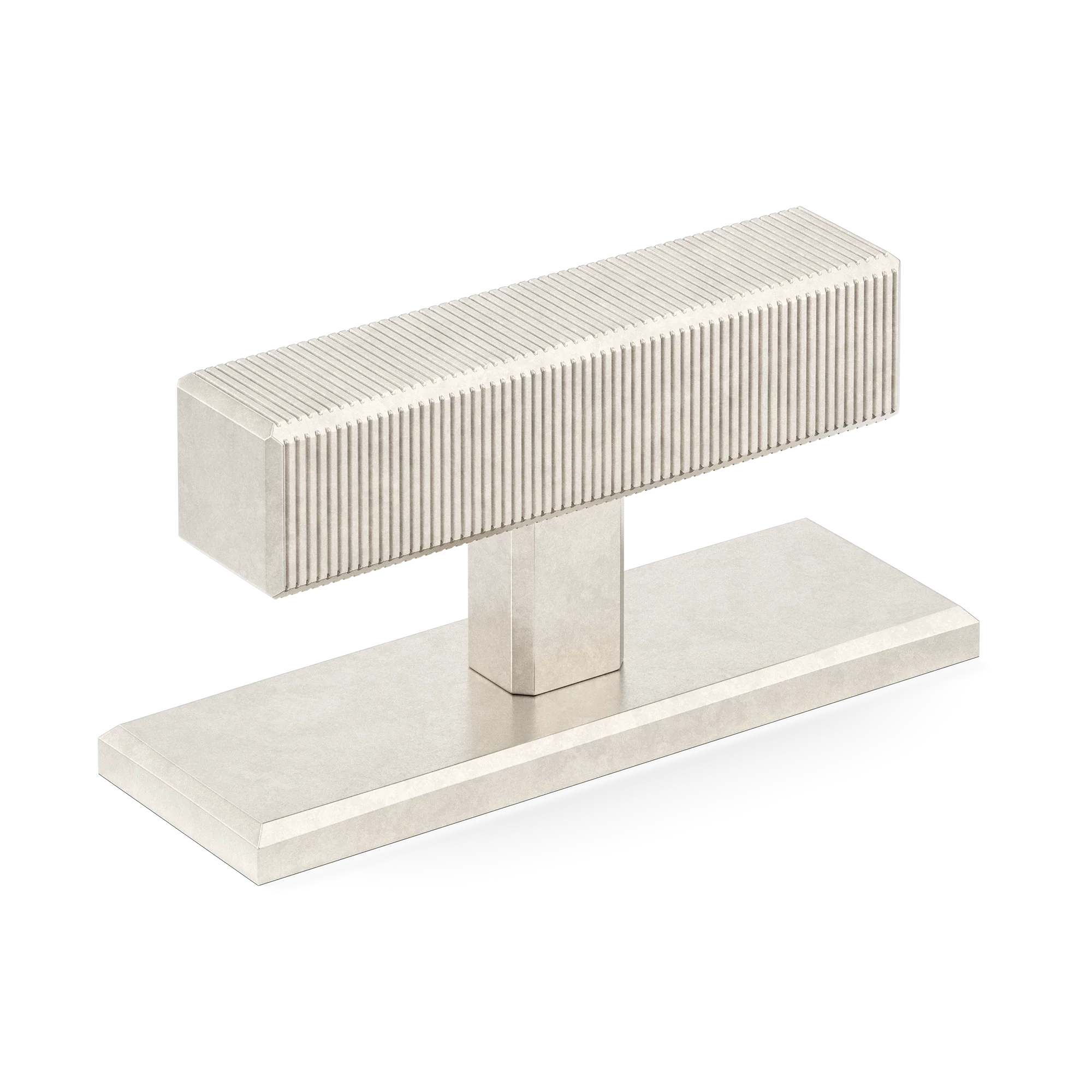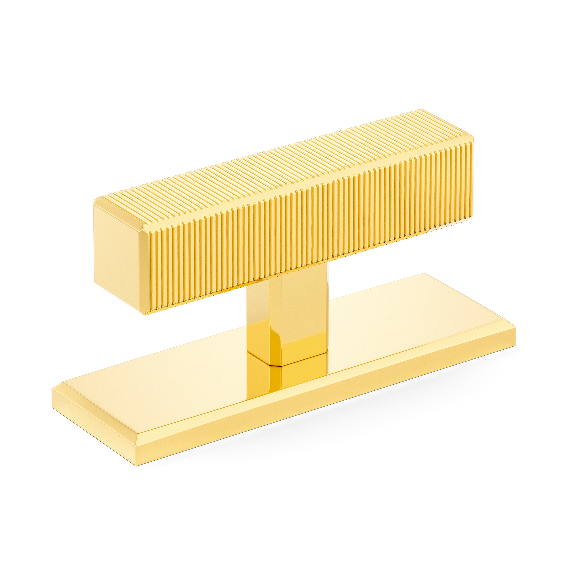 This product is a T-bar furniture handle with a backplate that fuses functionality and style. Its T-shaped structure, featuring a ribbed top element for a secure grip, sits atop a smooth rectangular base. Crafted from materials like brass and available in a variety of metallic finishes, it brings a contemporary and industrial look to furniture and doors.