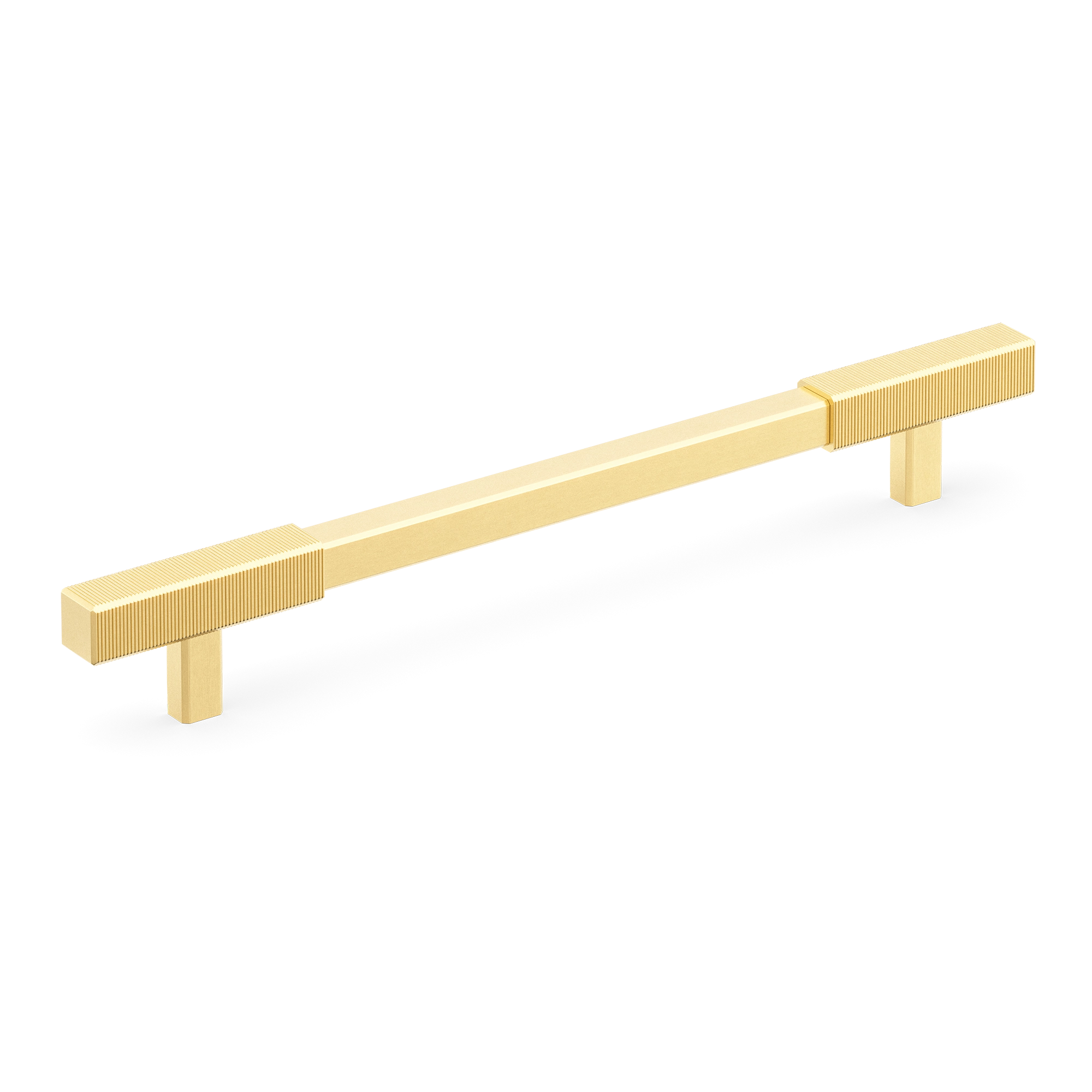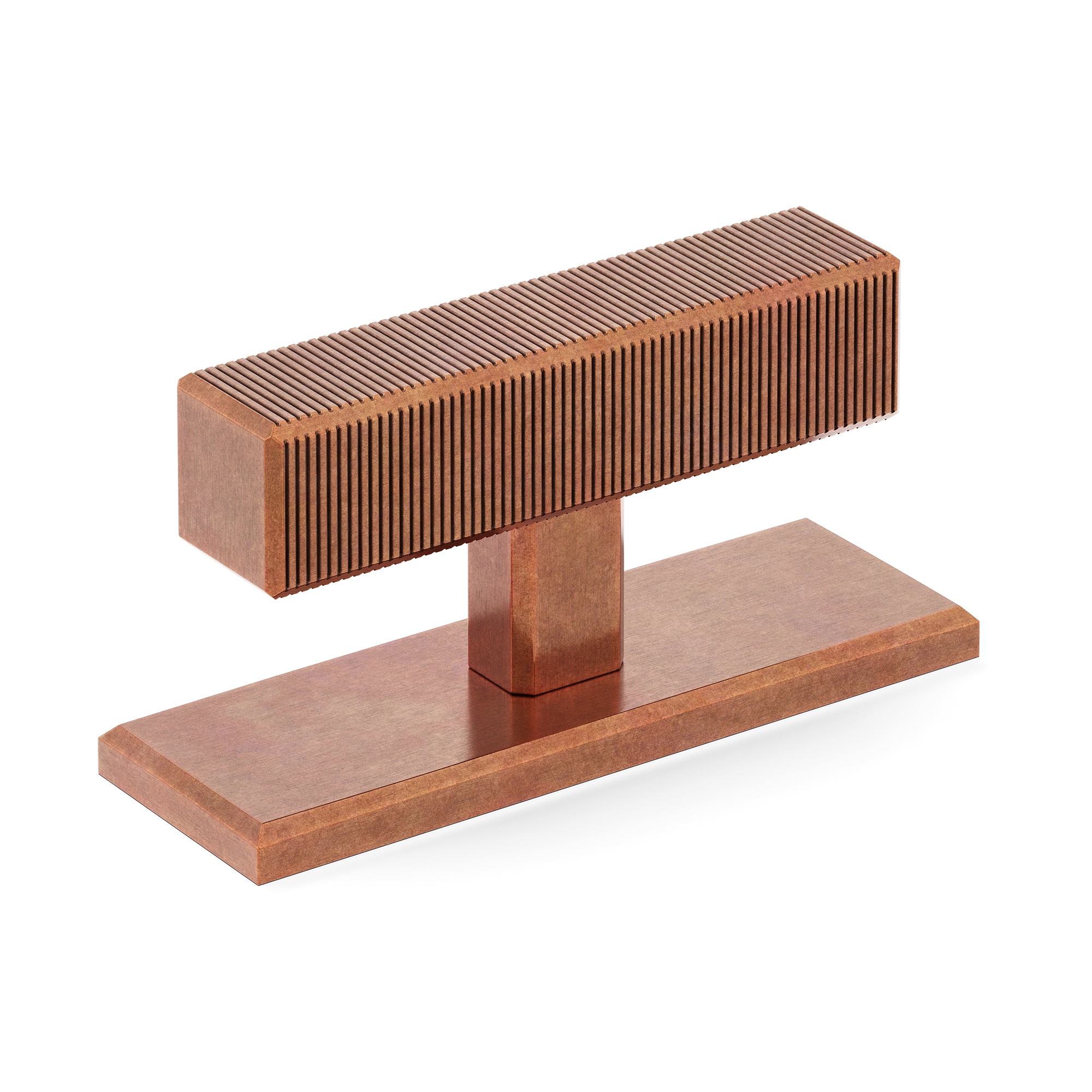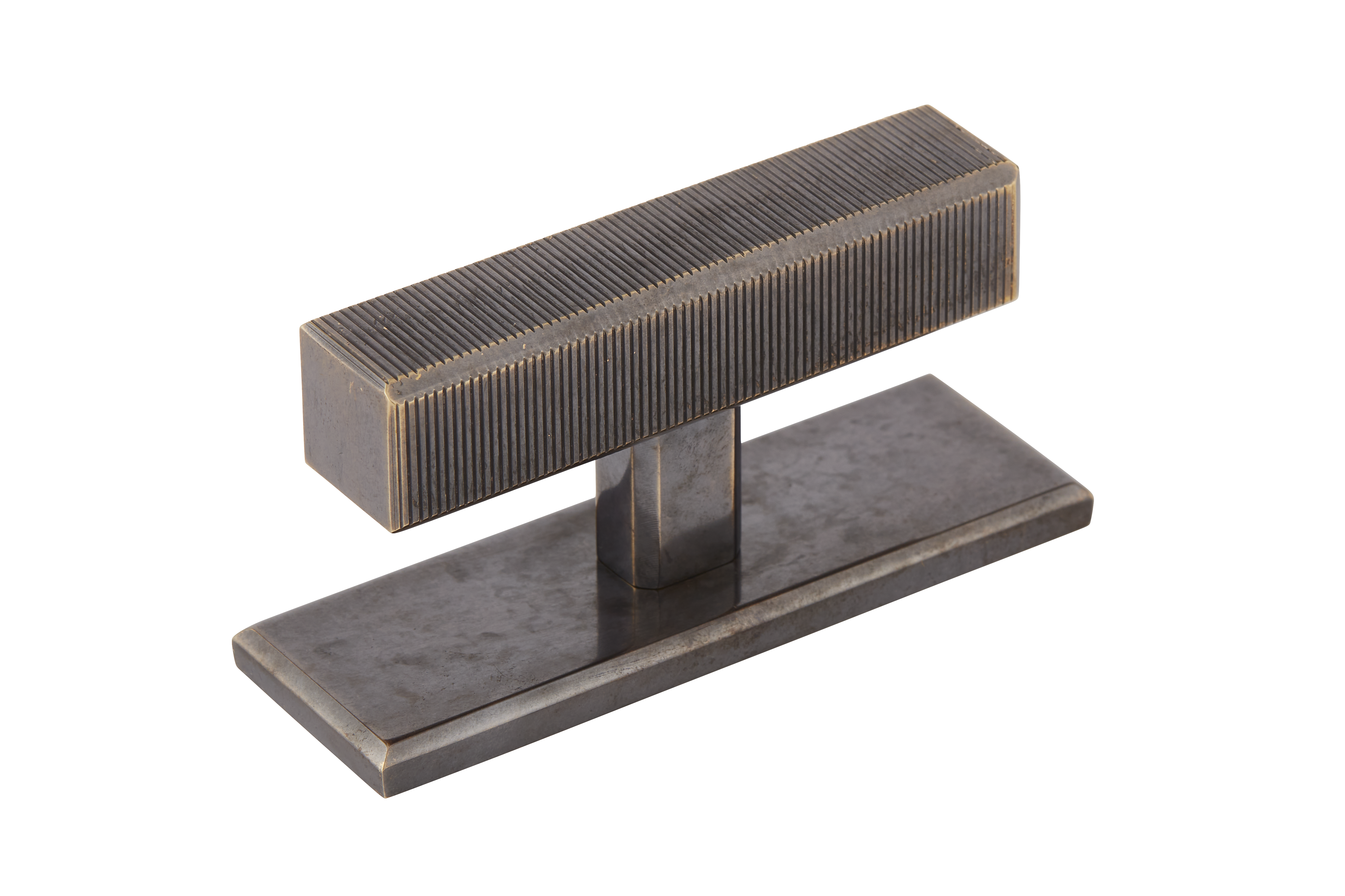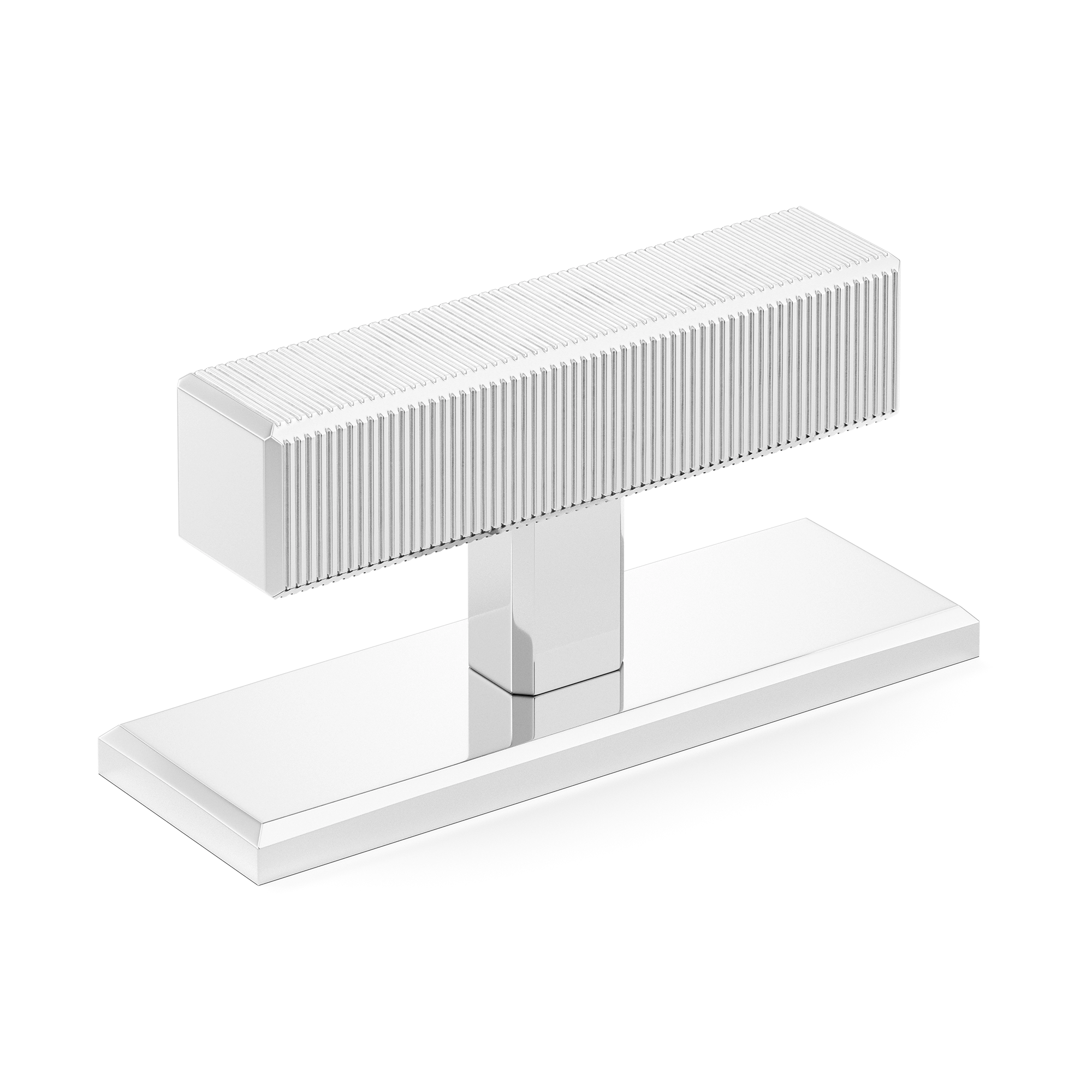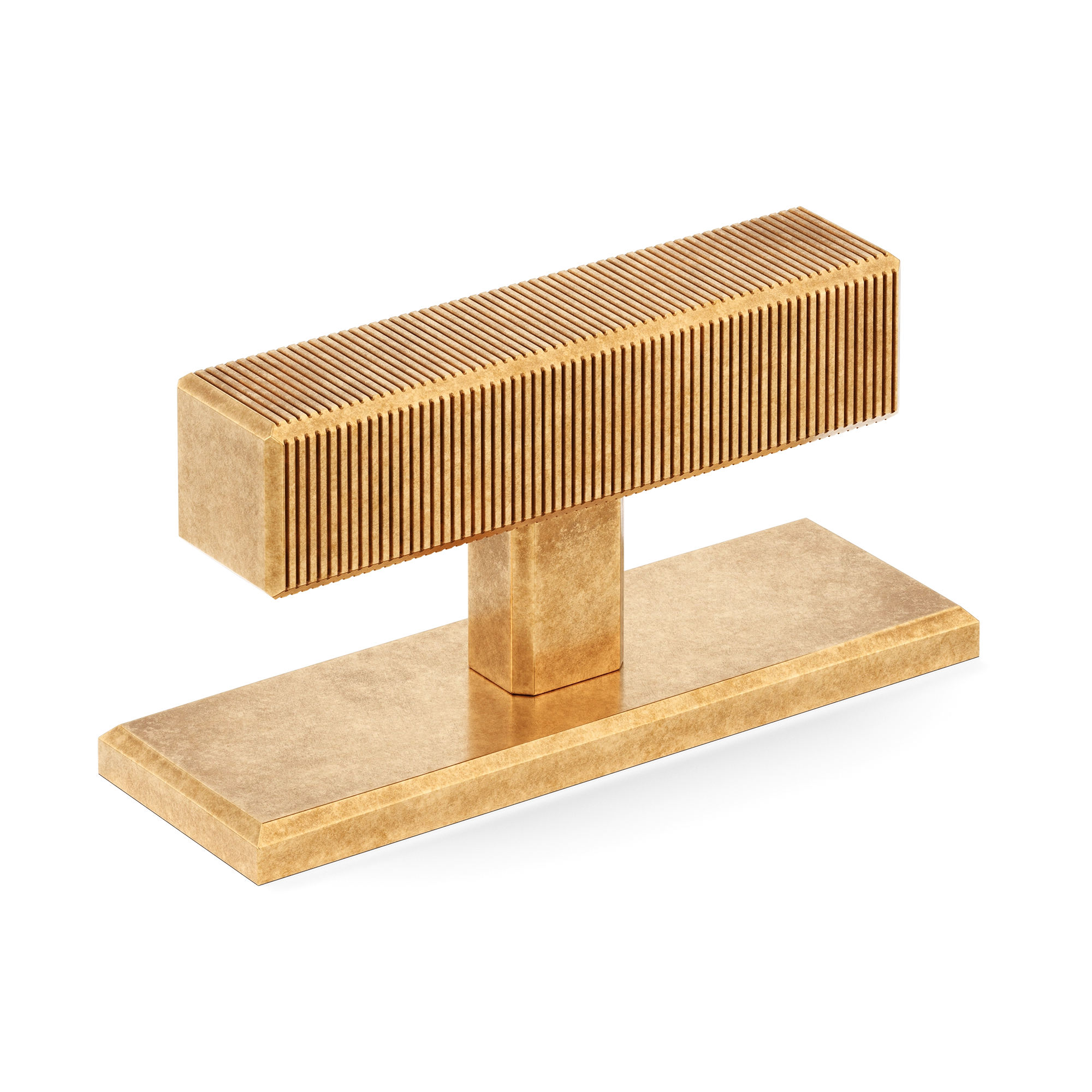 This product is a T-bar furniture handle with a backplate that fuses functionality and style. Its T-shaped structure, featuring a ribbed top element for a secure grip, sits atop a smooth rectangular base. Crafted from materials like brass and available in a variety of metallic finishes, it brings a contemporary and industrial look to furniture and doors.