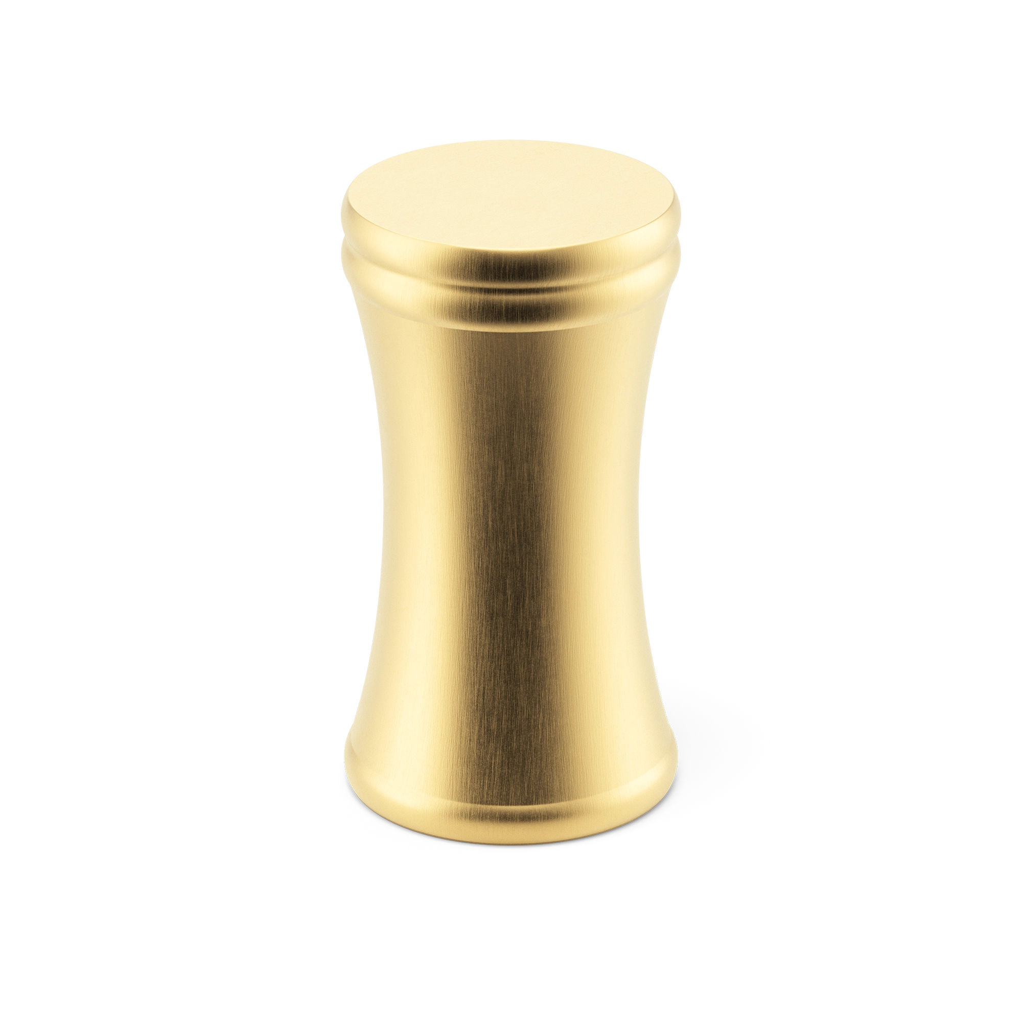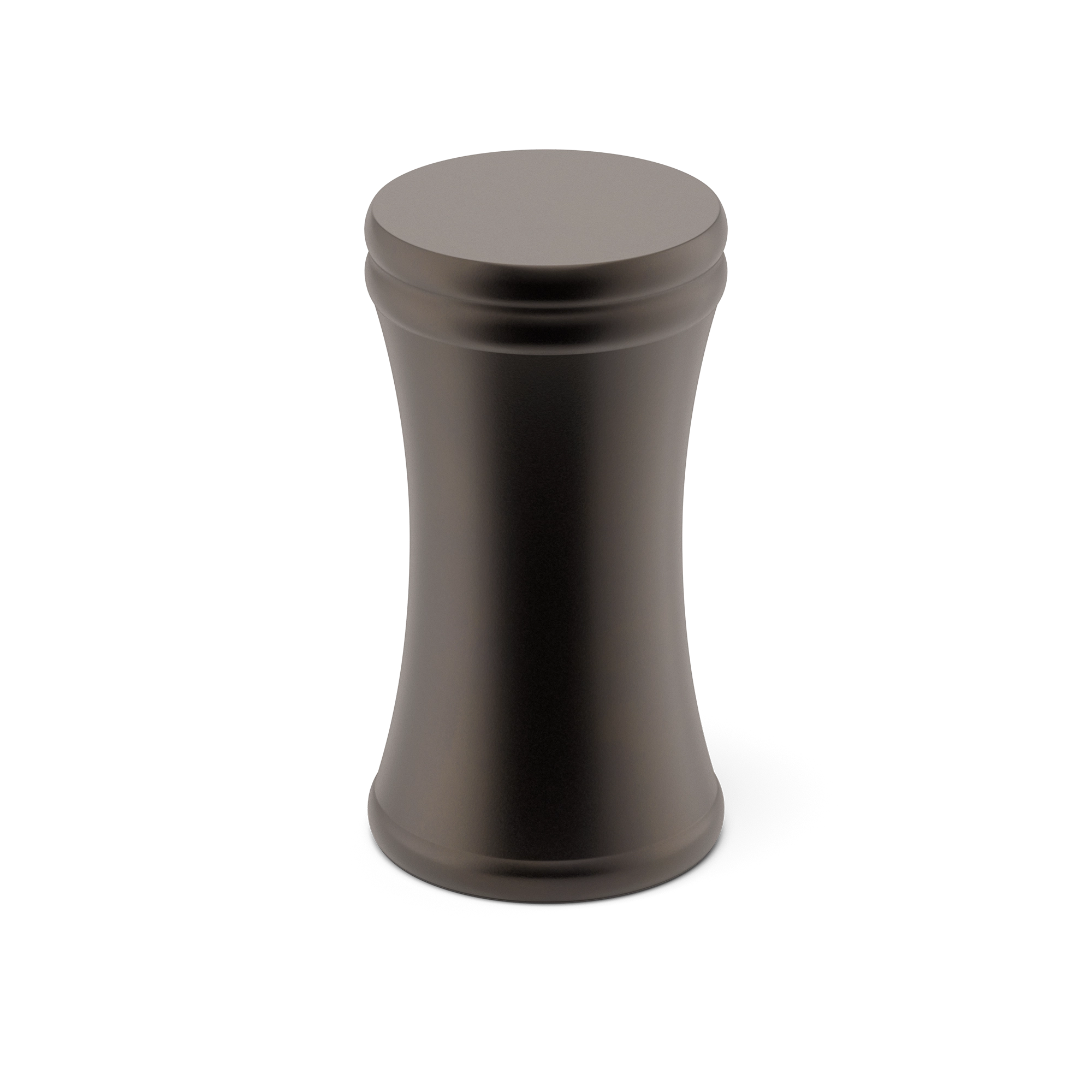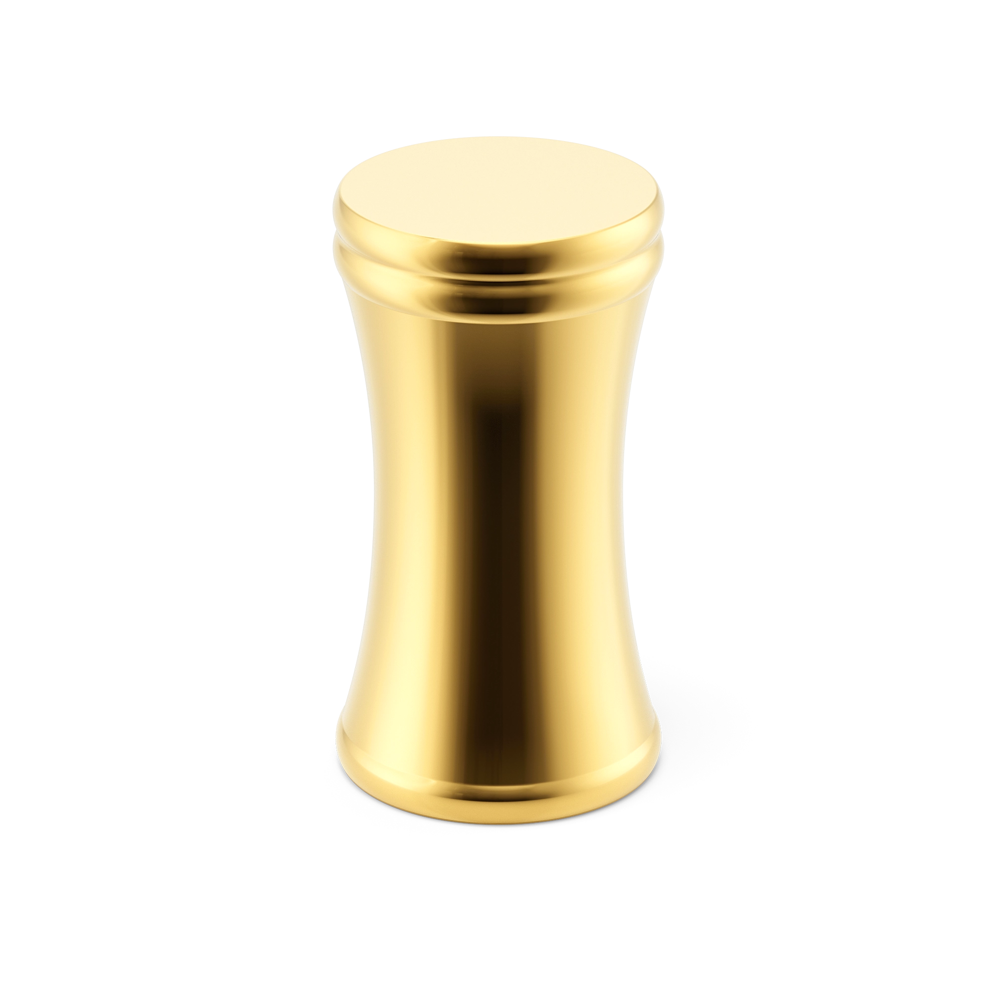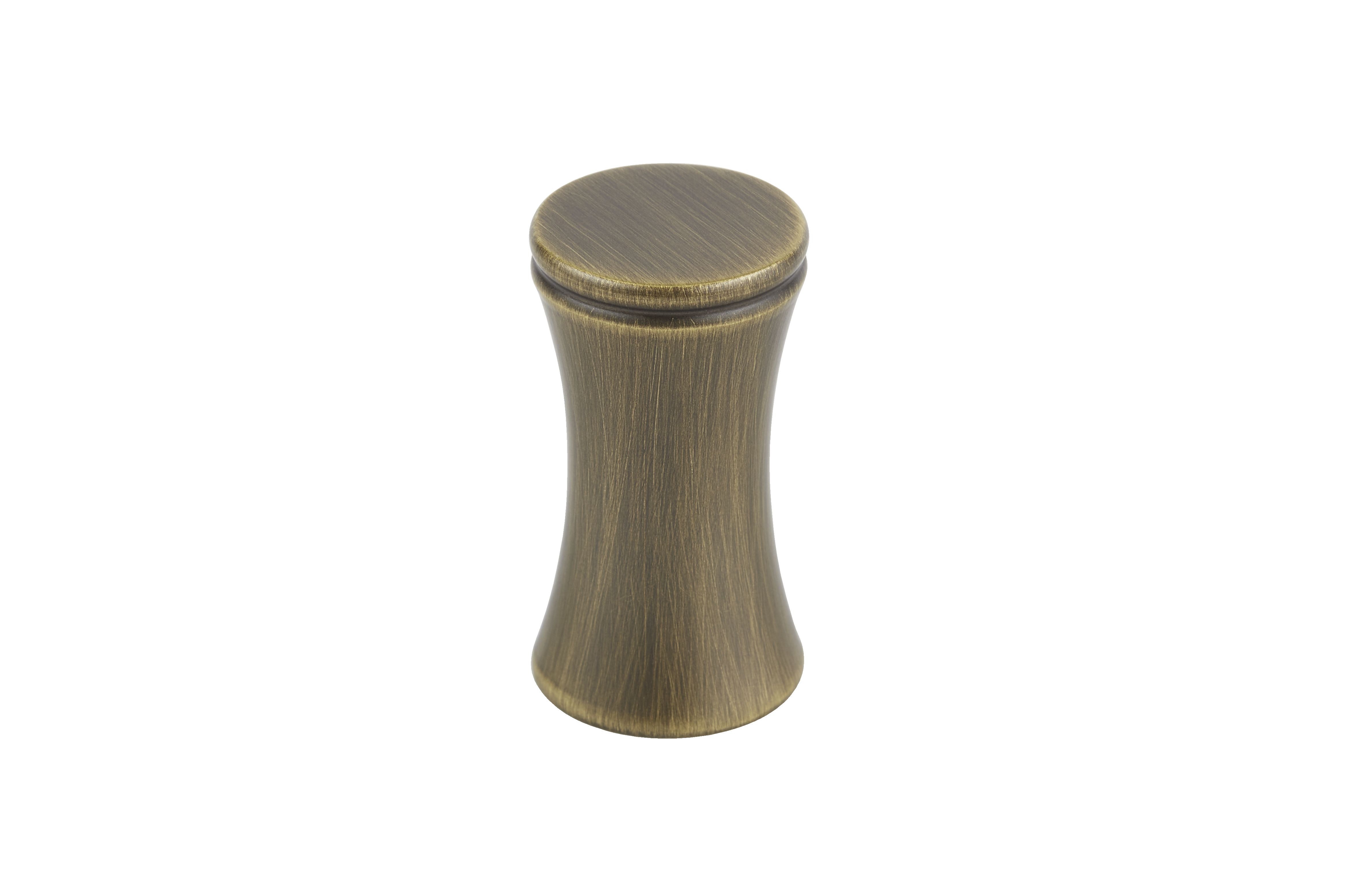 This is a small, decorative metal cabinet knob. It features a unique hourglass – shaped silhouette with a rounded top, narrow waist, and flared base. The knob has two smooth circular ridges for added visual texture. It’s an elegant piece that can adorn cabinet doors and drawers, enhancing the overall look of the furniture.