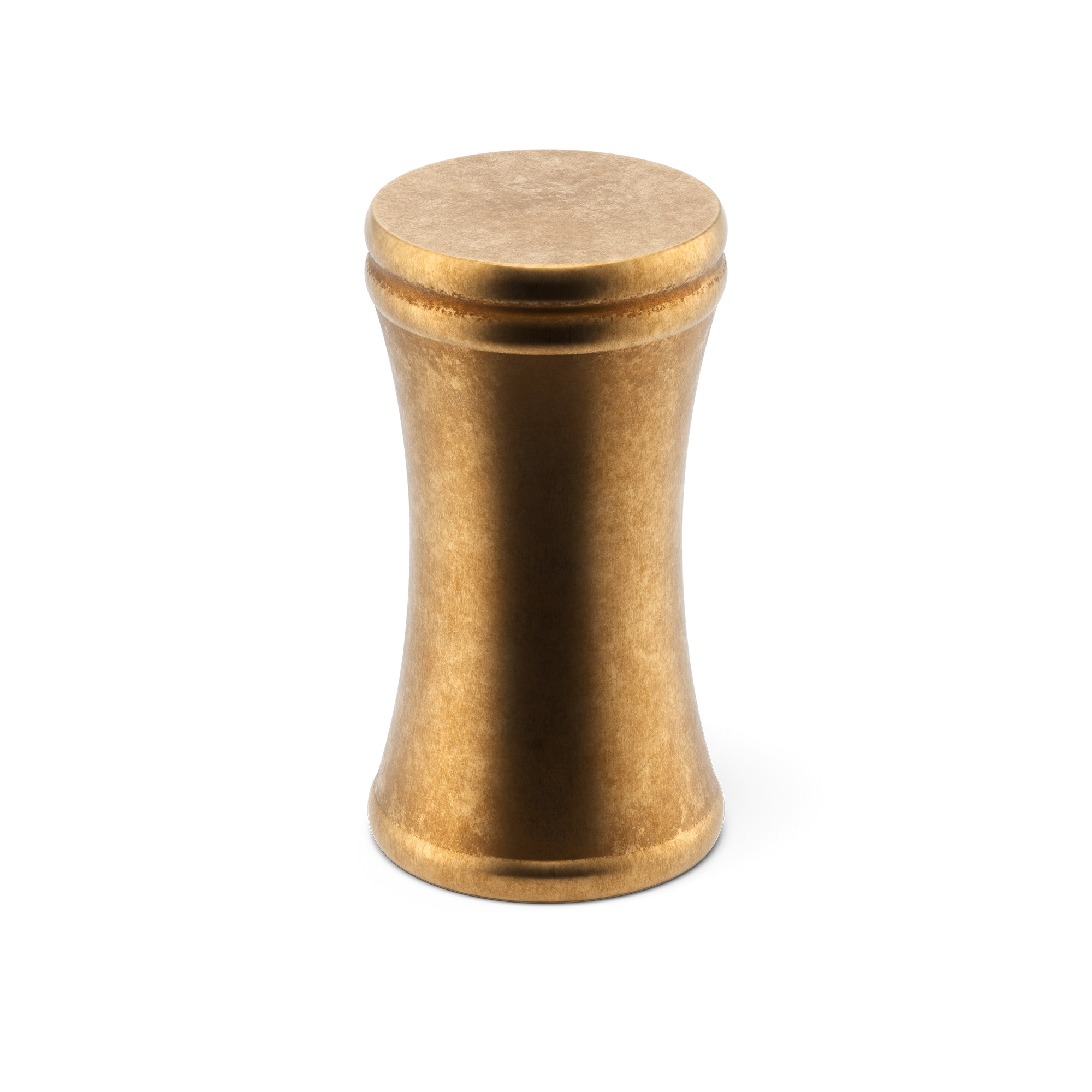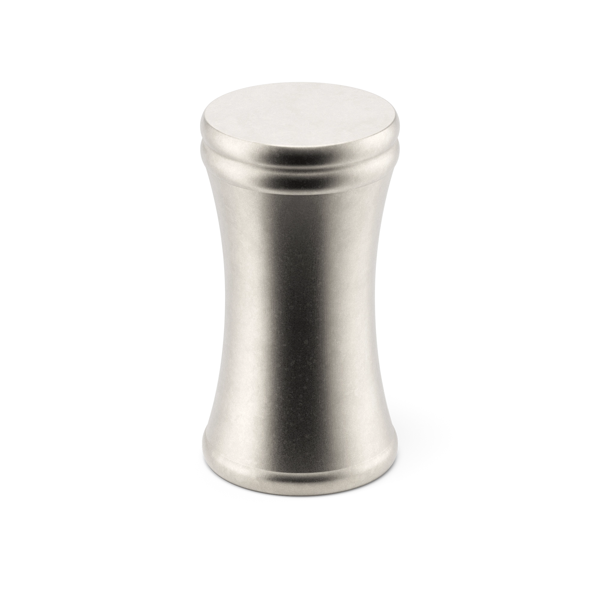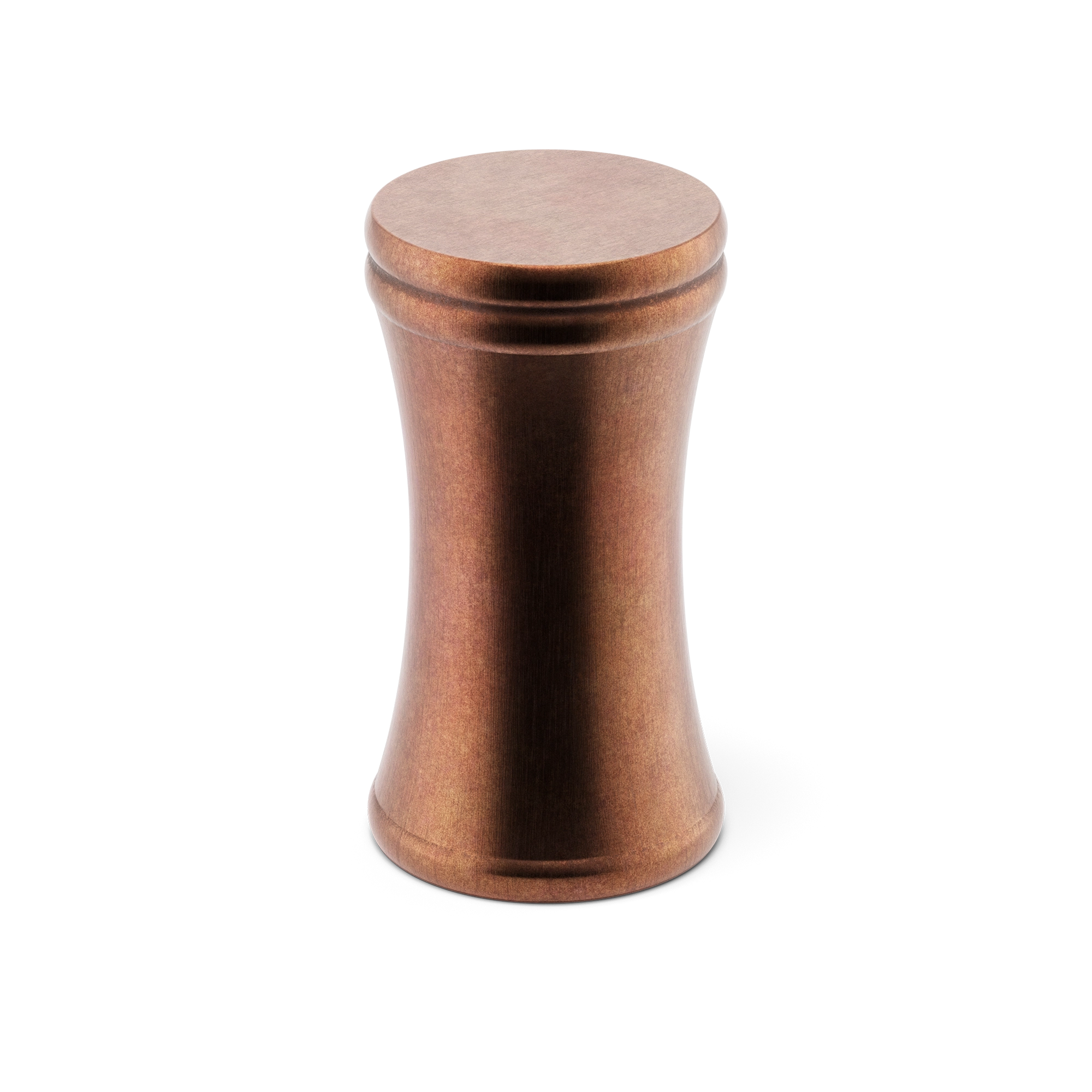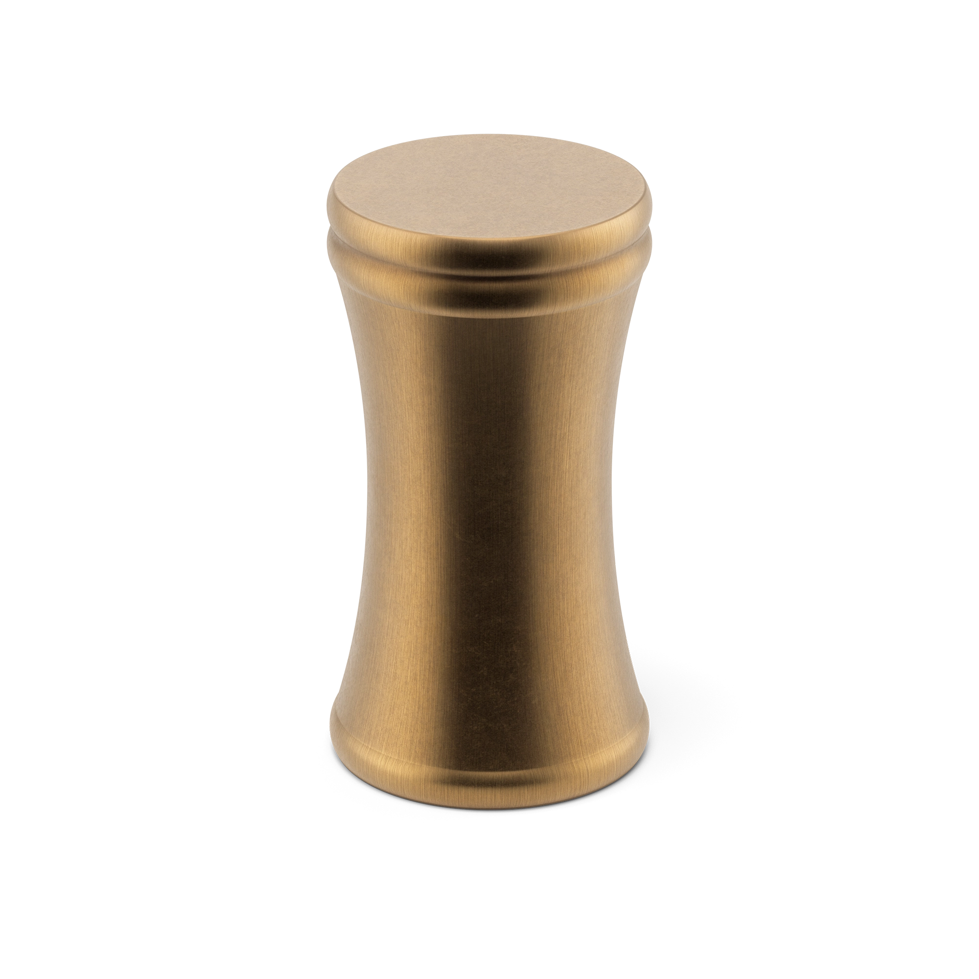 This is a small, decorative metal cabinet knob. It features a unique hourglass – shaped silhouette with a rounded top, narrow waist, and flared base. The knob has two smooth circular ridges for added visual texture. It’s an elegant piece that can adorn cabinet doors and drawers, enhancing the overall look of the furniture.