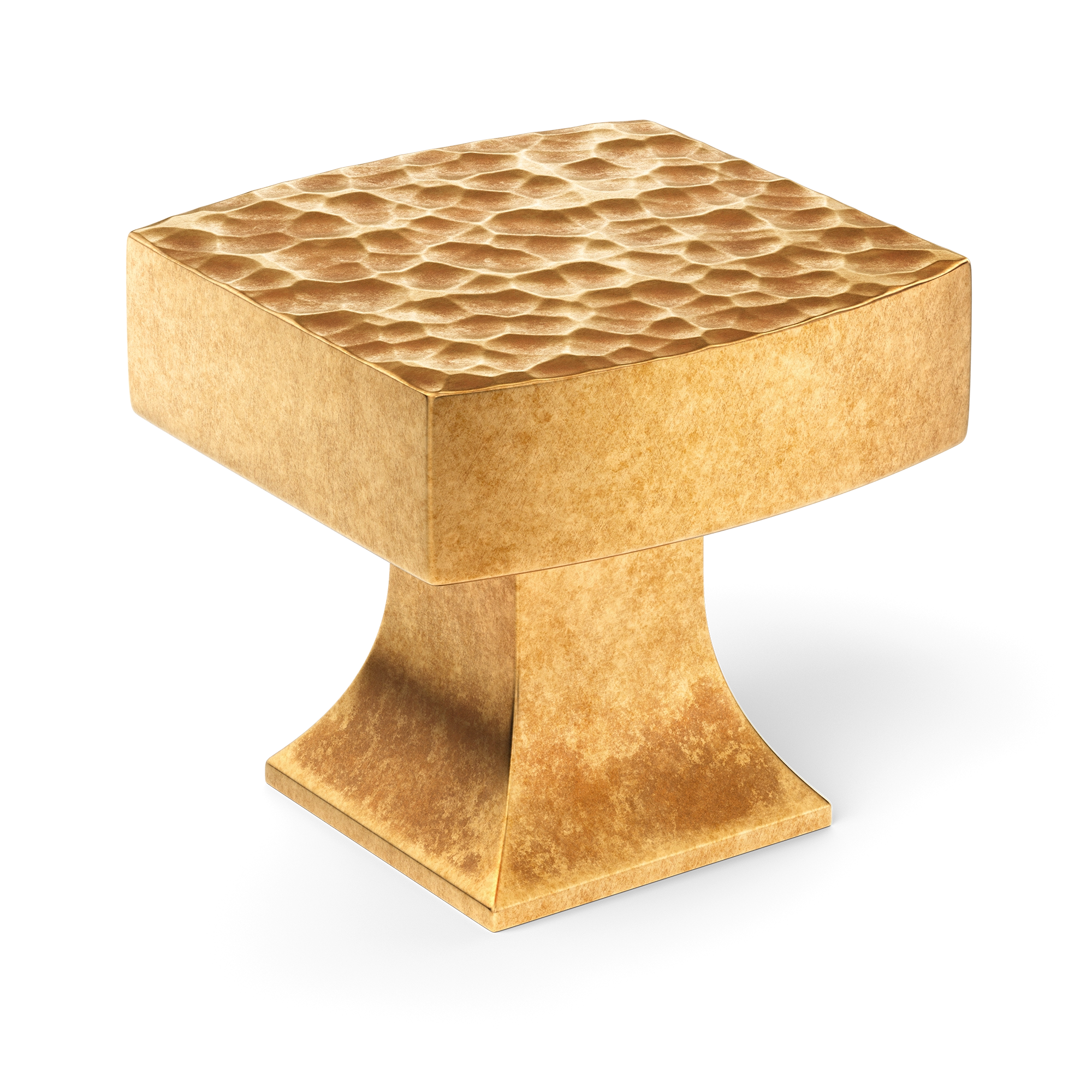 This accent table offers a blend of modern design and artisanal charm. With a square top featuring a unique hammered texture and a flared square pedestal base, it’s both a stylish decorative piece and a functional addition. Made from metal or a metal alloy, it comes in a variety of colors and finishes, making it suitable for different interior design aesthetics.