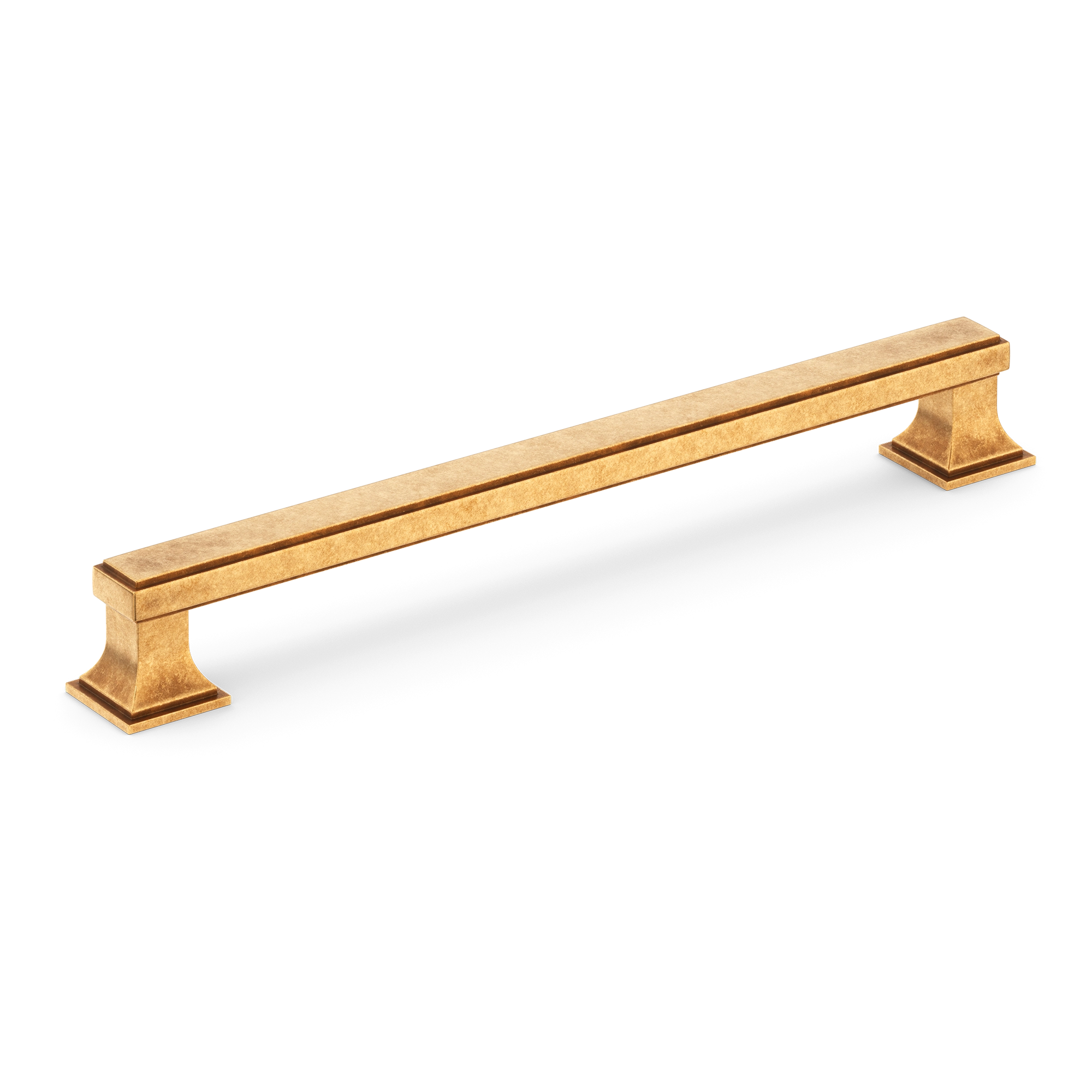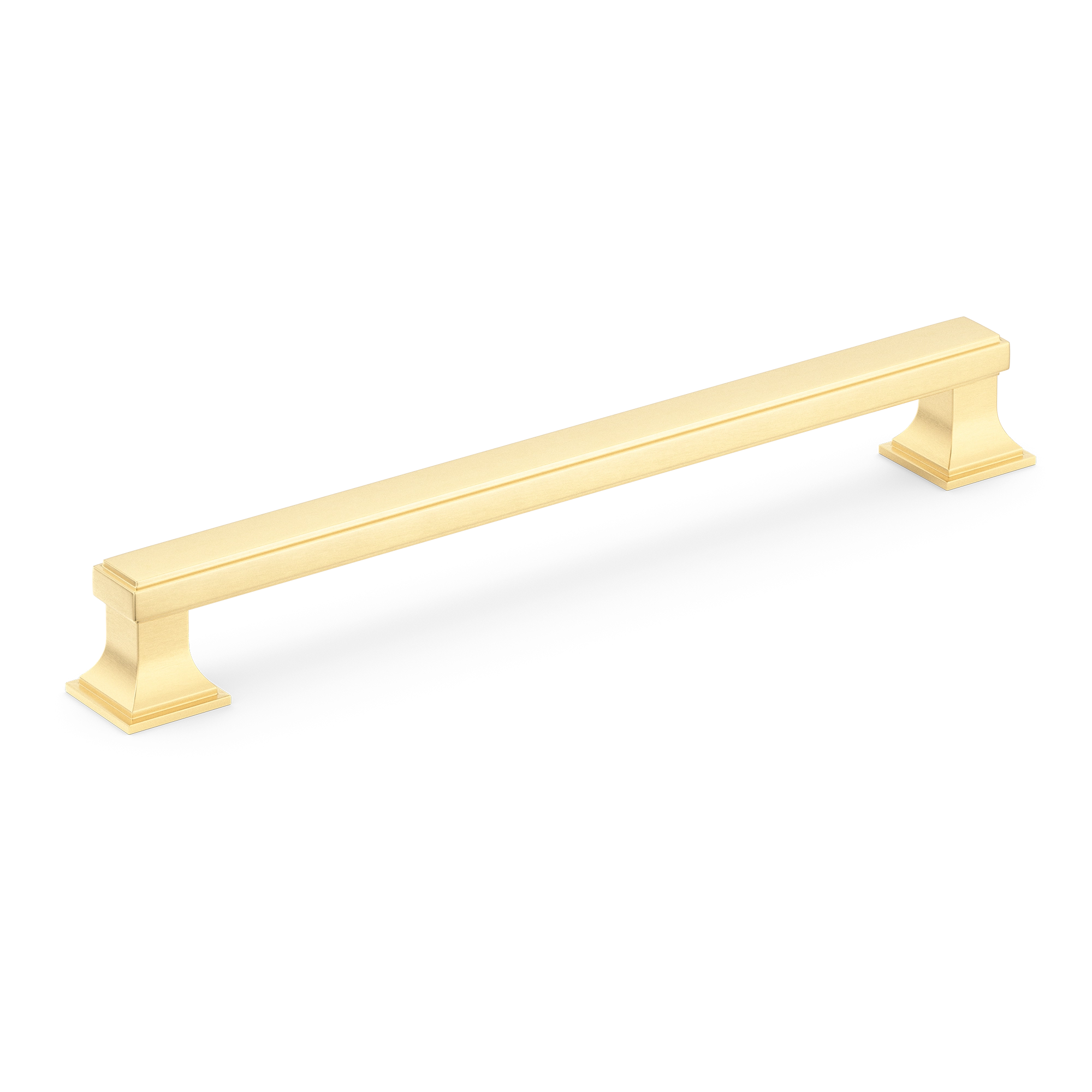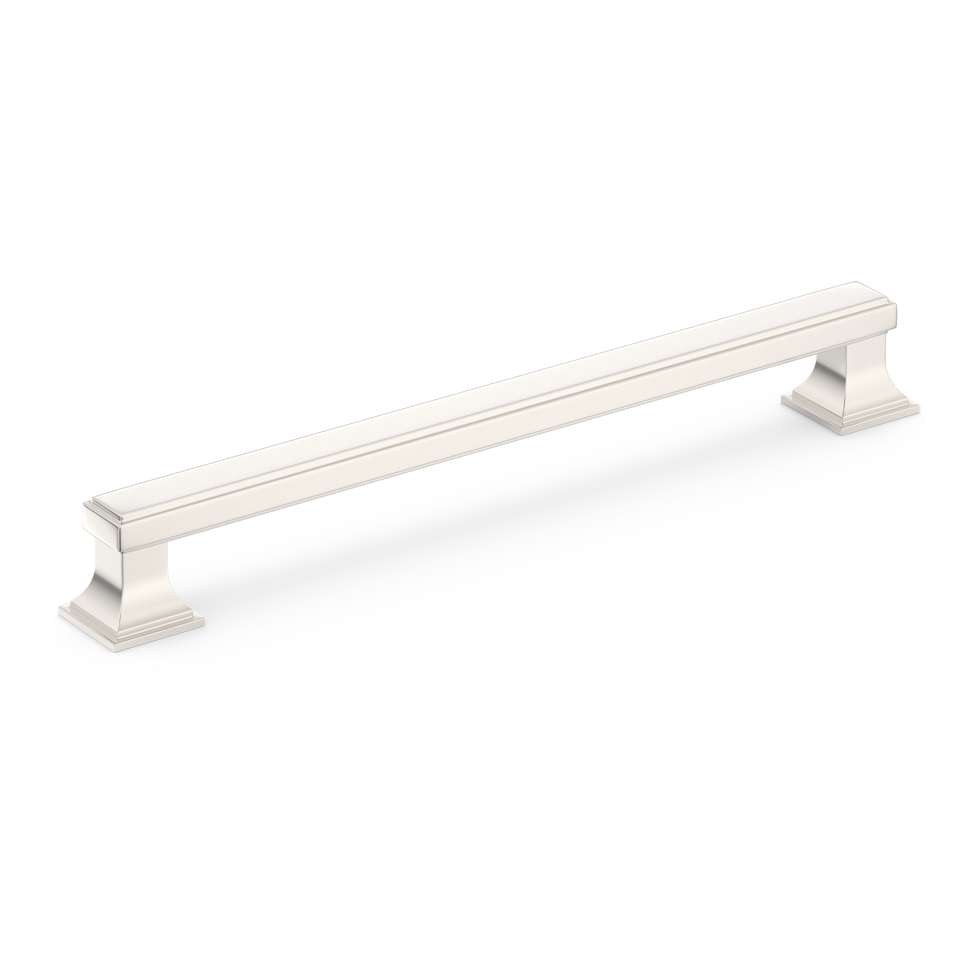 This cabinet/drawer pull is a stylish and functional addition to any furniture. It features a long rectangular central bar with a subtle groove and decorative pedestal – like supports on either end. Made of metal, it comes in various metallic finishes, suitable for kitchen, bedroom, and bathroom cabinetry.