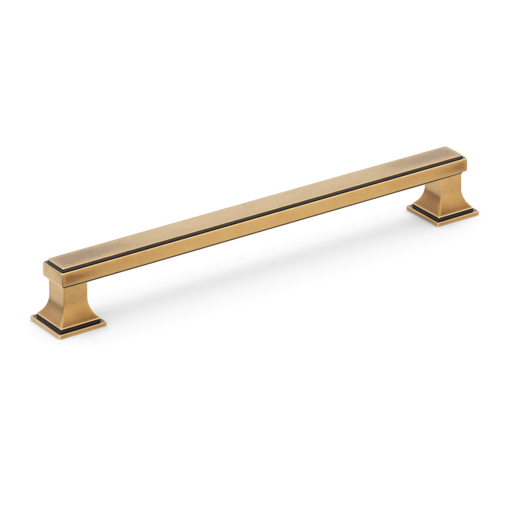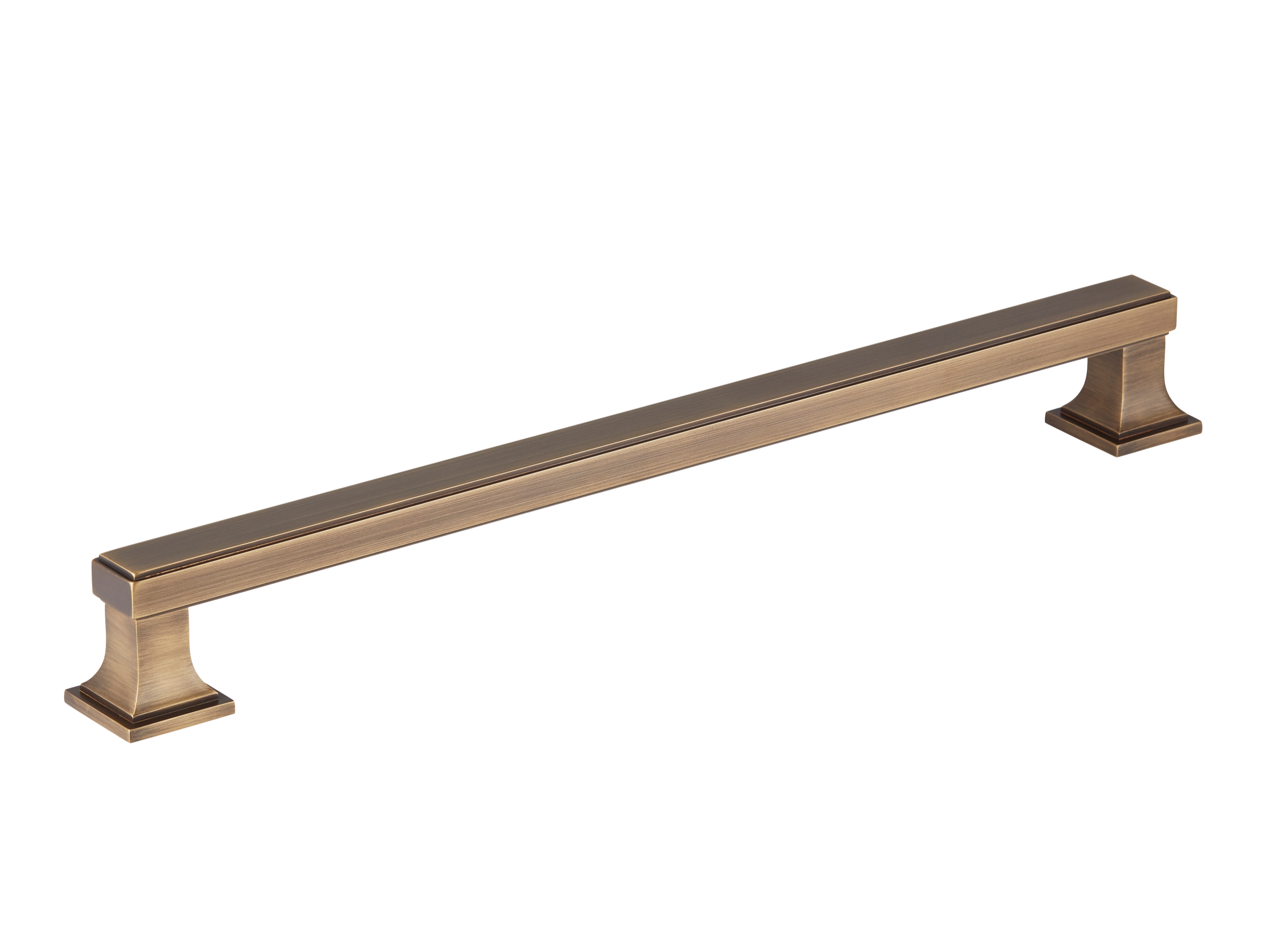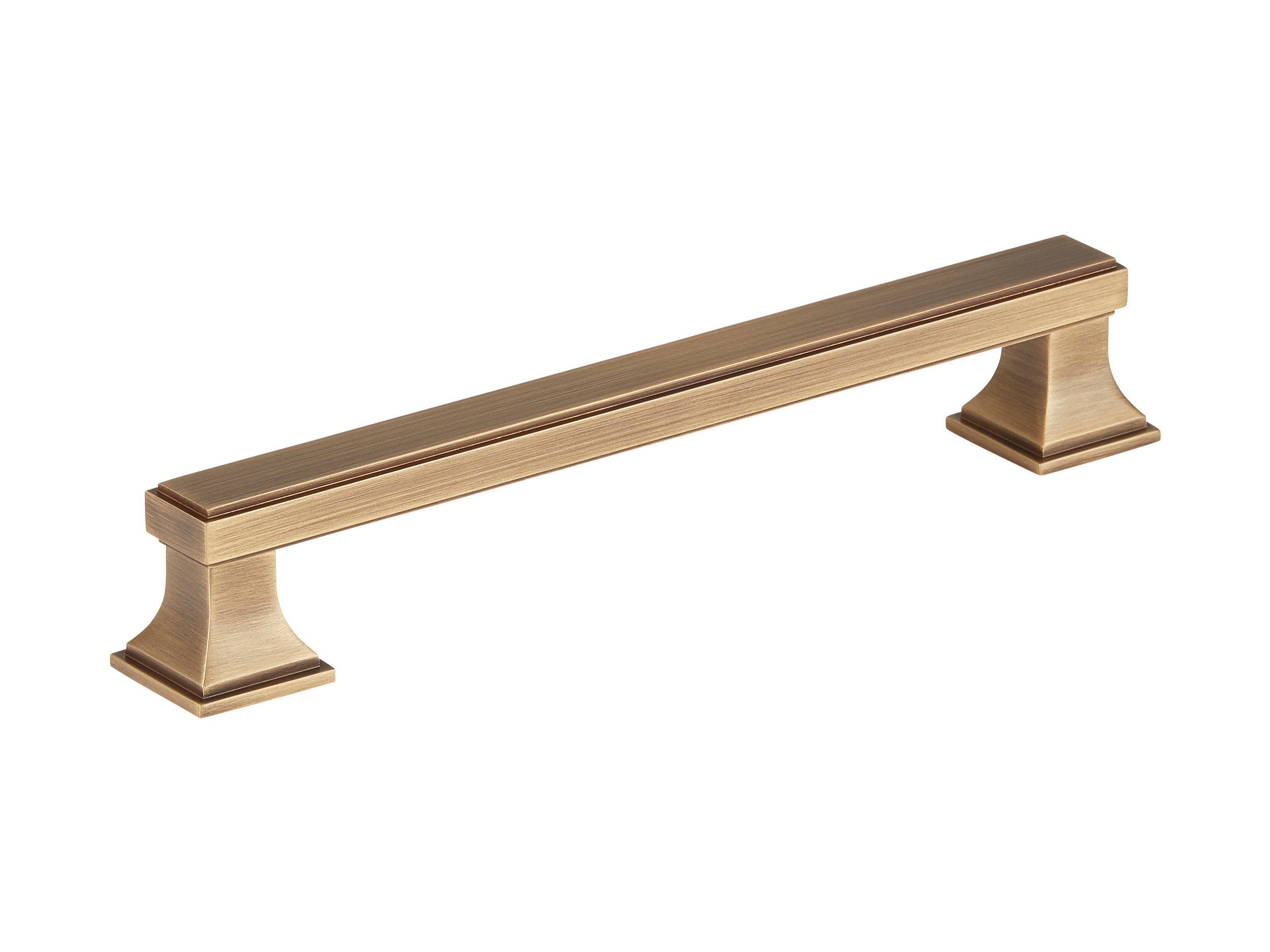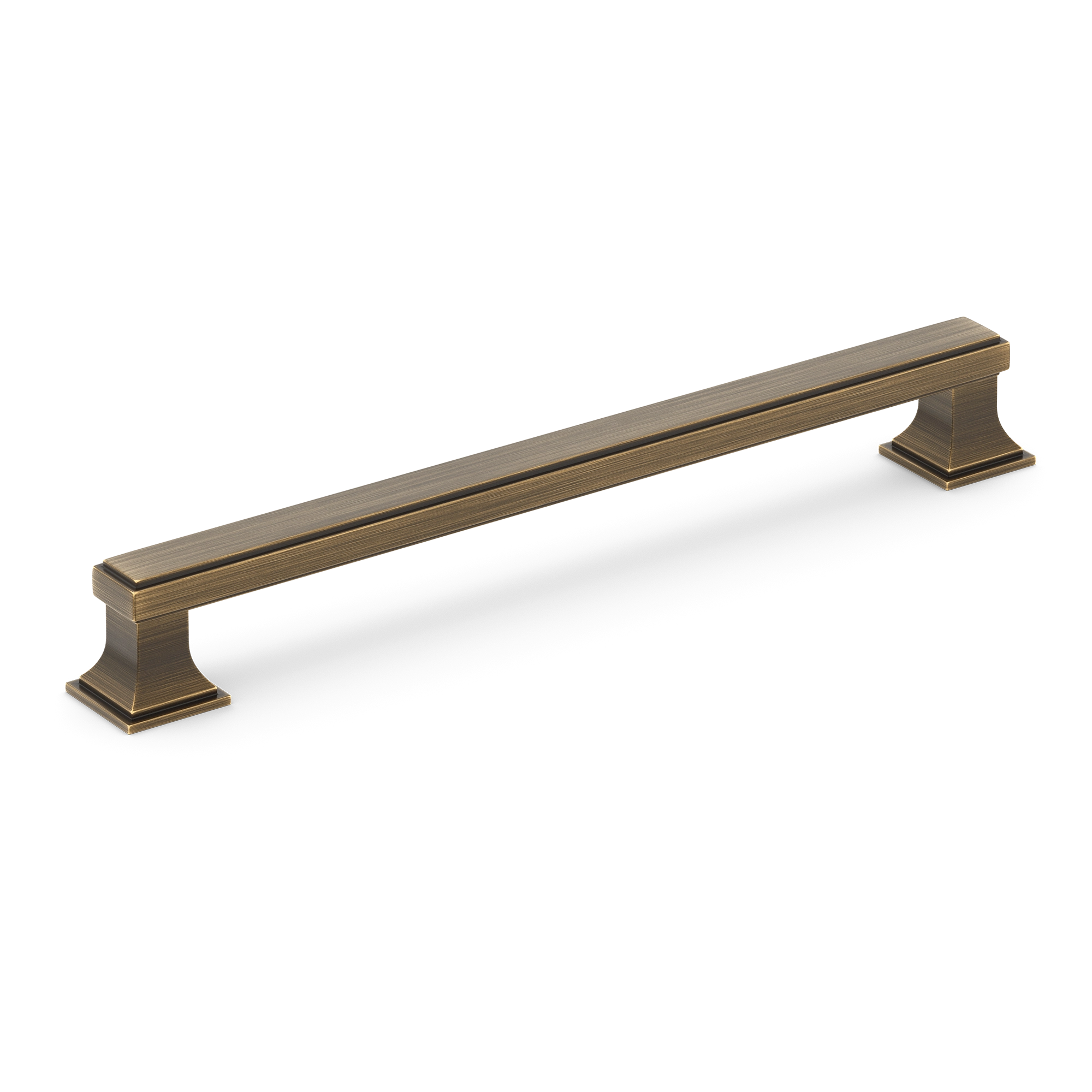 This cabinet/drawer pull is a stylish and functional addition to any furniture. It features a long rectangular central bar with a subtle groove and decorative pedestal – like supports on either end. Made of metal, it comes in various metallic finishes, suitable for kitchen, bedroom, and bathroom cabinetry.