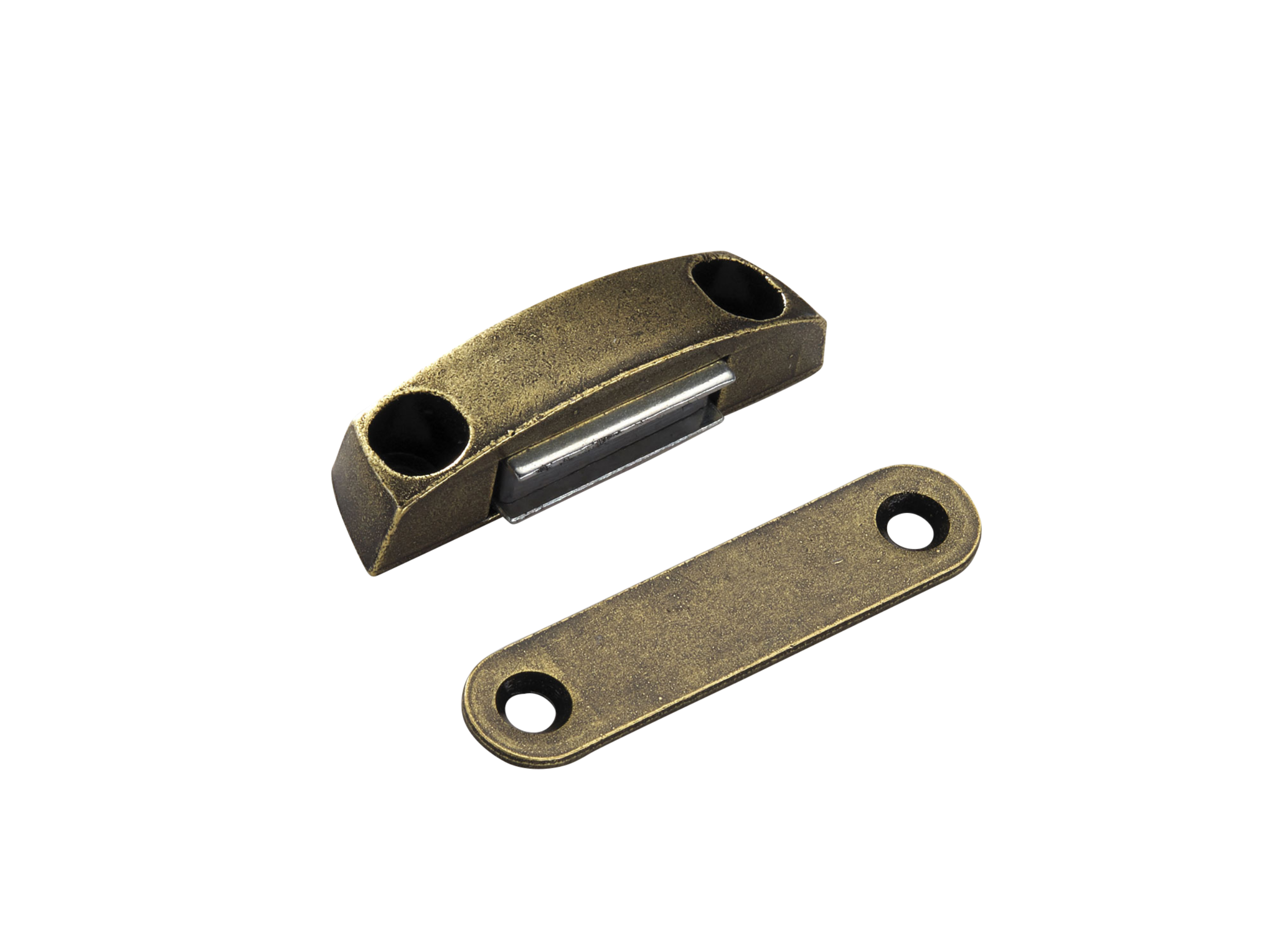 This magnetic door catch is a reliable solution for keeping doors securely closed. It consists of a curved magnetic housing and a flat mounting plate, both made of metallic materials. With multiple finish options available, it can seamlessly integrate into various furniture and cabinetry styles.