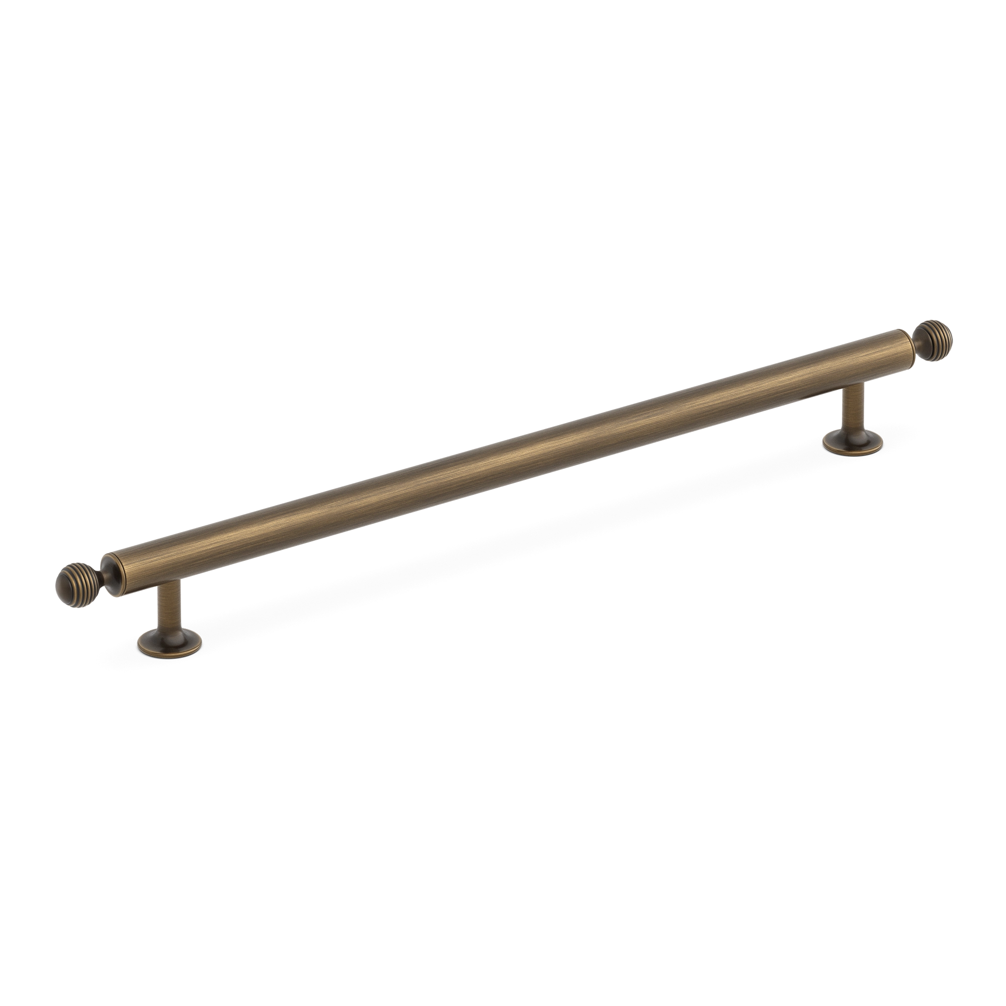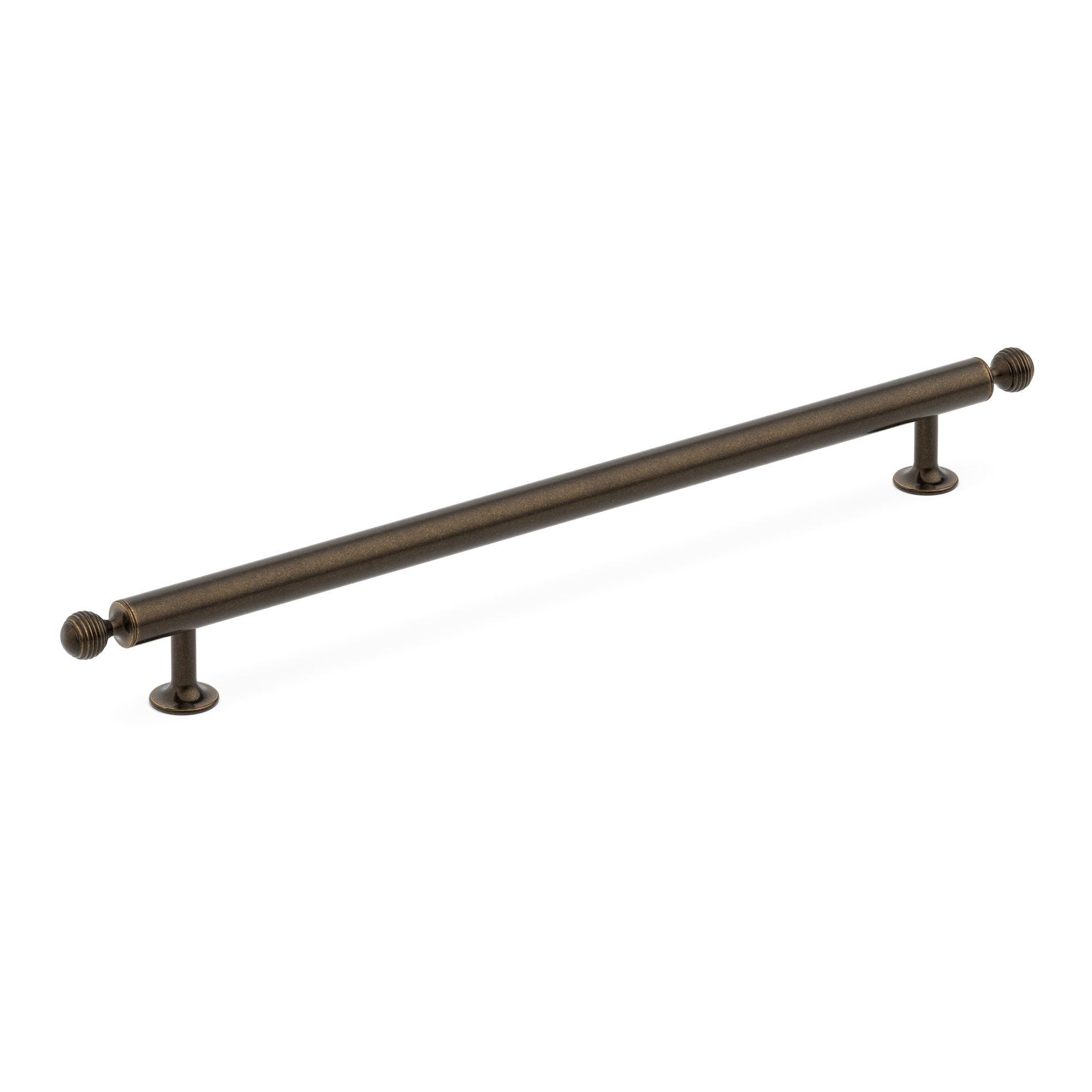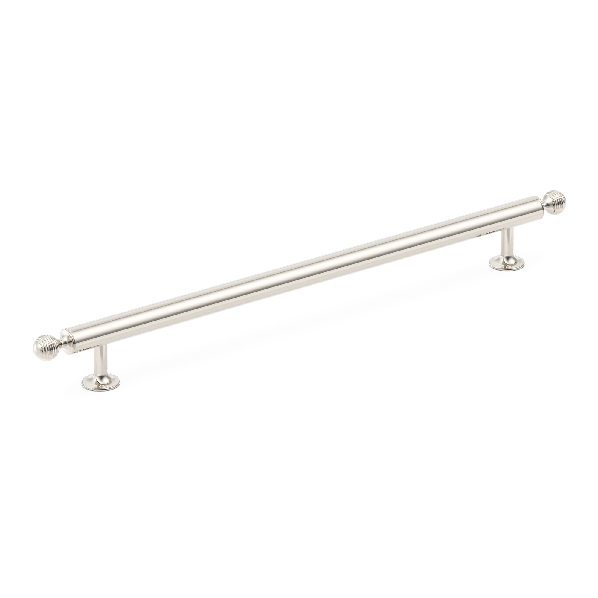 This cabinet/drawer pull is a high – quality metal appliance pull. It features a long, horizontal cylindrical bar with knurled end caps and vertical mounting stanchions. It is designed to add a decorative touch while being highly functional for pulling open drawers, cabinets, or doors in various settings like kitchens and bathrooms.