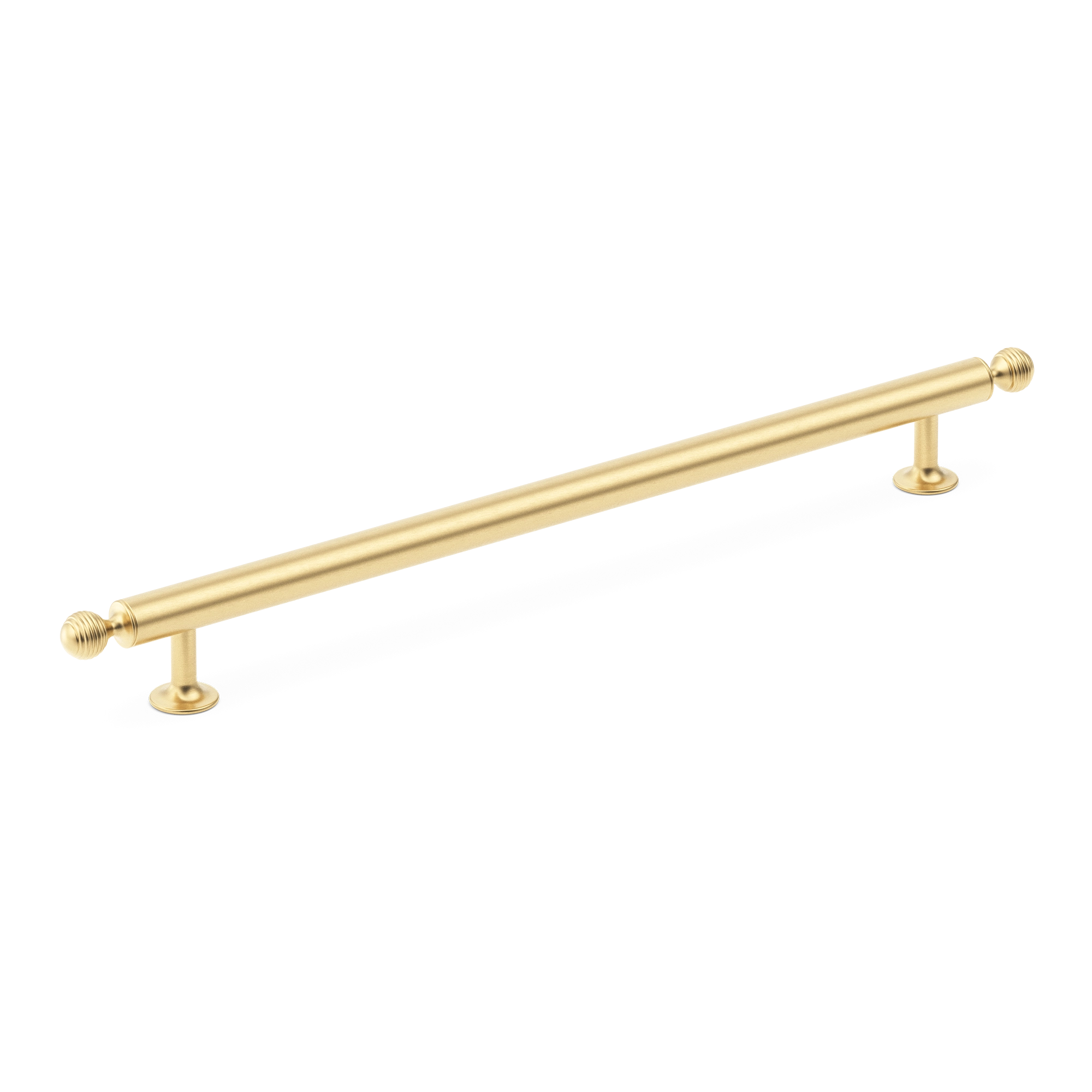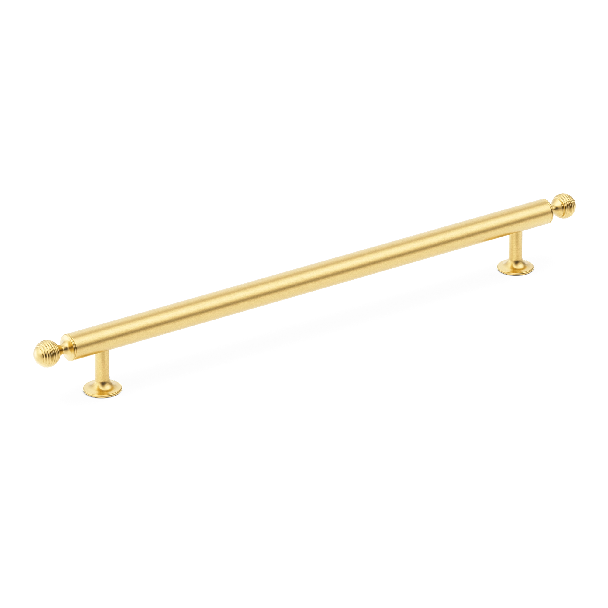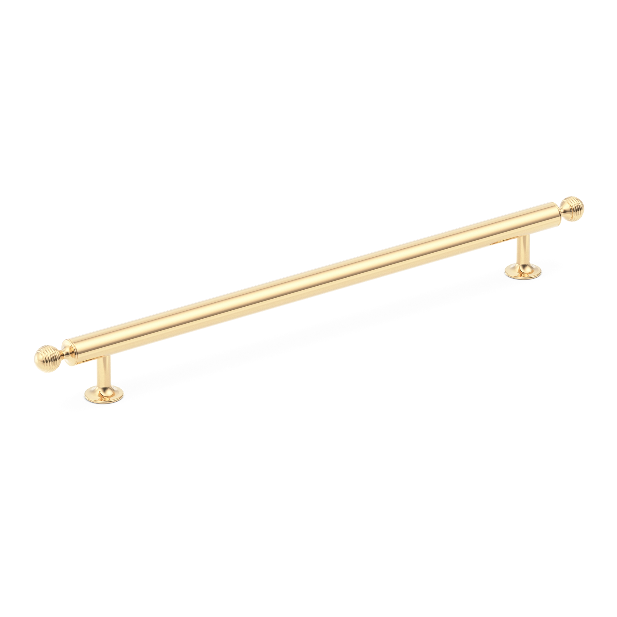 This cabinet/drawer pull is a high – quality metal appliance pull. It features a long, horizontal cylindrical bar with knurled end caps and vertical mounting stanchions. It is designed to add a decorative touch while being highly functional for pulling open drawers, cabinets, or doors in various settings like kitchens and bathrooms.