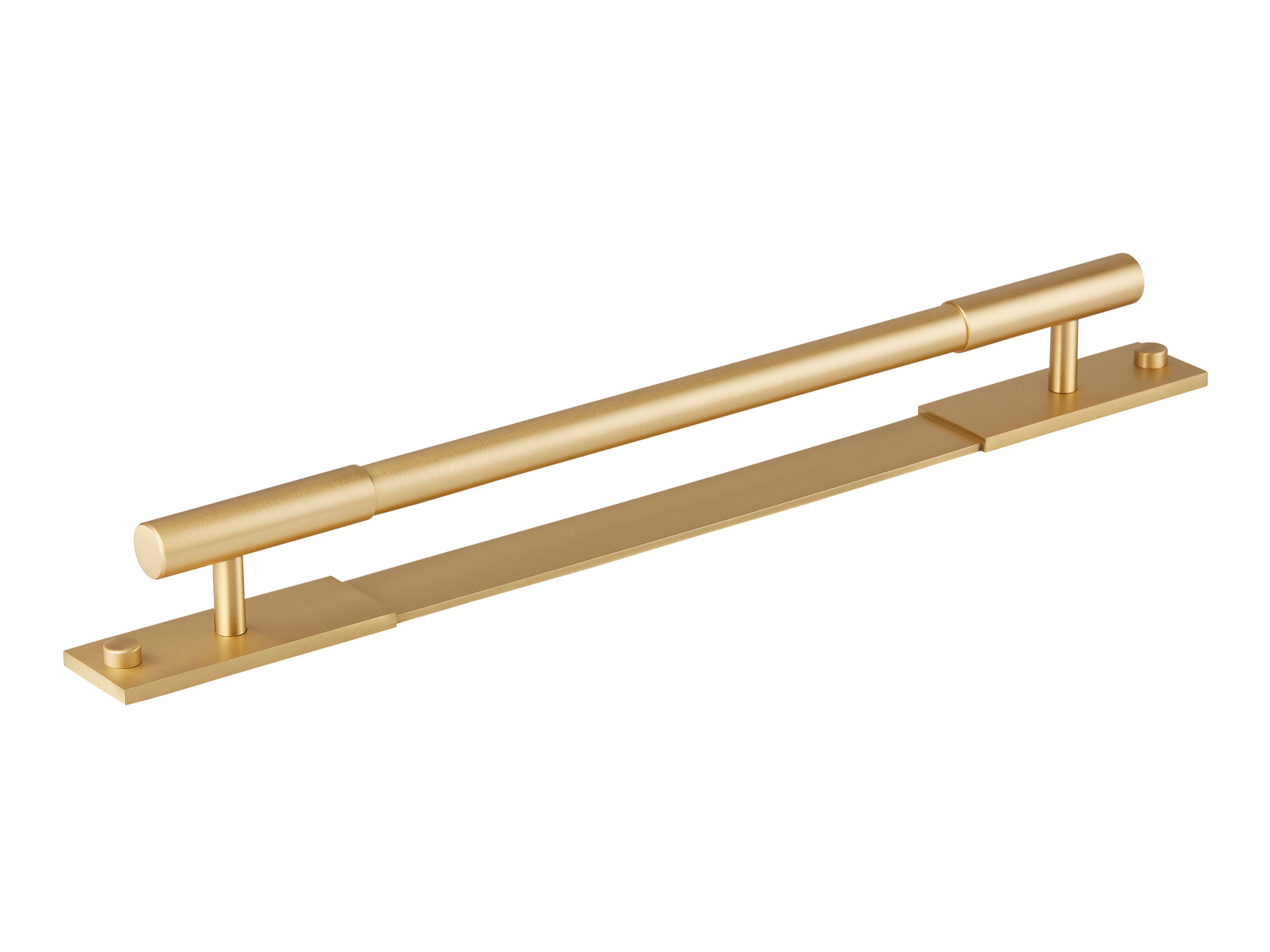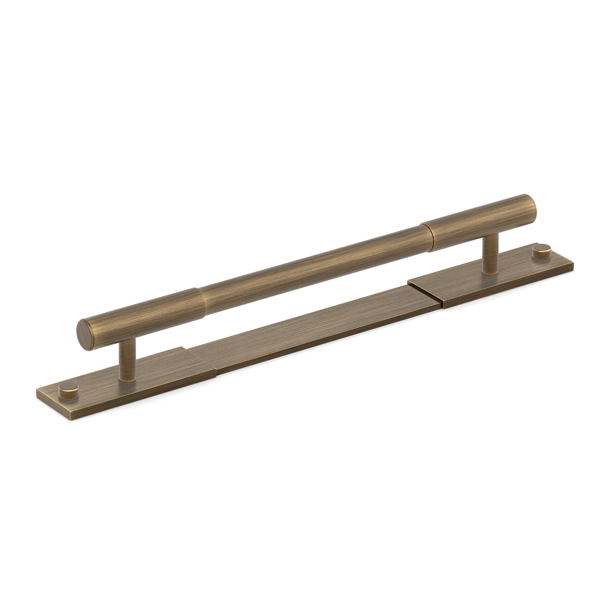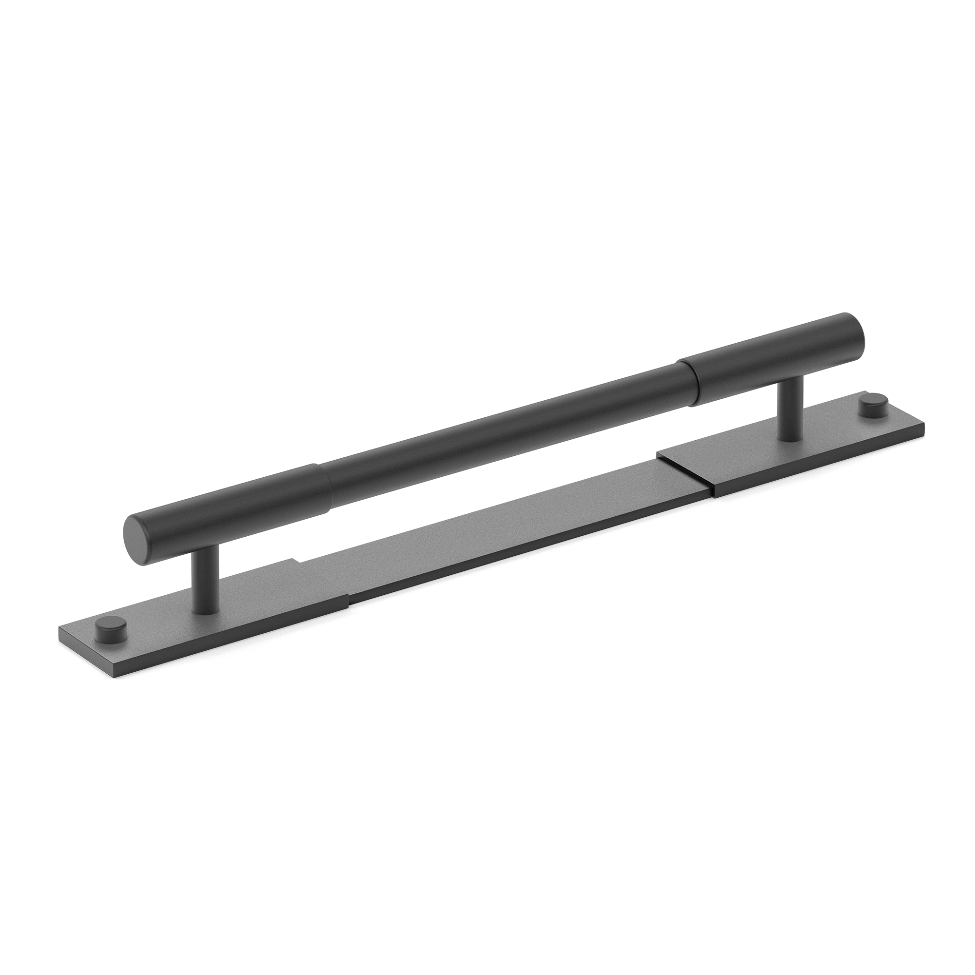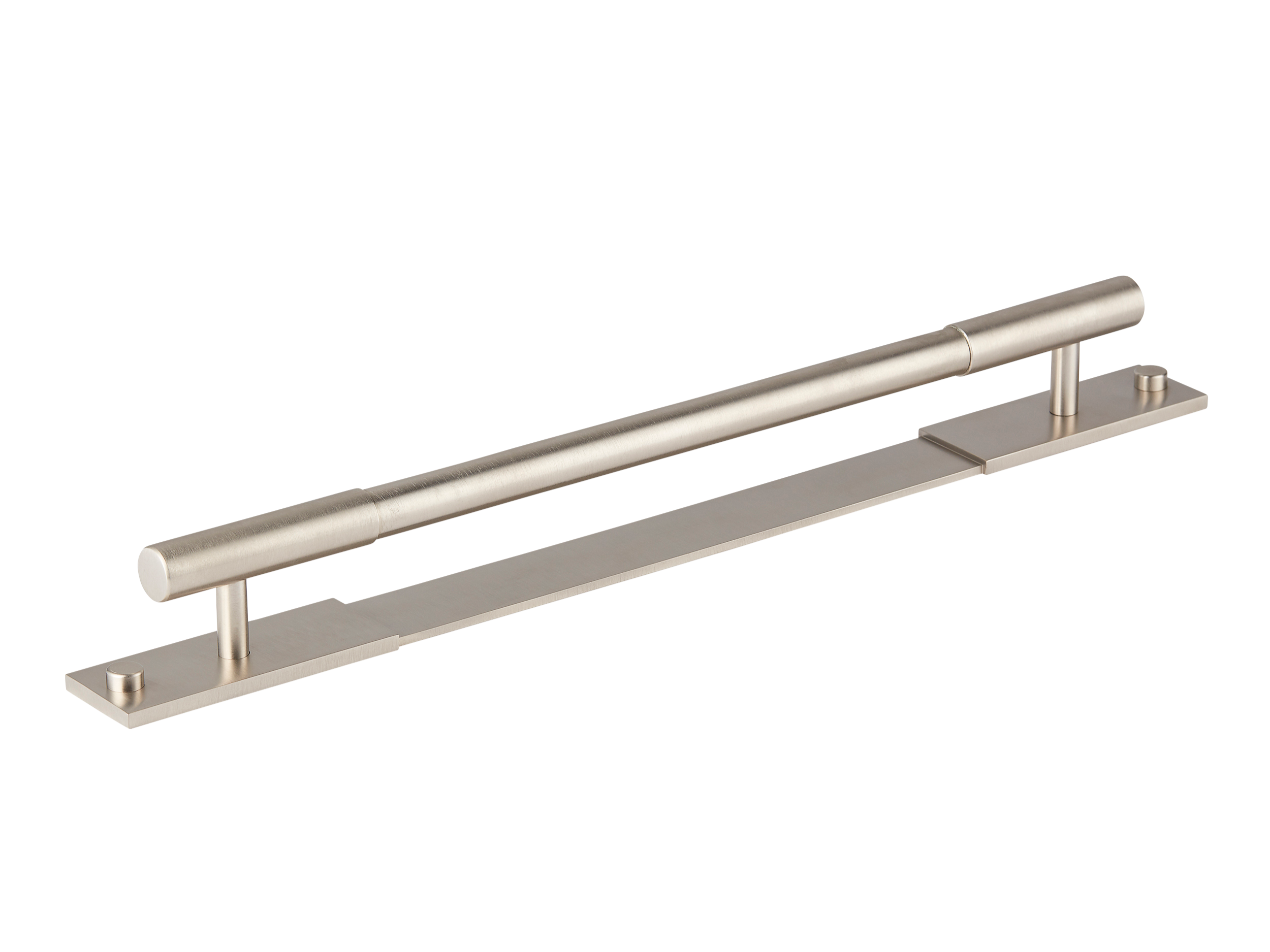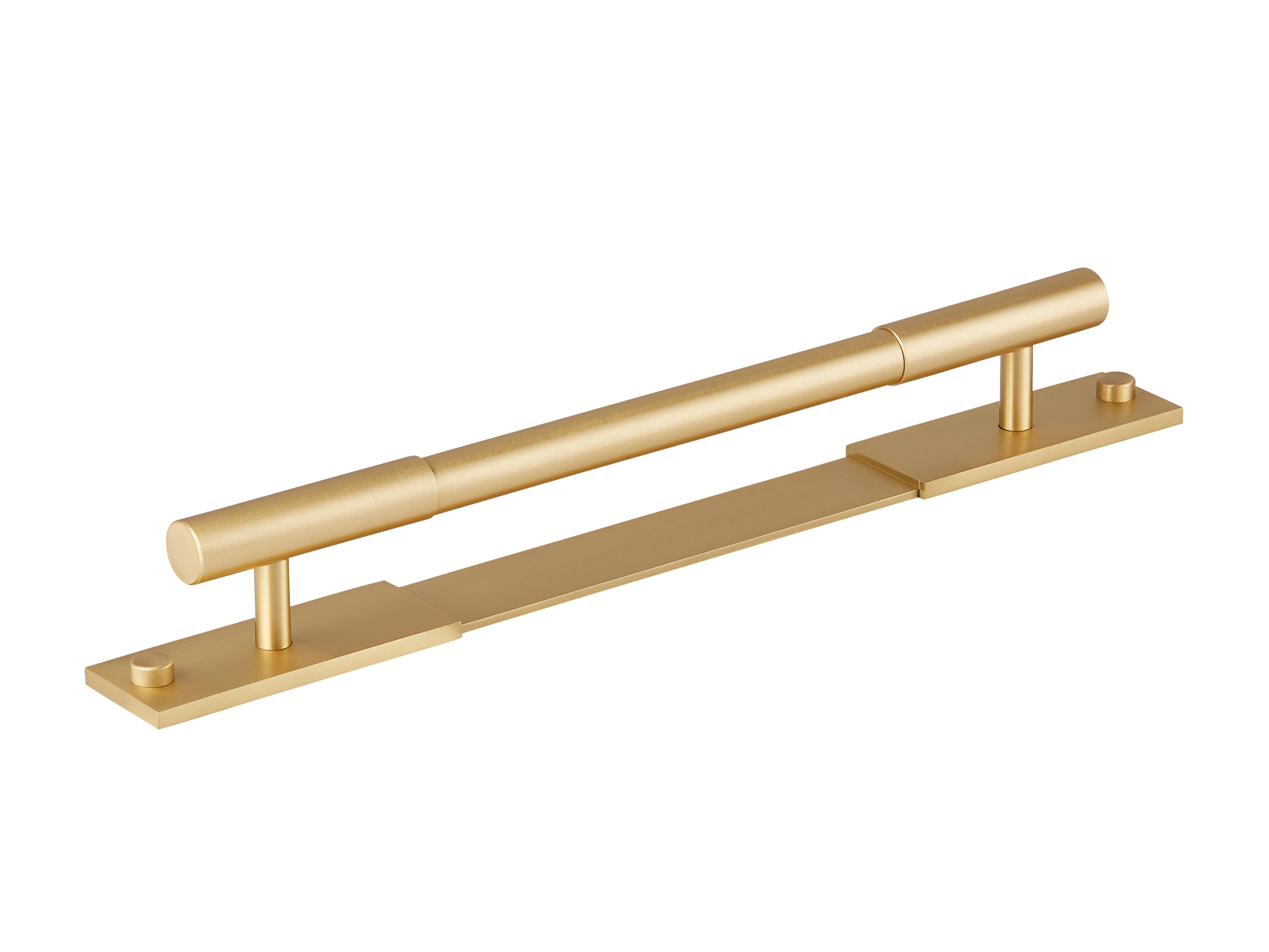 This minimalist segmented door pull handle is a great addition to any space. It features a long, horizontal cylindrical bar supported by vertical pillars on a rectangular base plate. The handle is made of a metallic alloy with a smooth, brushed finish, and comes in multiple color variations, offering both functionality and a modern, upscale look.