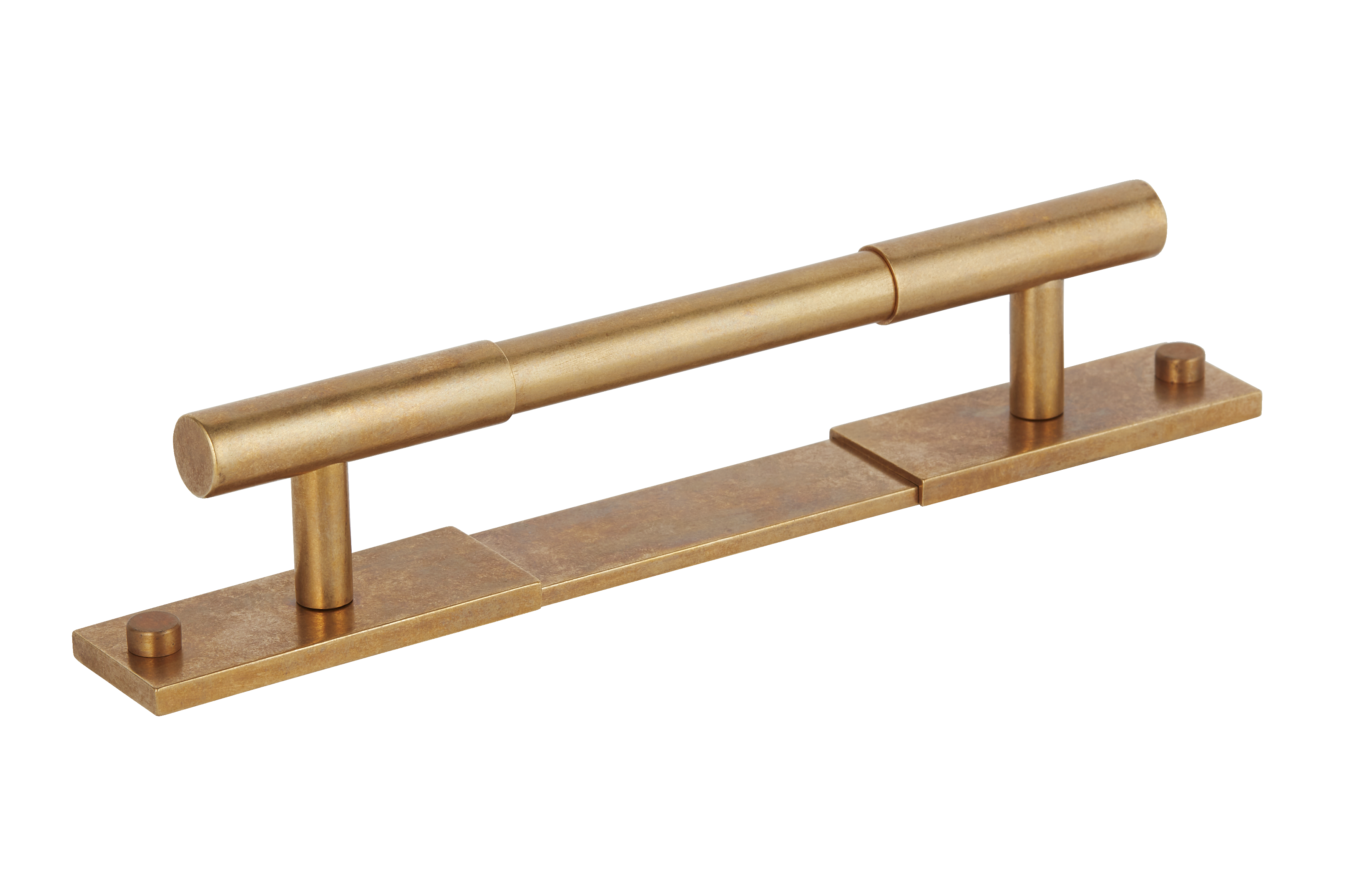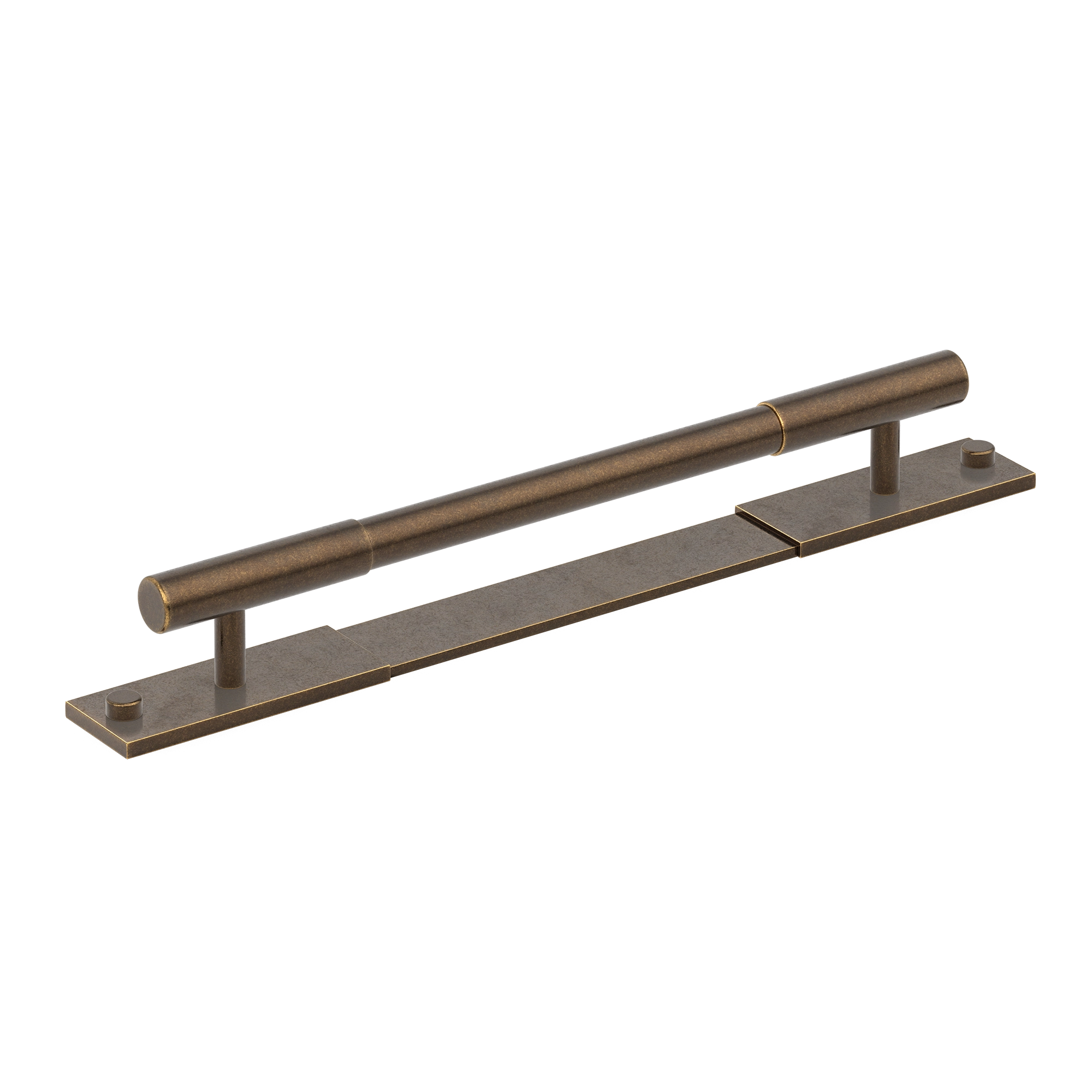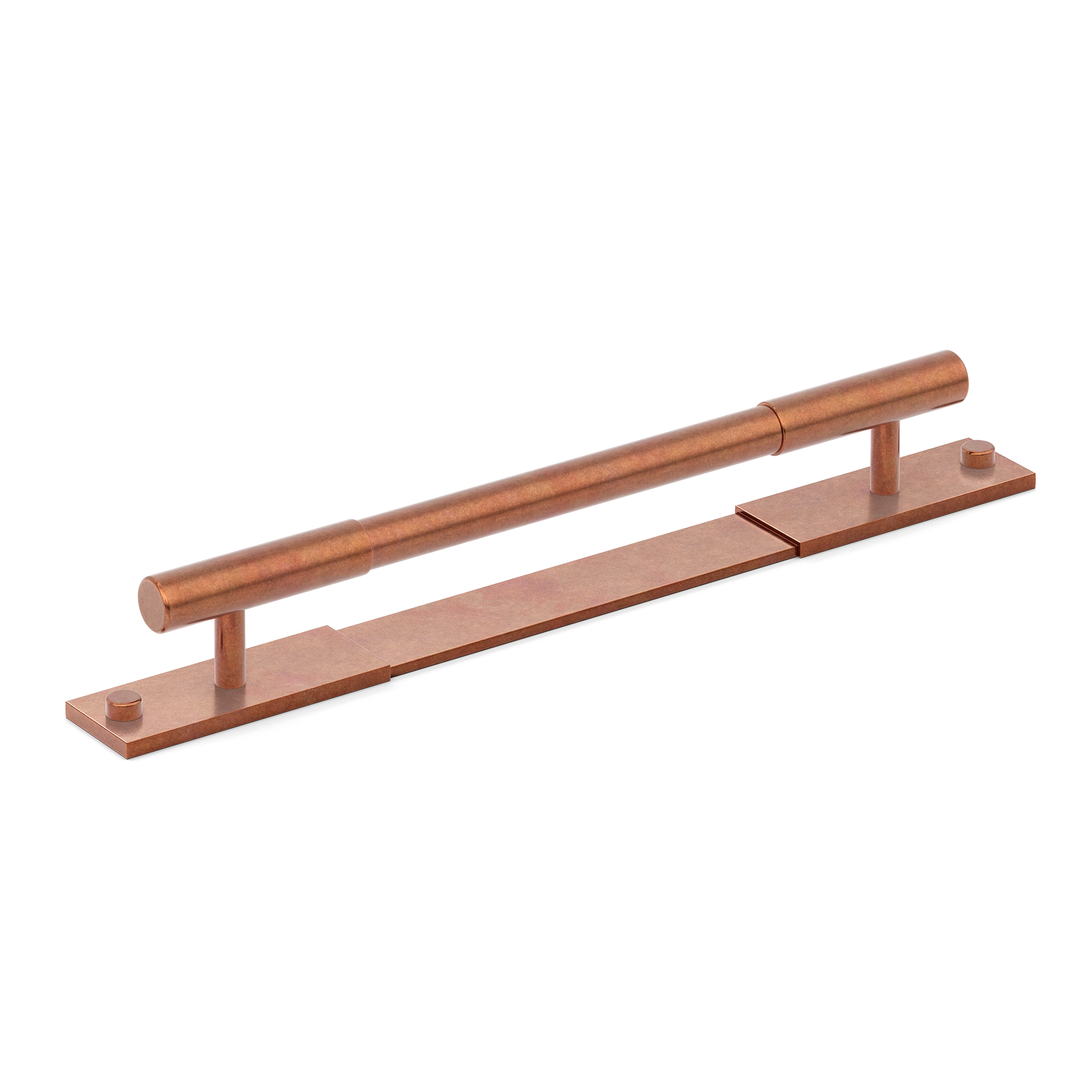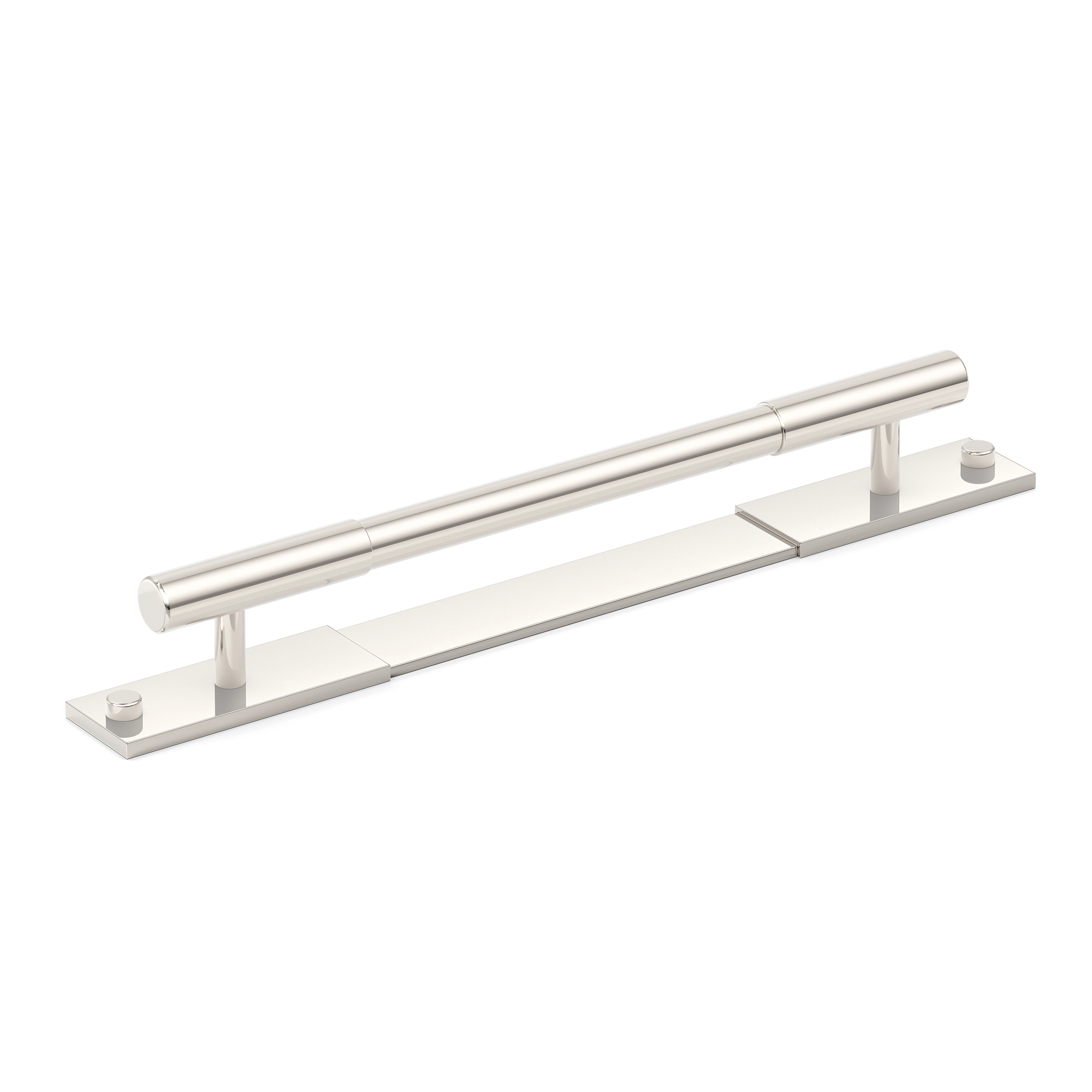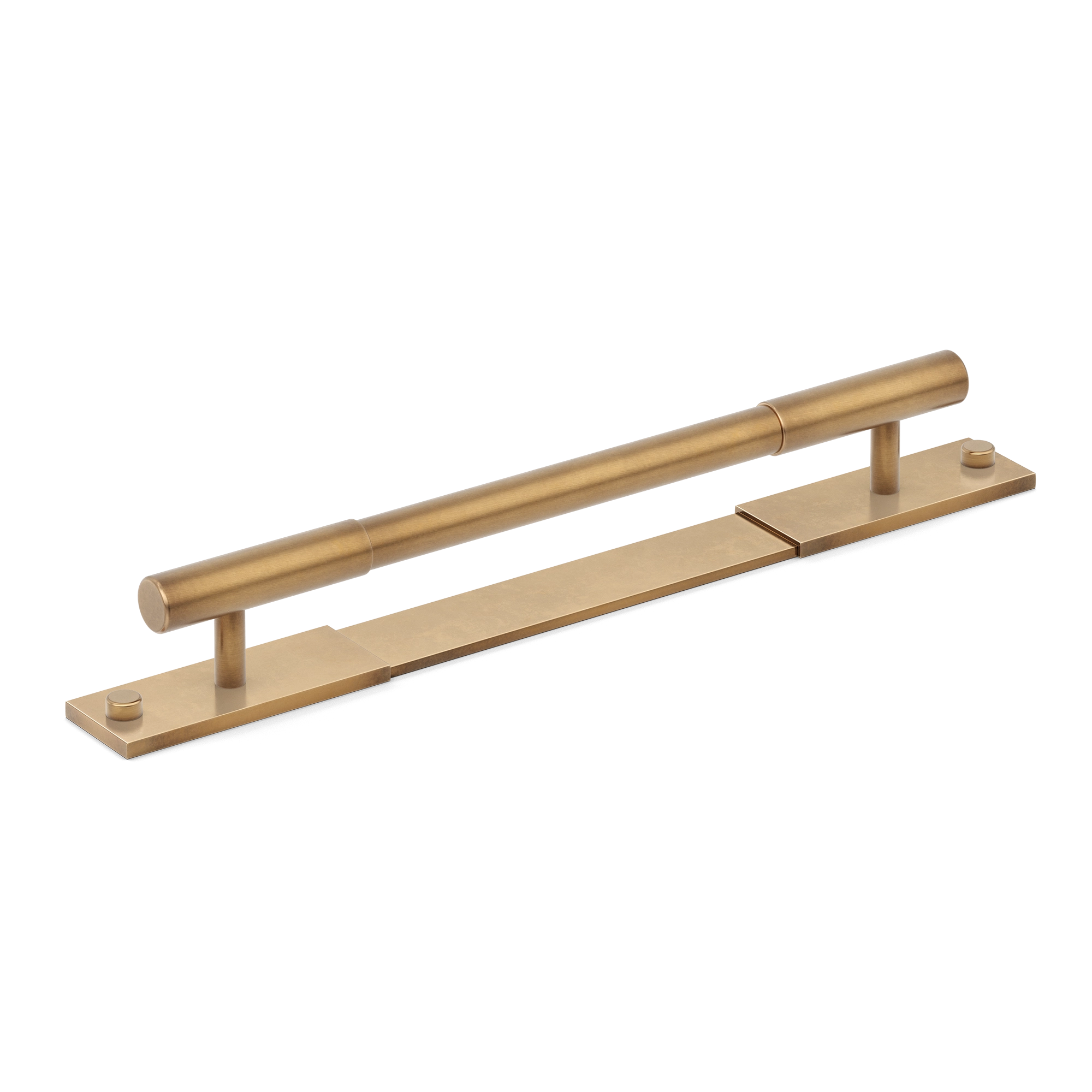 This minimalist segmented door pull handle is a great addition to any space. It features a long, horizontal cylindrical bar supported by vertical pillars on a rectangular base plate. The handle is made of a metallic alloy with a smooth, brushed finish, and comes in multiple color variations, offering both functionality and a modern, upscale look.