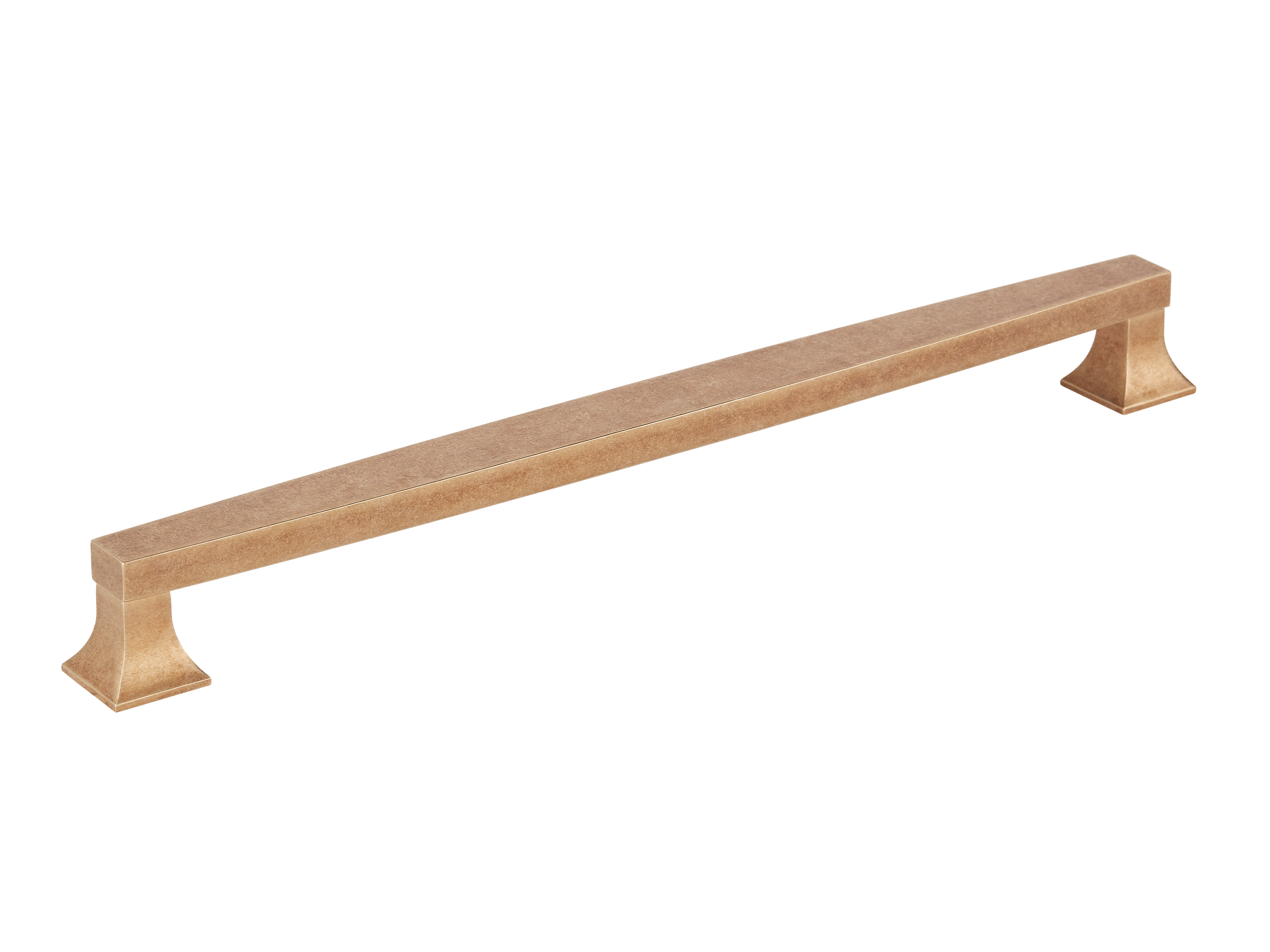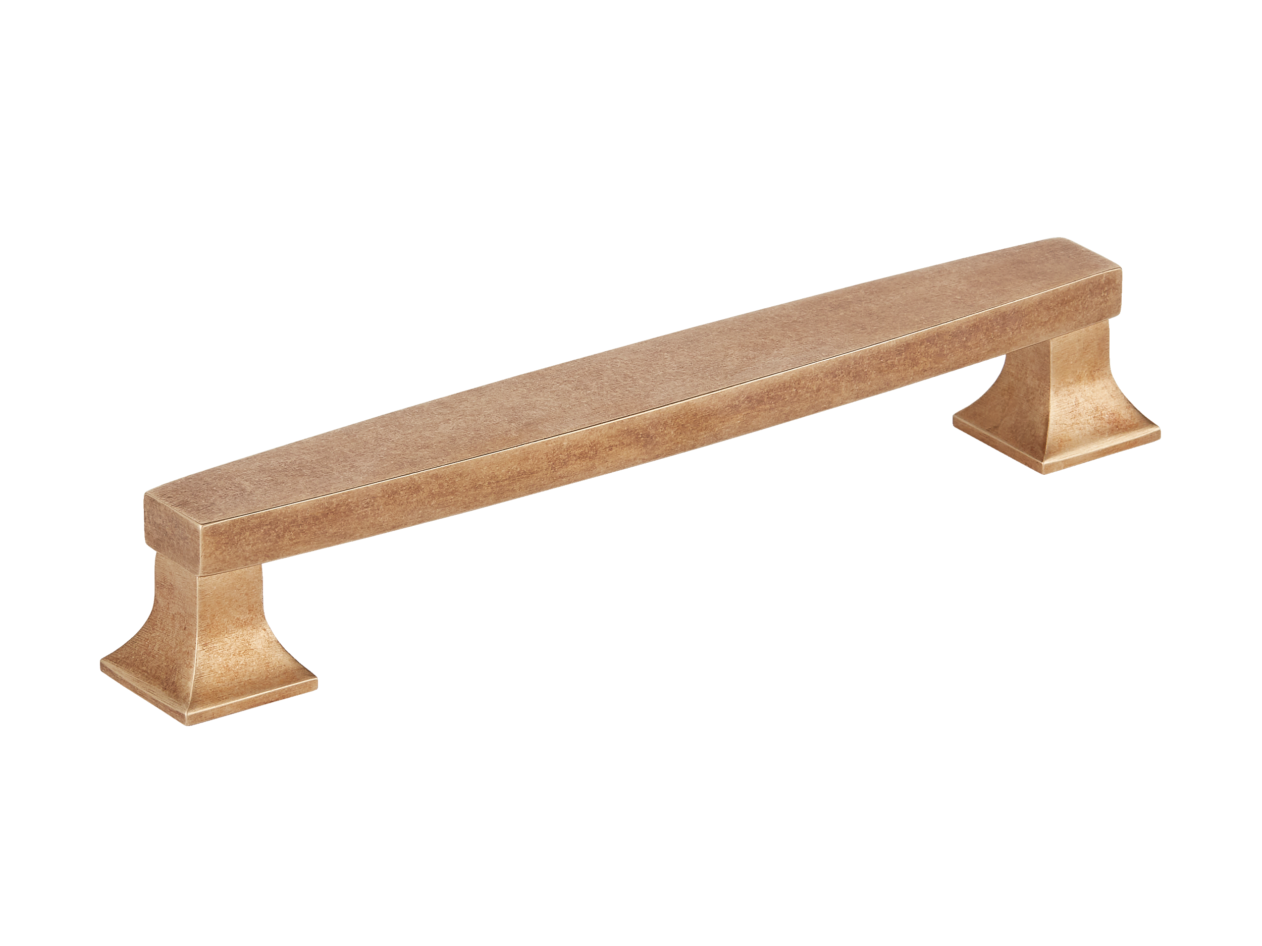 This cabinet/drawer handle features a minimalist design with a long, rectangular bar and square, tapered pedestal bases. Made of a metallic material, it comes in a warm, gold or brass tone. The handle offers multiple finish options and is suitable for wide or heavy cabinet doors and drawers.