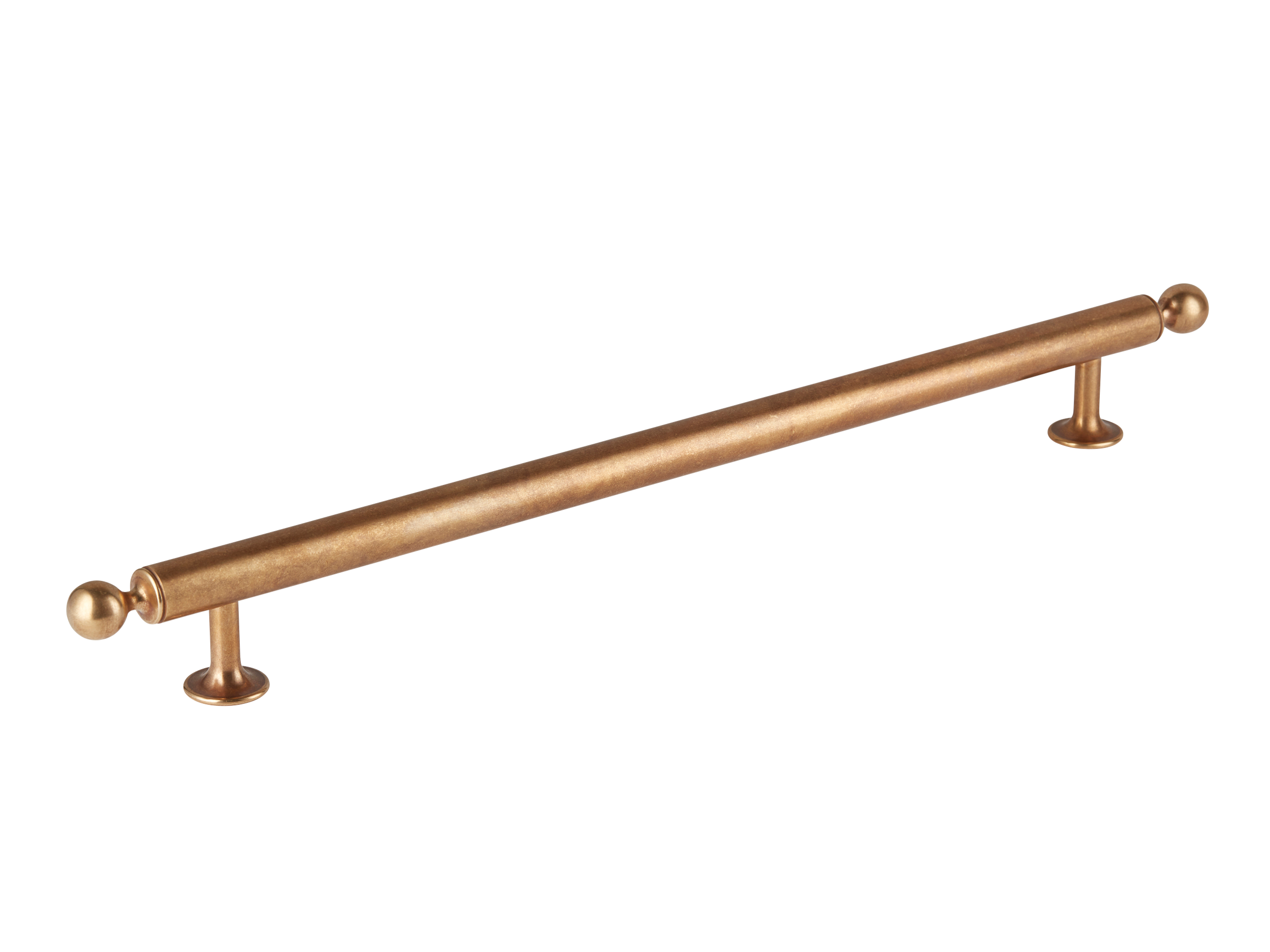This cabinet pull handle is crafted from metal, likely a brass or gold-plated alloy. It features a long, slender central cylinder with ball finials on both ends and support posts for stability. The handle comes in different sizes and has a PBUL finish, suitable for adding an elegant touch to luxury furniture.