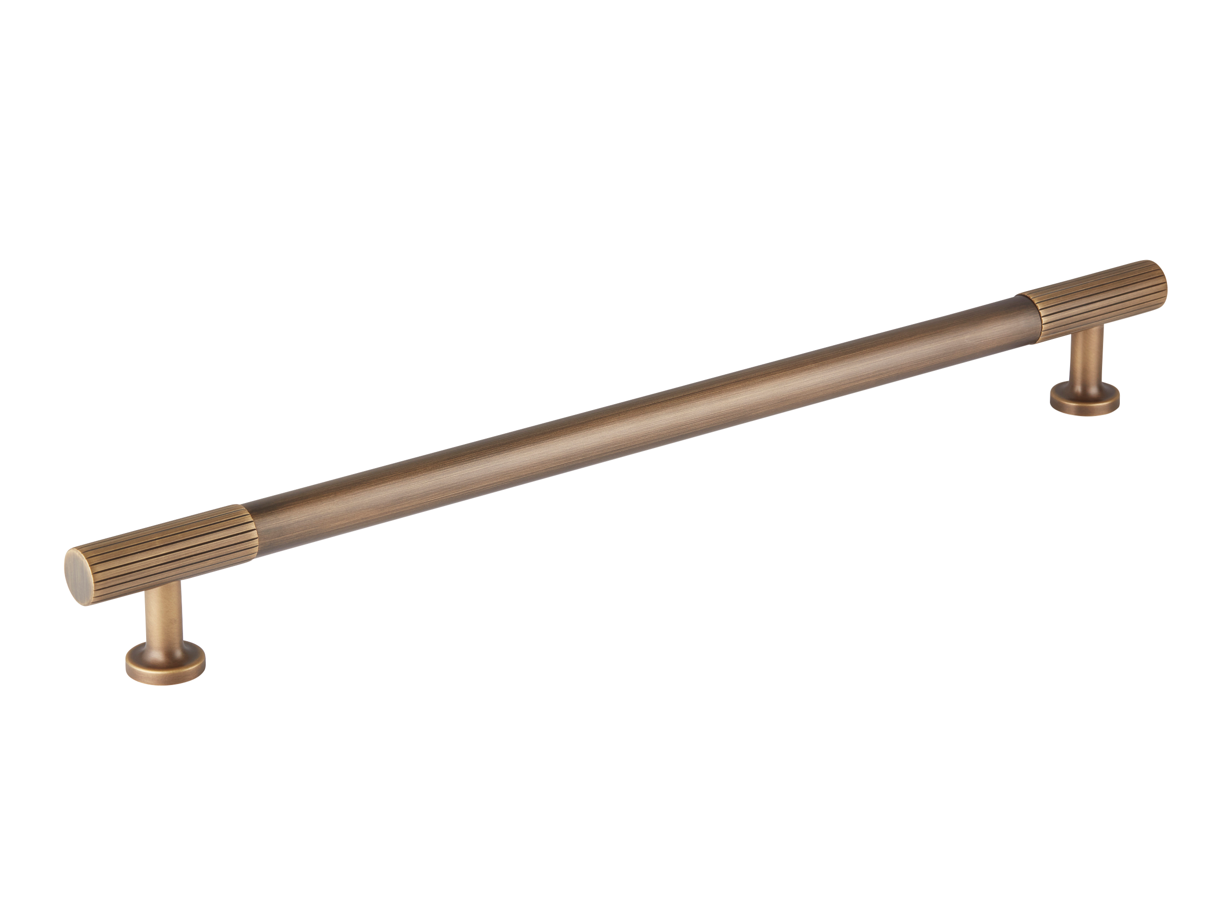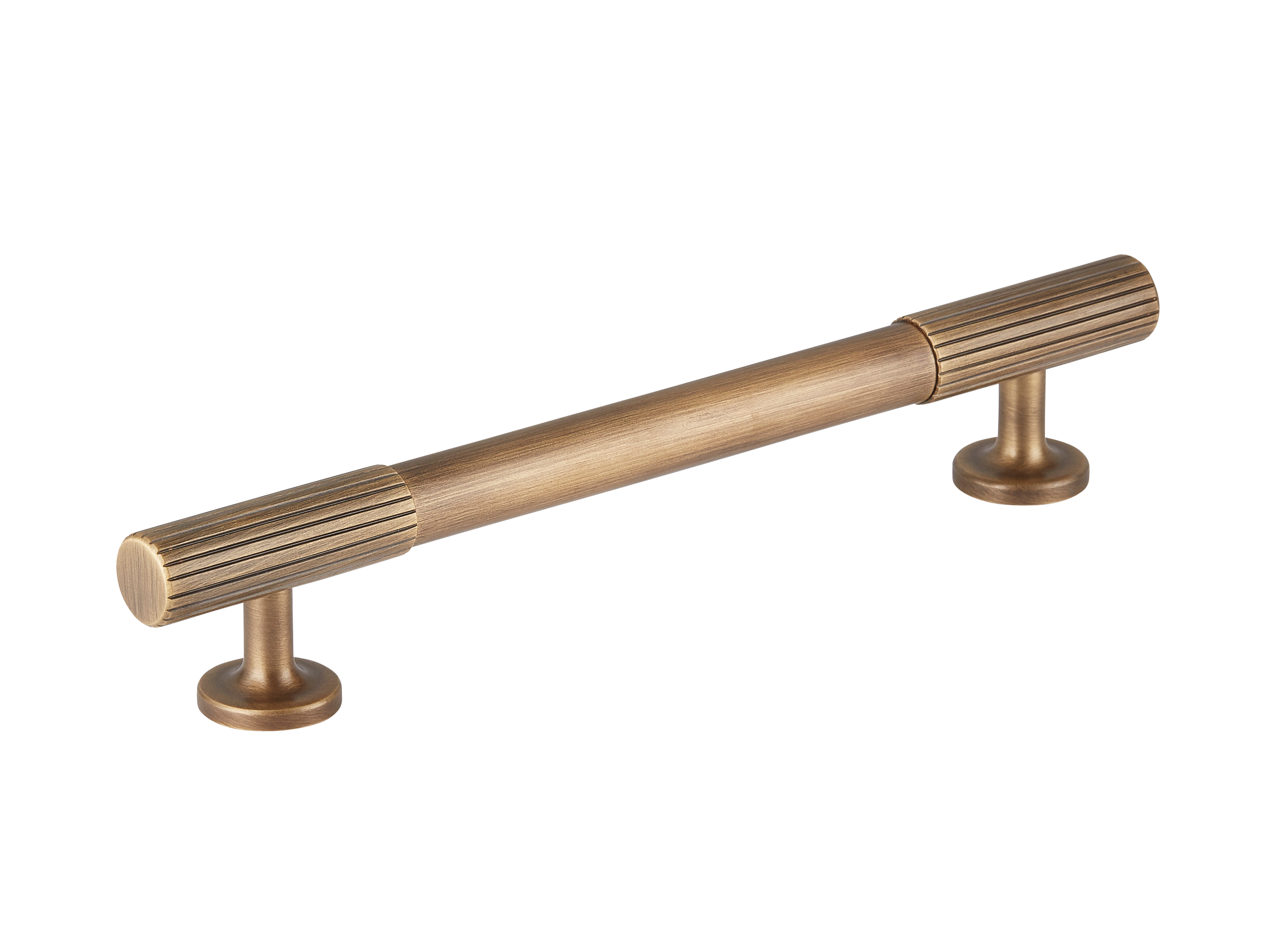 This cabinet or drawer pull is a piece of high – quality furniture hardware. It features a long central bar with smooth surfaces and fluted end caps, connected to circular mounting bases by vertical support rods. Available in golden and bronze finishes, it is both functional and adds a touch of modern luxury to furniture.