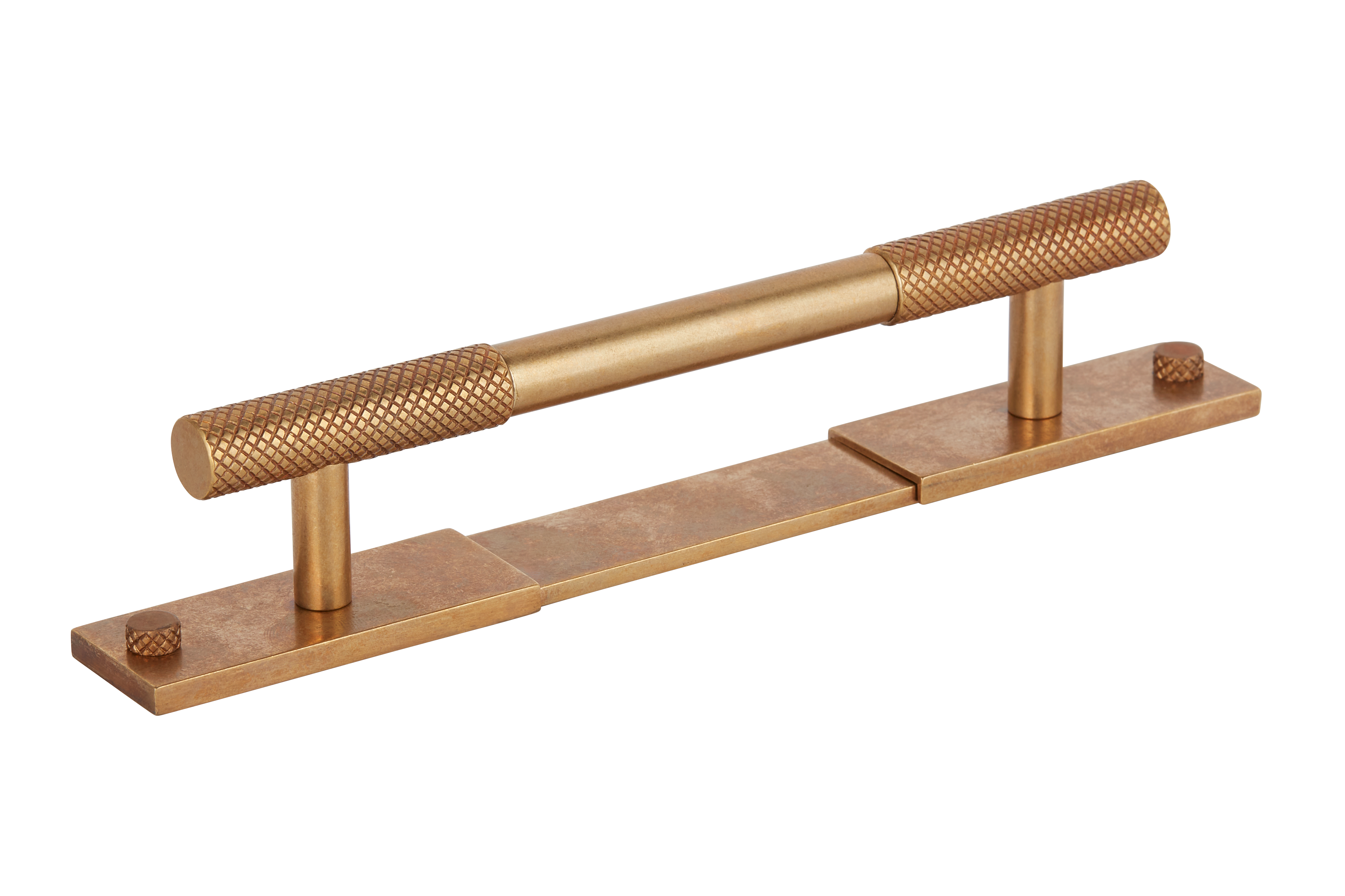 This product is a cabinet/drawer pull handle crafted from metal. It features a smooth central bar connecting two knurled end sections with a diamond – patterned knurling for grip. The handle comes in multiple color variations and has split base plates for mounting flexibility, making it a great addition to various furniture pieces.