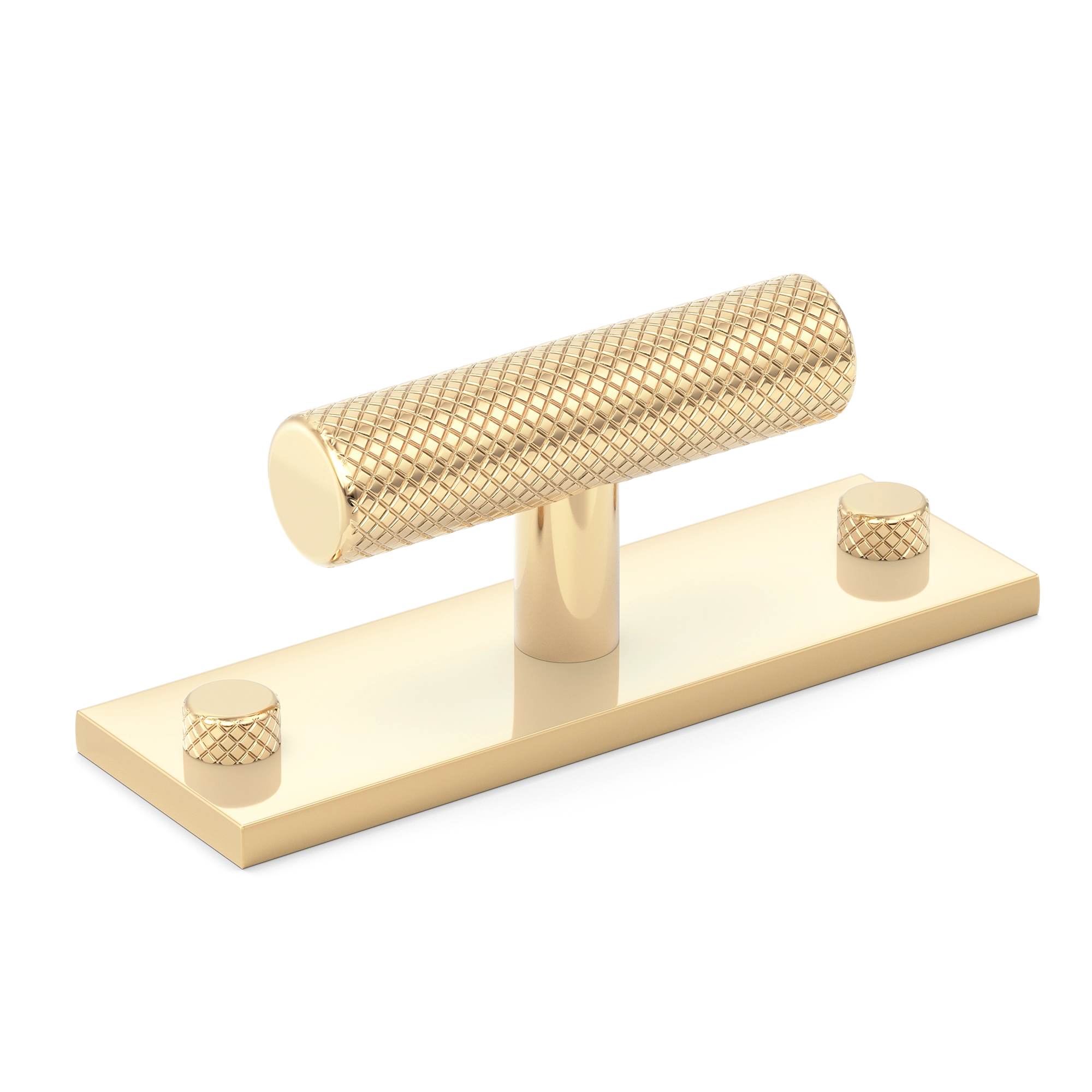 This product is a stylish decorative handle or pull. Crafted from polished metal with a bright, golden finish, it features a fluted central bar, vertical support, rectangular base plate, and decorative knobs. Ideal for use on doors, drawers, or cabinets, it adds both functionality and a touch of elegance.