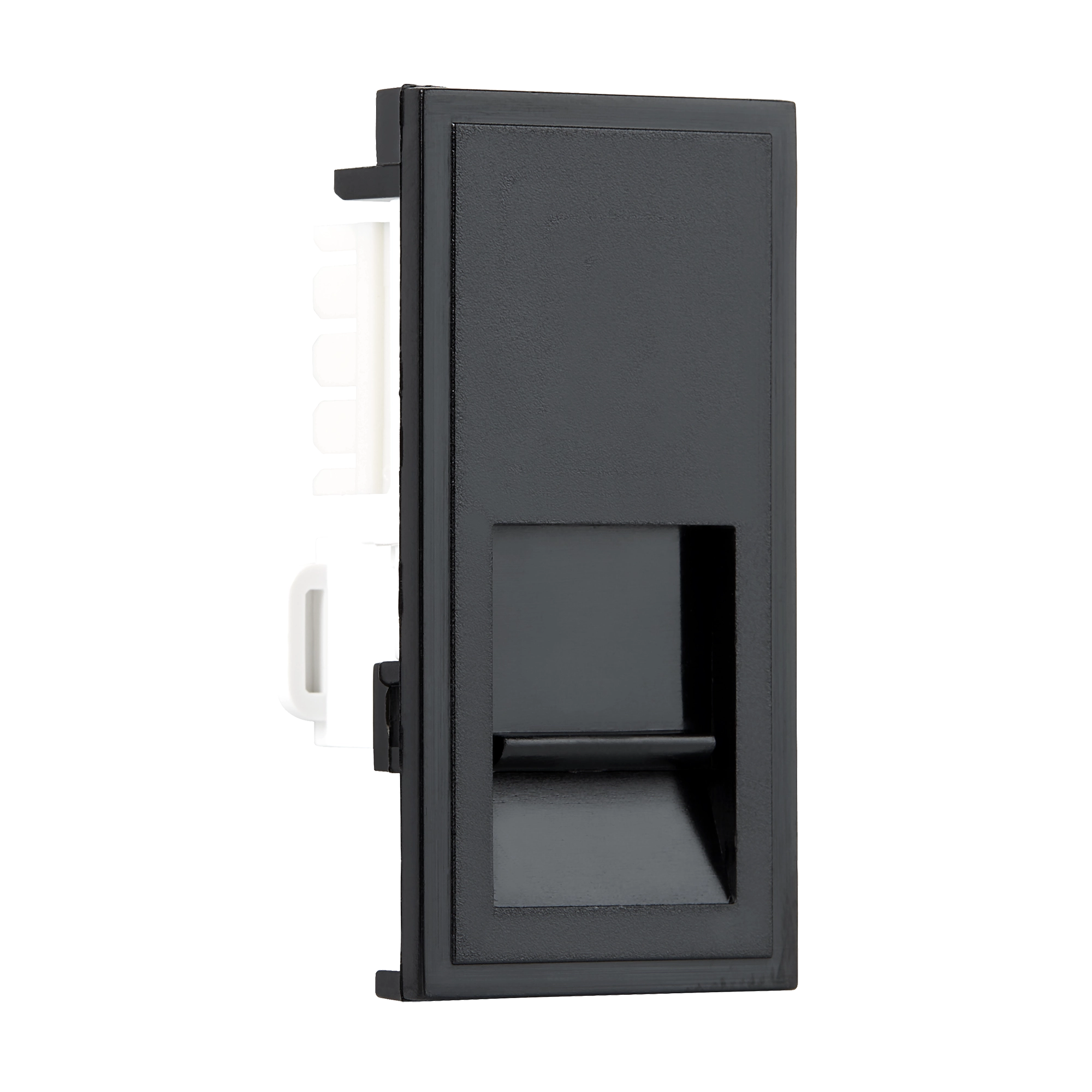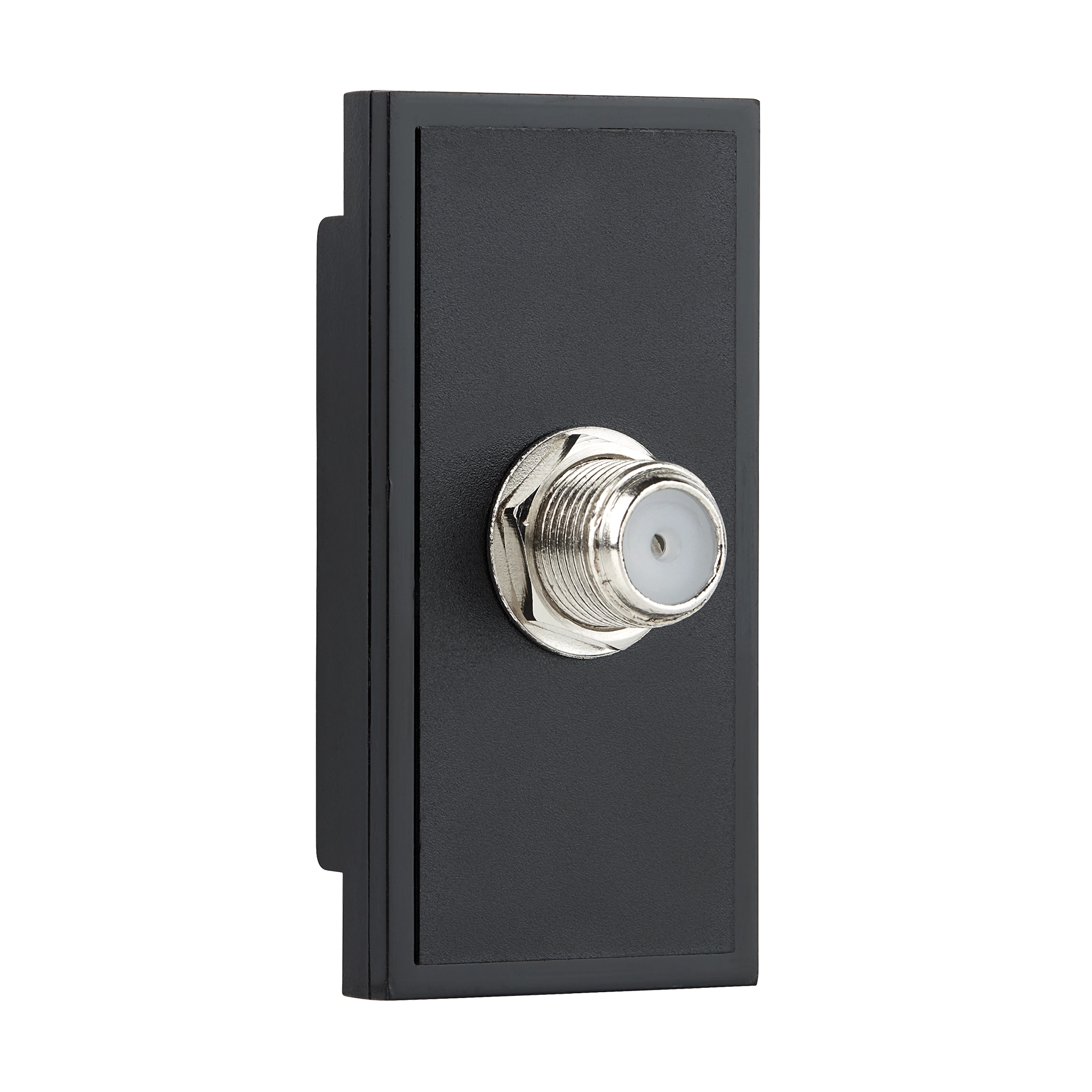 This minimalist circular – port TV shielded Euro outlet module is a modular component designed for structured environments. It features a sleek matte black faceplate with a silver – toned circular port, offering a modern and functional look. With a design suitable for flush mounting, it can be used either as a locking mechanism or a connector.