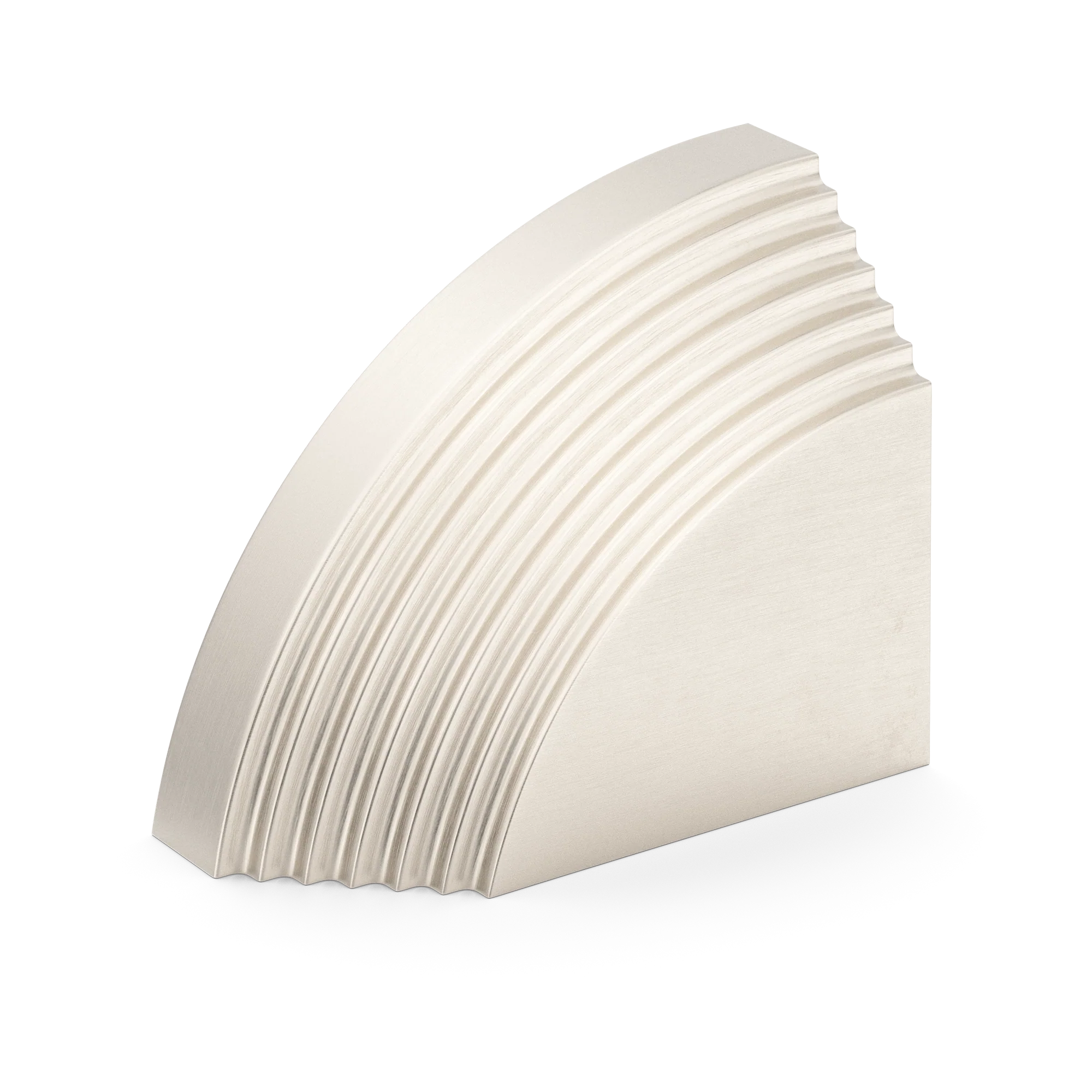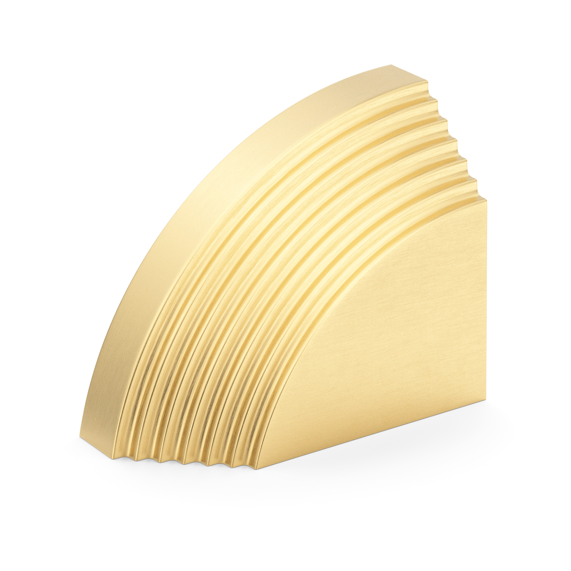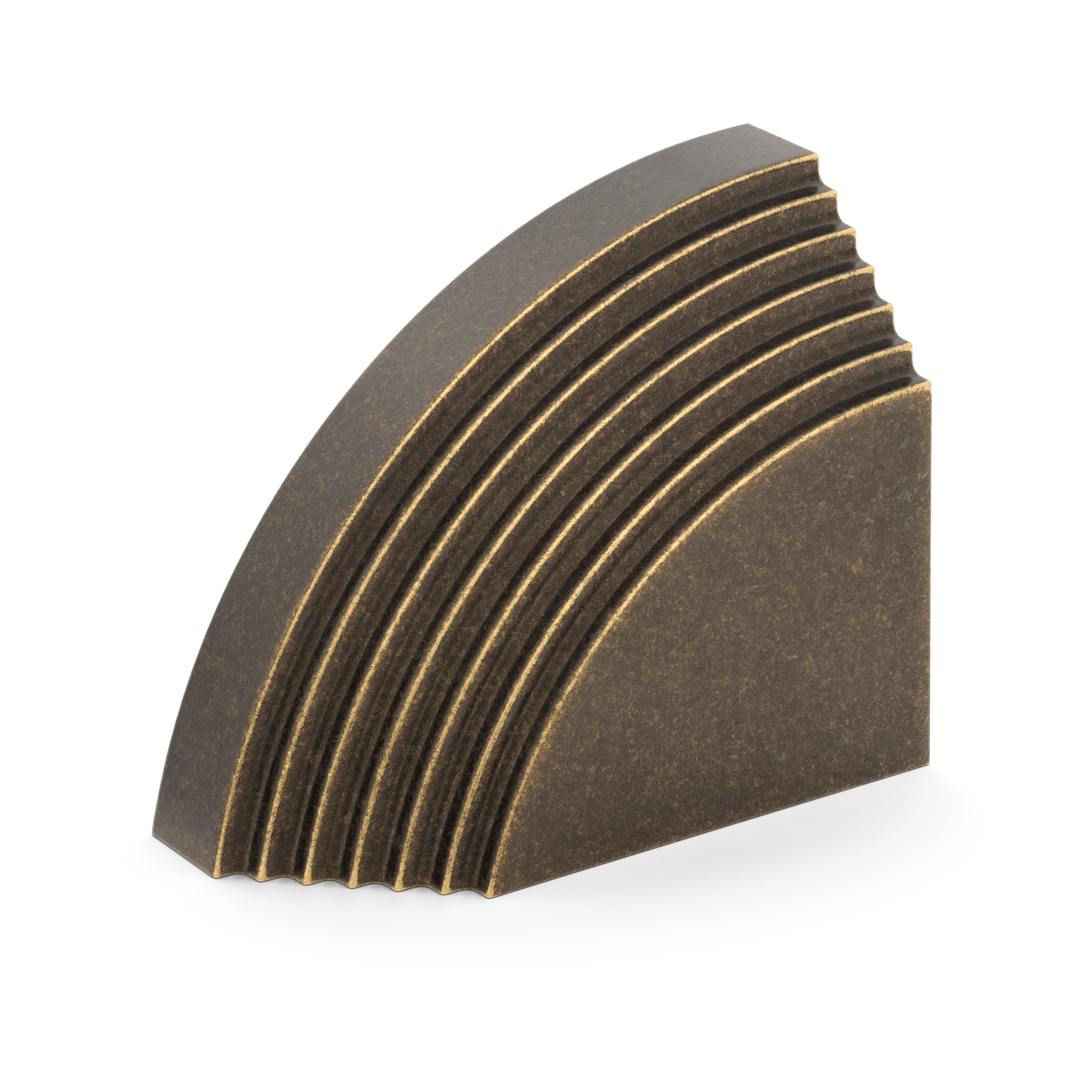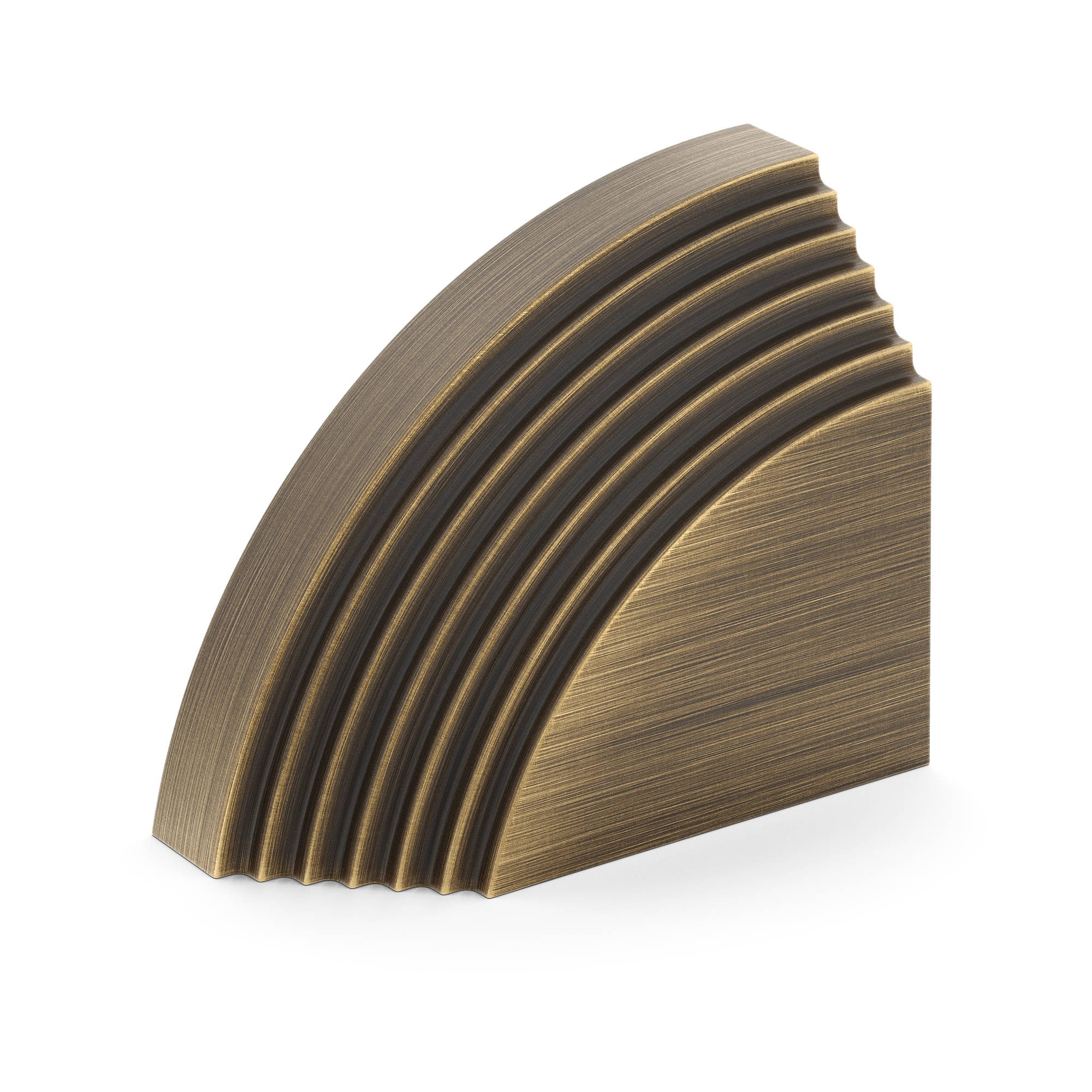 This architectural decorative trim piece offers a stylish addition to doors, cabinetry, or wall corners. Crafted from metal with a range of warm and cool metallic tones, it features a quarter – circle arc with evenly spaced parallel grooves, inspired by Art Deco design. The flat rectangular base provides stability, and it can be paired for a symmetric look.