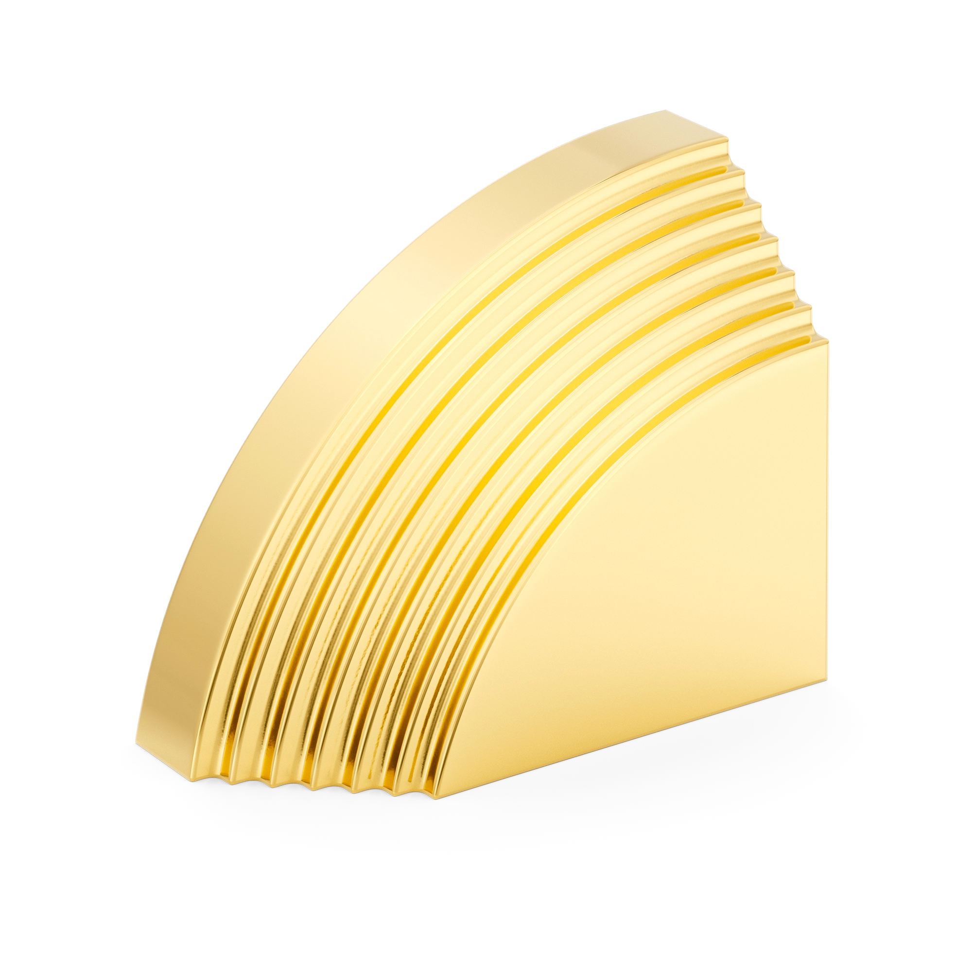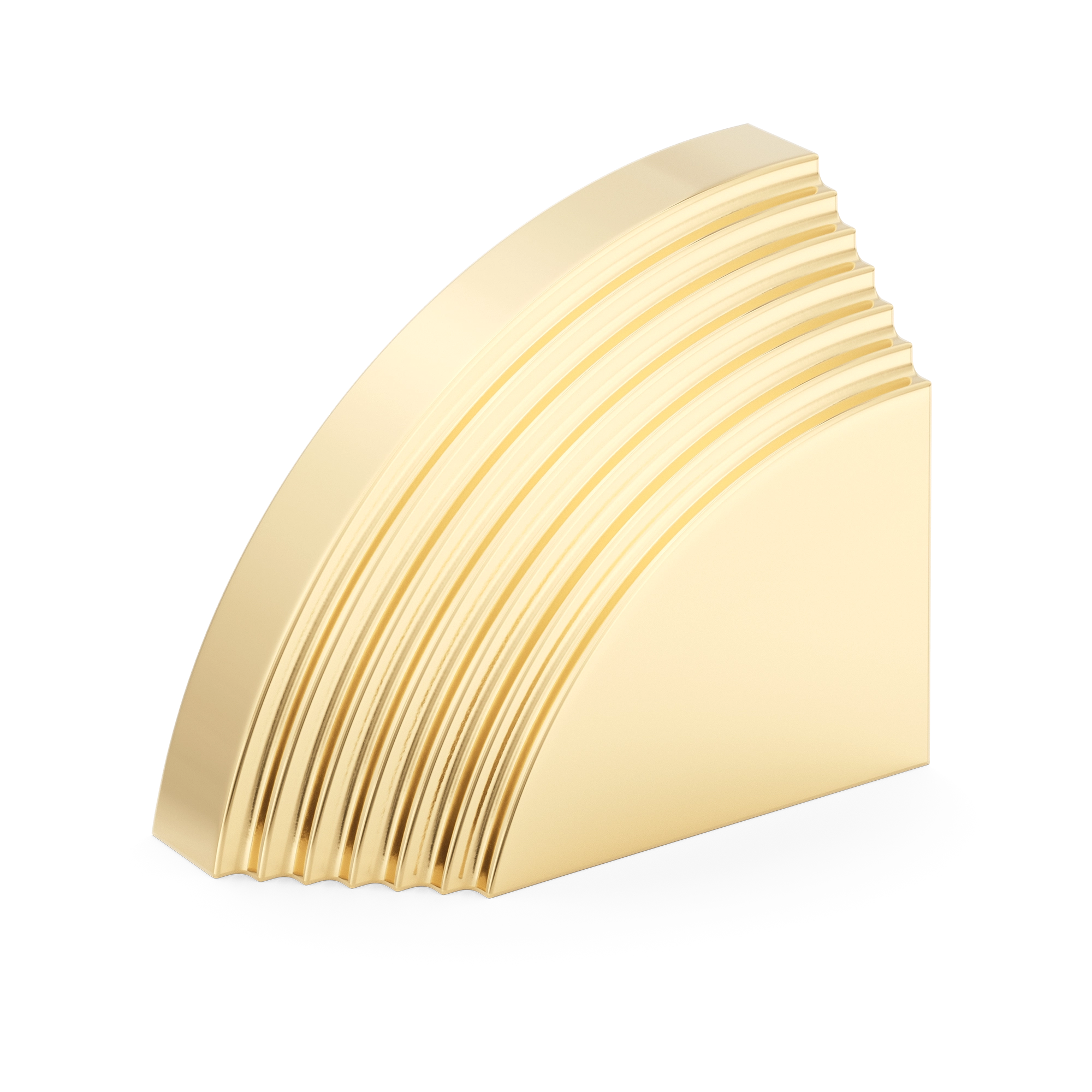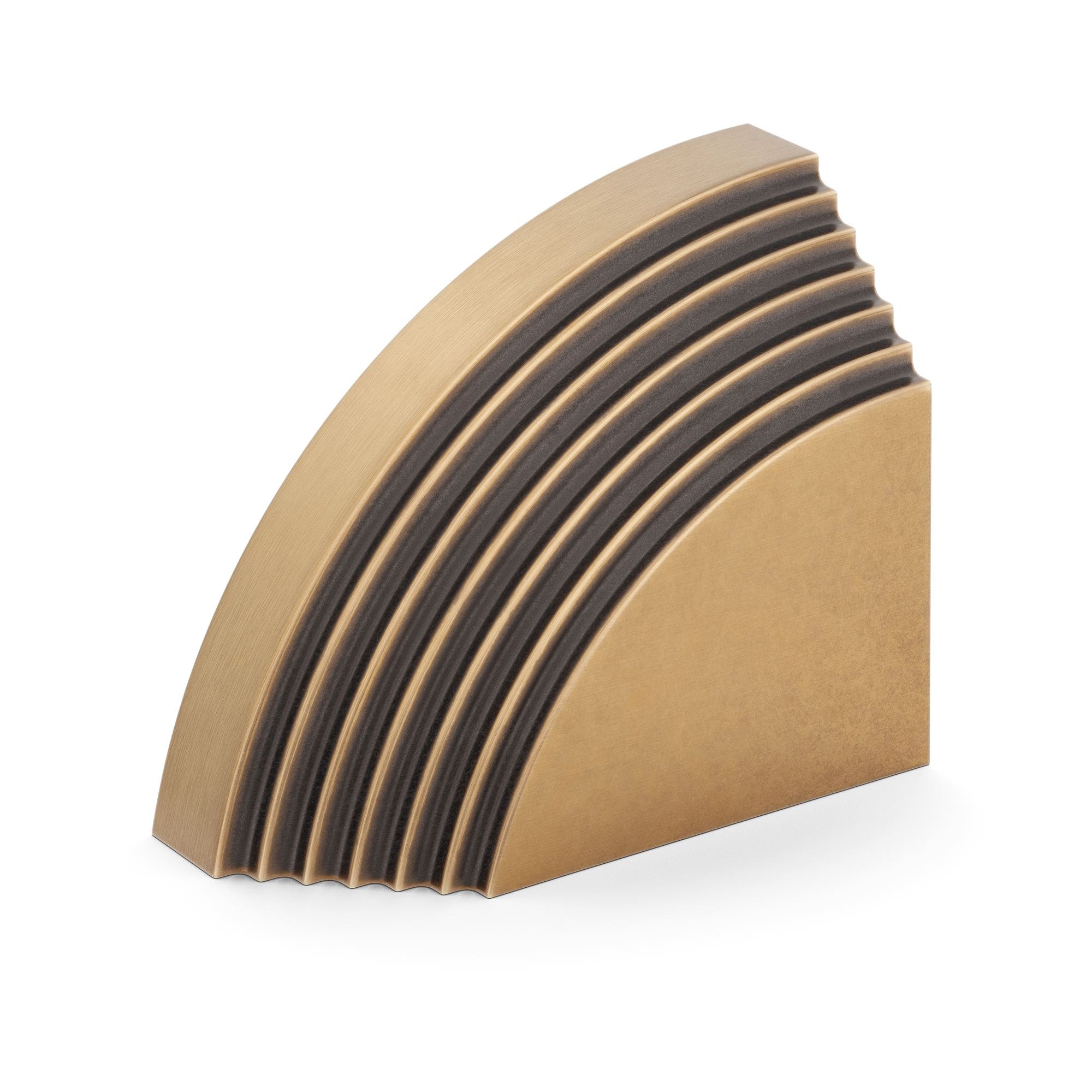This architectural decorative trim piece offers a stylish addition to doors, cabinetry, or wall corners. Crafted from metal with a range of warm and cool metallic tones, it features a quarter – circle arc with evenly spaced parallel grooves, inspired by Art Deco design. The flat rectangular base provides stability, and it can be paired for a symmetric look.
