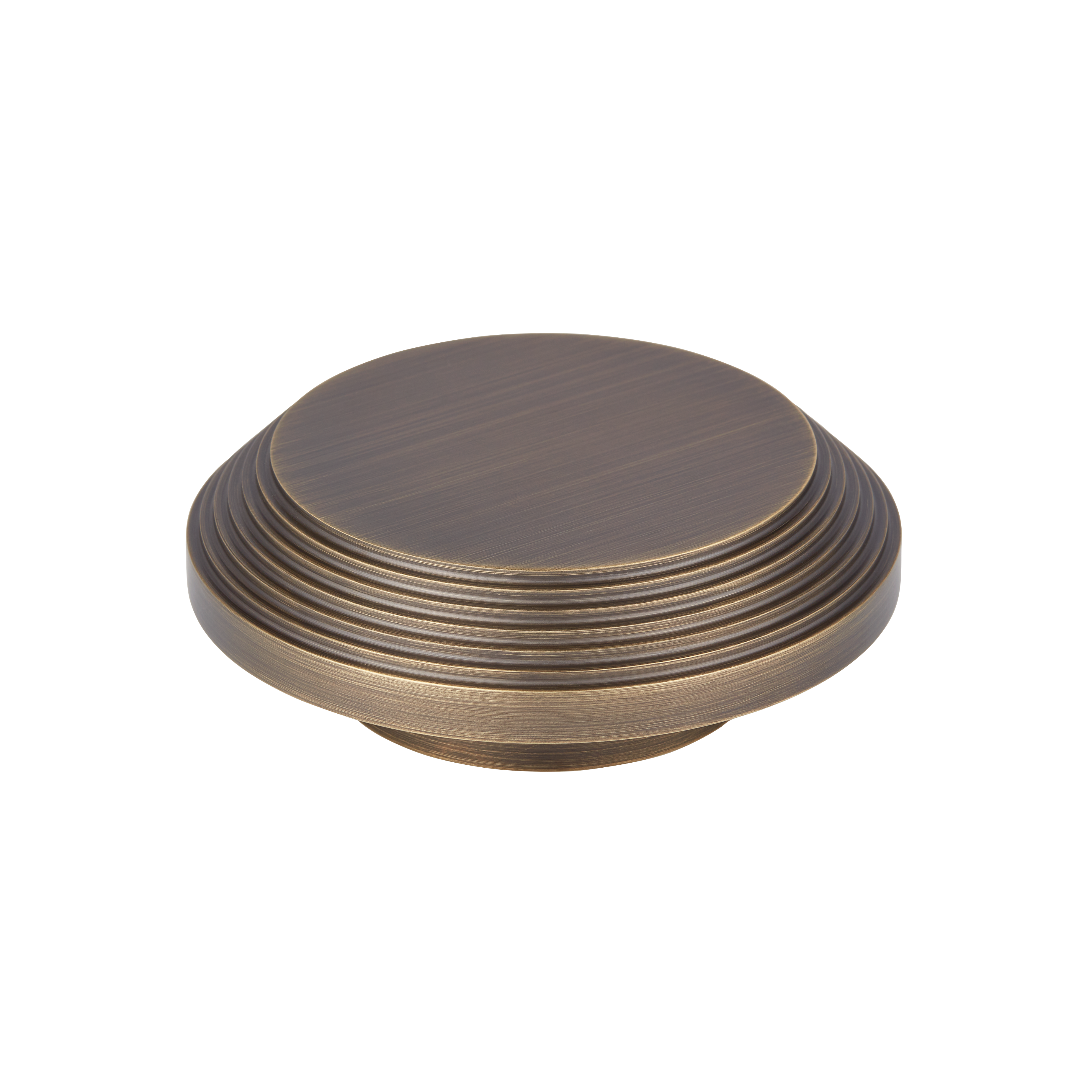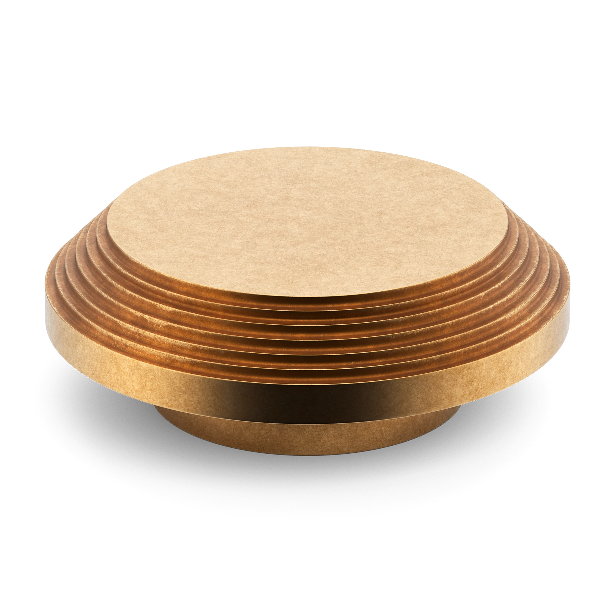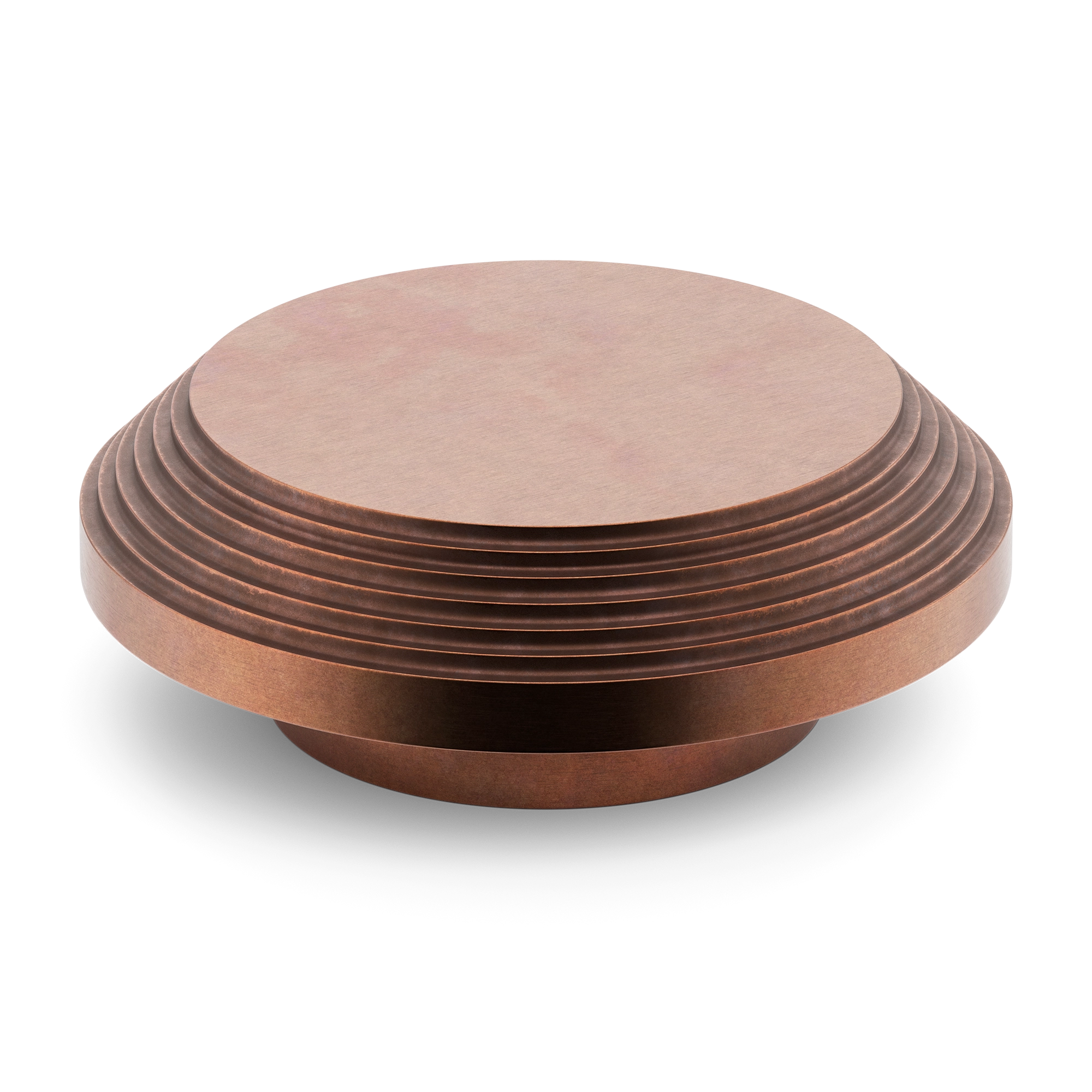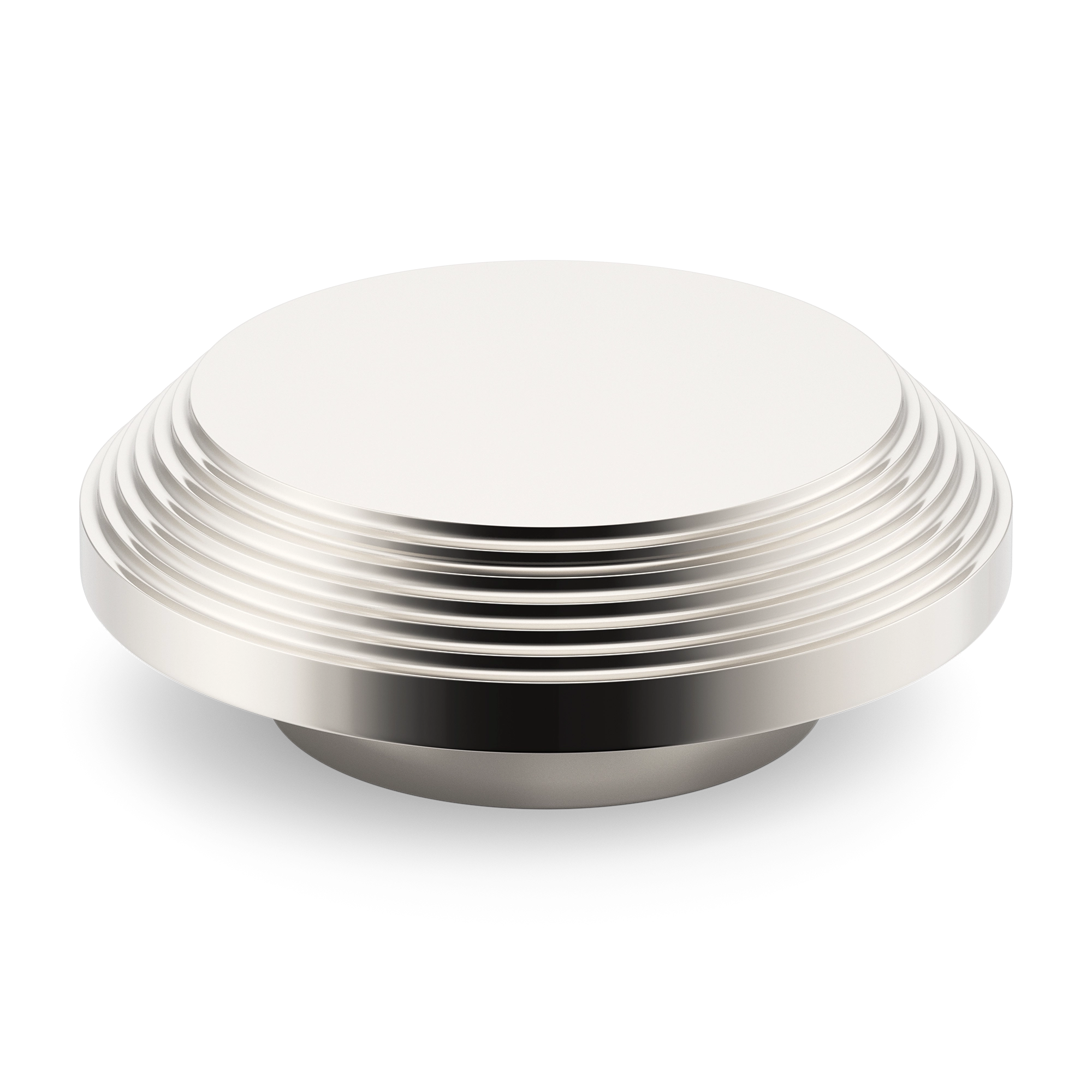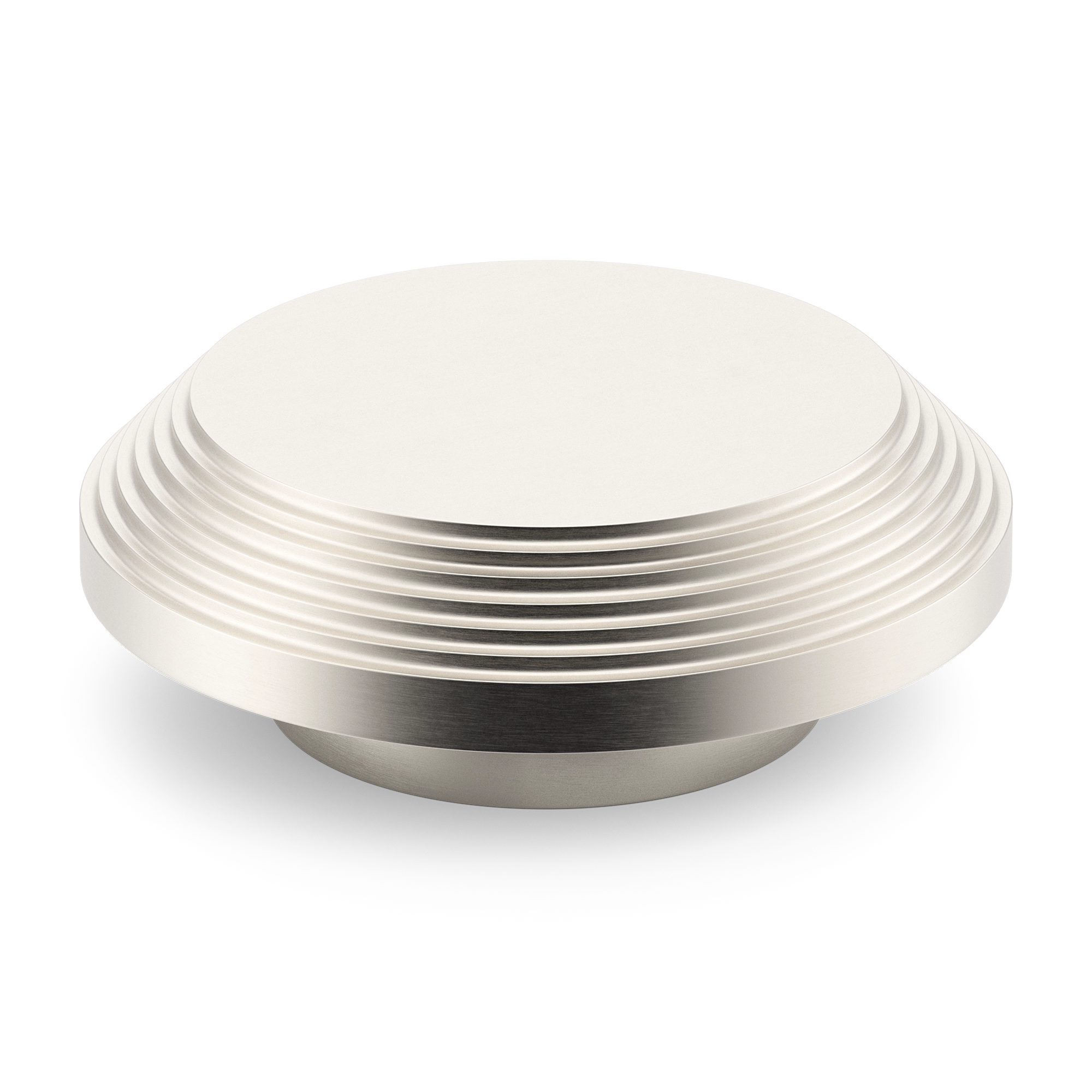 This stepped circular metal display stand features a symmetrical, concentric design with a flat top, stepped ring layers, and a rounded cylindrical base. It is crafted from metal and comes in a variety of finishes, including polished, brushed, and matte. The stand’s multi – tiered structure is ideal for showcasing small items or serving desserts.